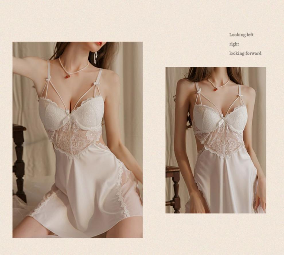 Pijama Sexy Acolchado para Mujer con Almohadillas en el Pecho Push-up Tentación Seda de Hielo Camisón con Tirantes Encaje Hermosa Espalda Camisón de Alta Gama