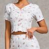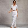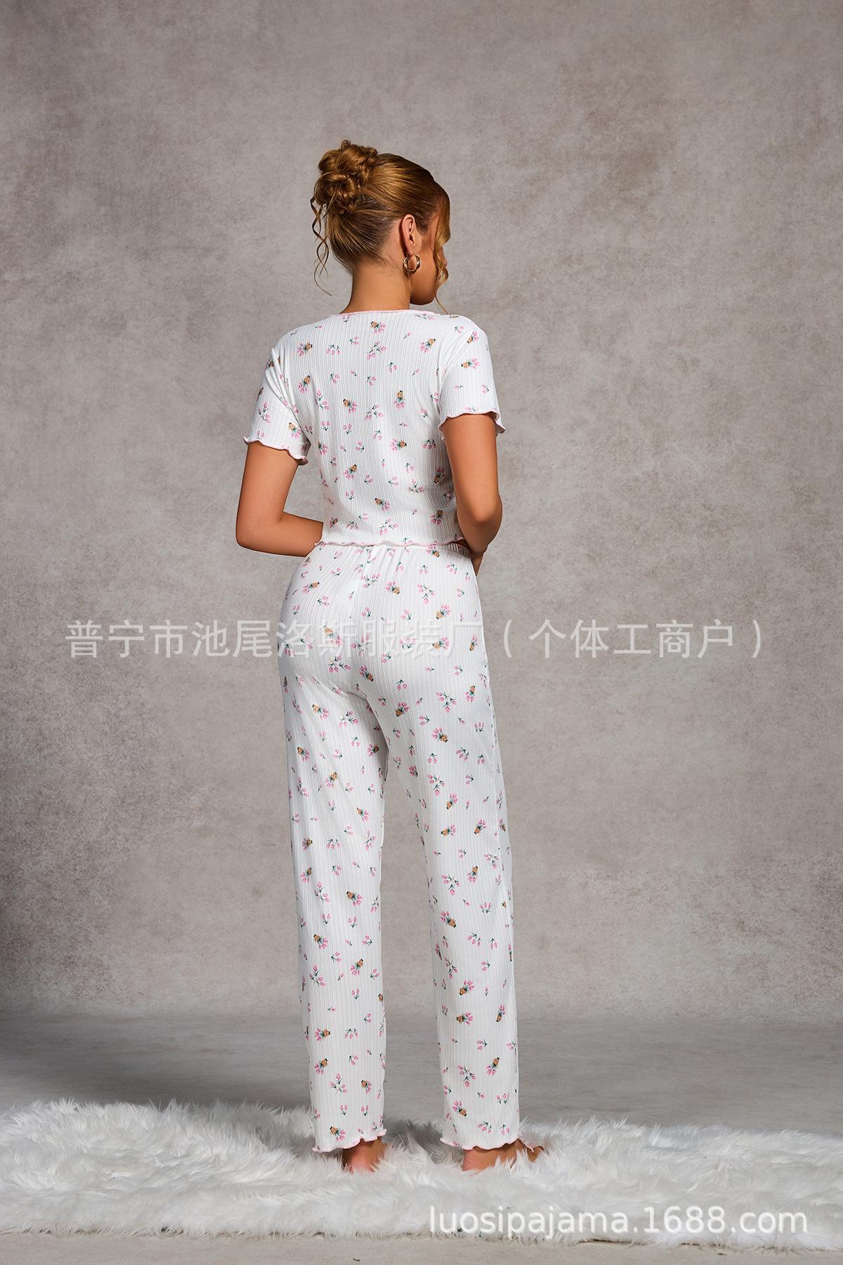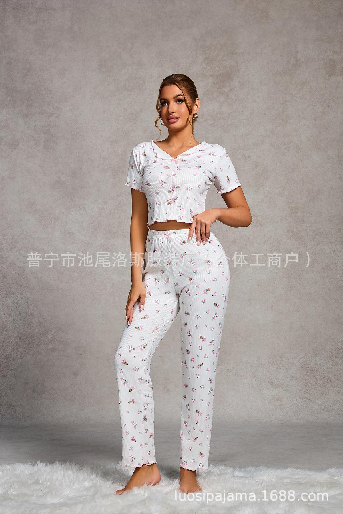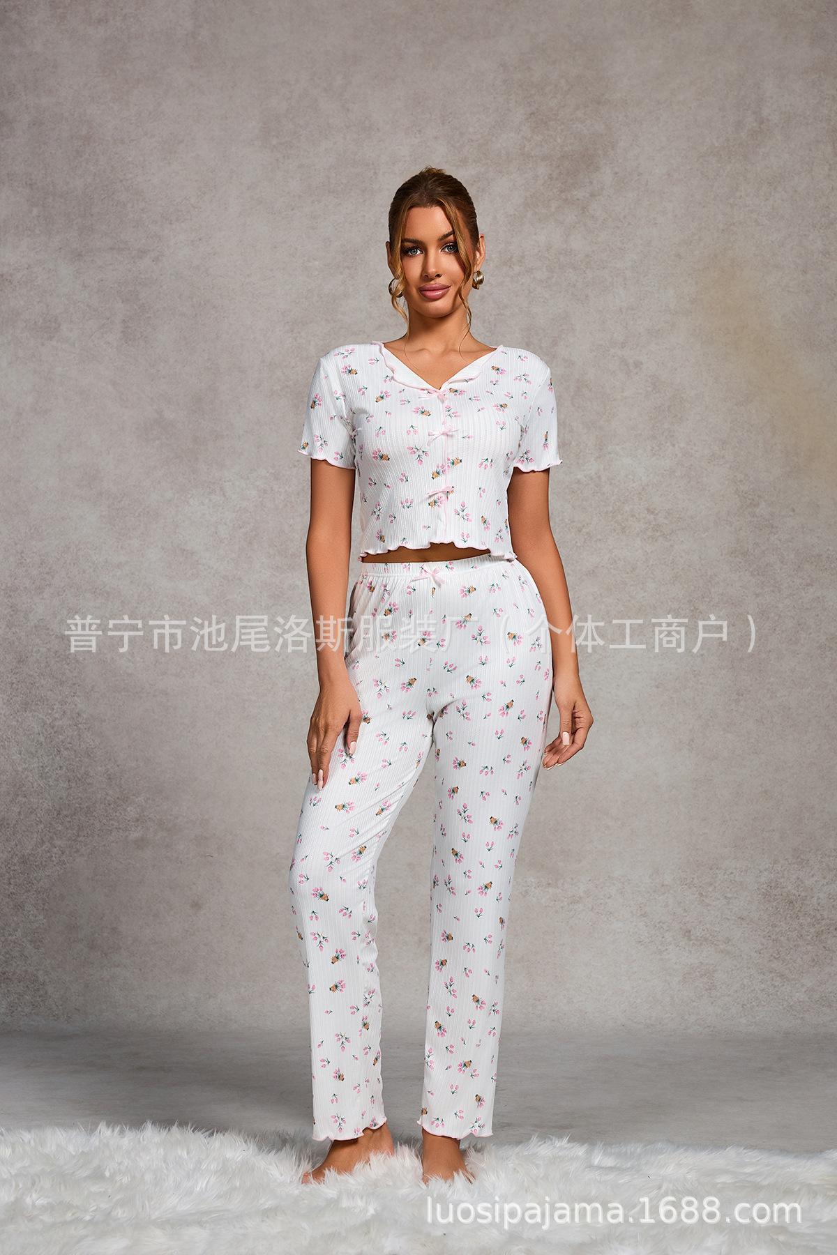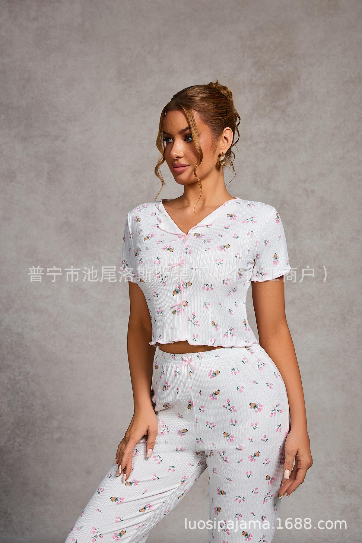 Pijamas de Verano Transfronterizos Europeos y Americanos Novedad para Mujer Solapa con Lazo Manga Corta Pantalones Moda Casual Ropa para el Hogar Conjunto de Dos Piezas