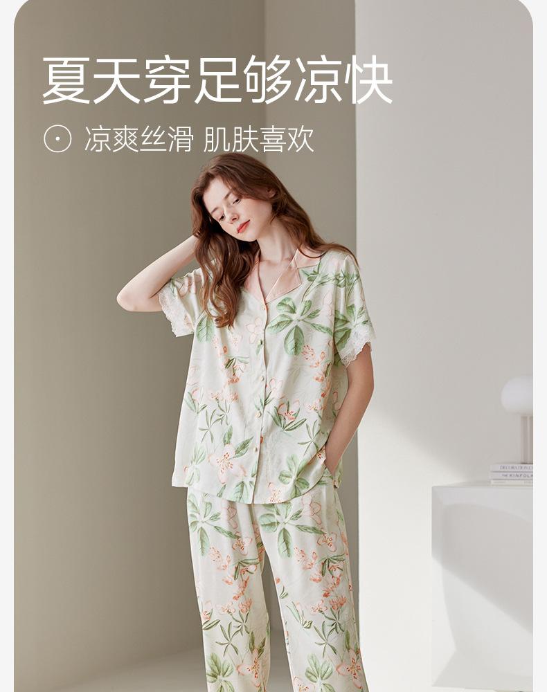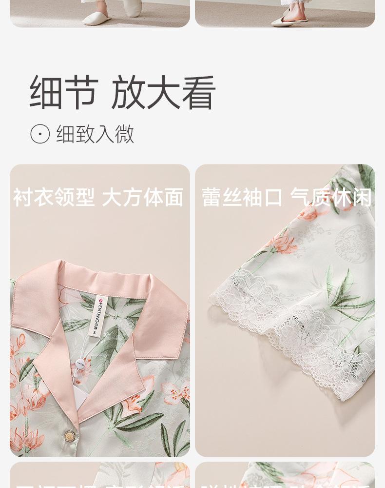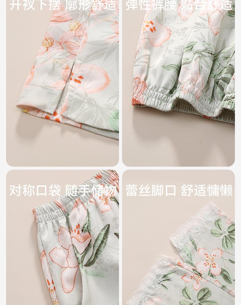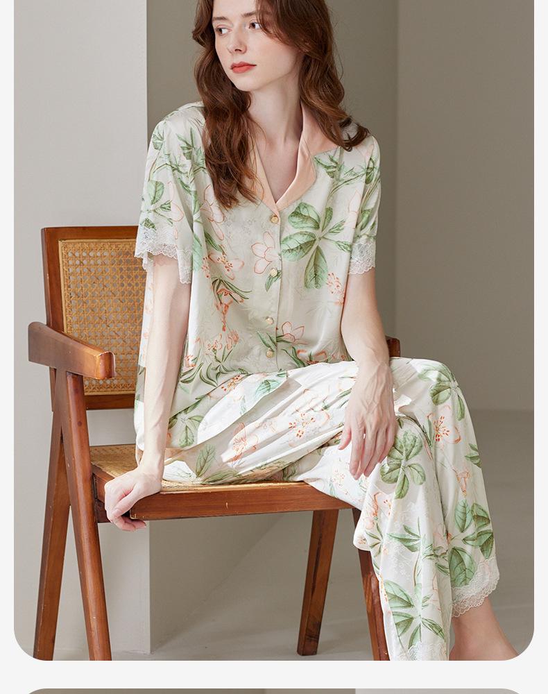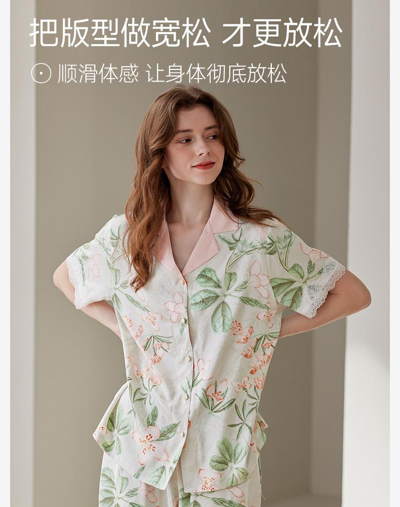 [Seda de Hielo] Pijama de Verano para Mujer Set de Manga Corta de Seda de Hielo Encaje Floral de Alta Gama Holgado Casual Ropa para el Hogar