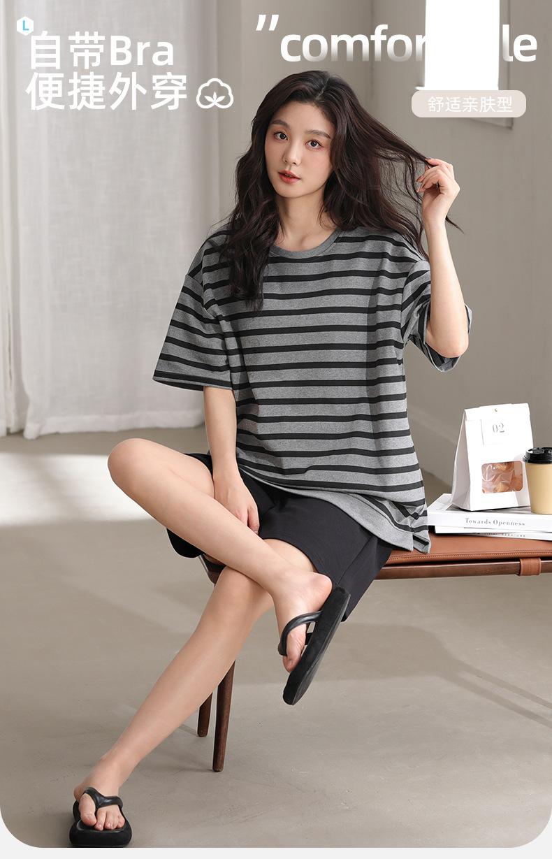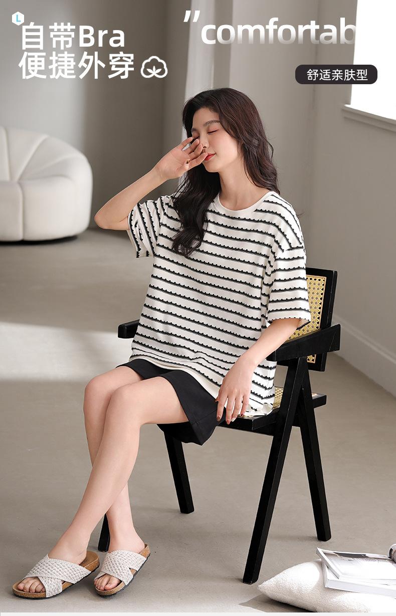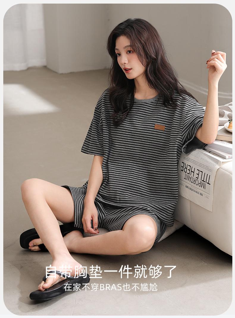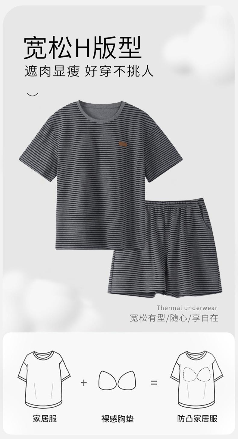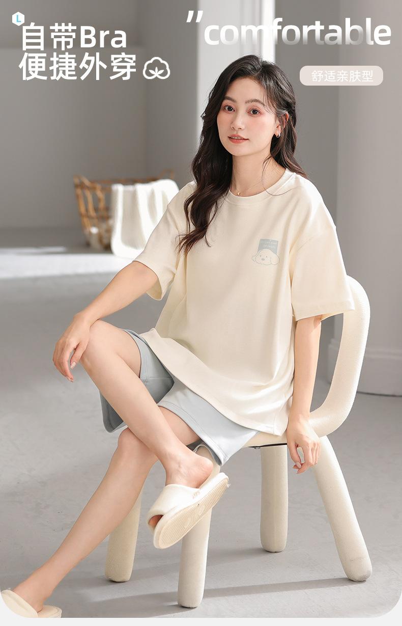 Pijama de Cuello Redondo para Mujer Verano Algodón Manga Corta Shorts con Almohadilla en el Pecho Enterizo Delgado para Niña Antigolpes Ropa de Casa para Uso Exterior