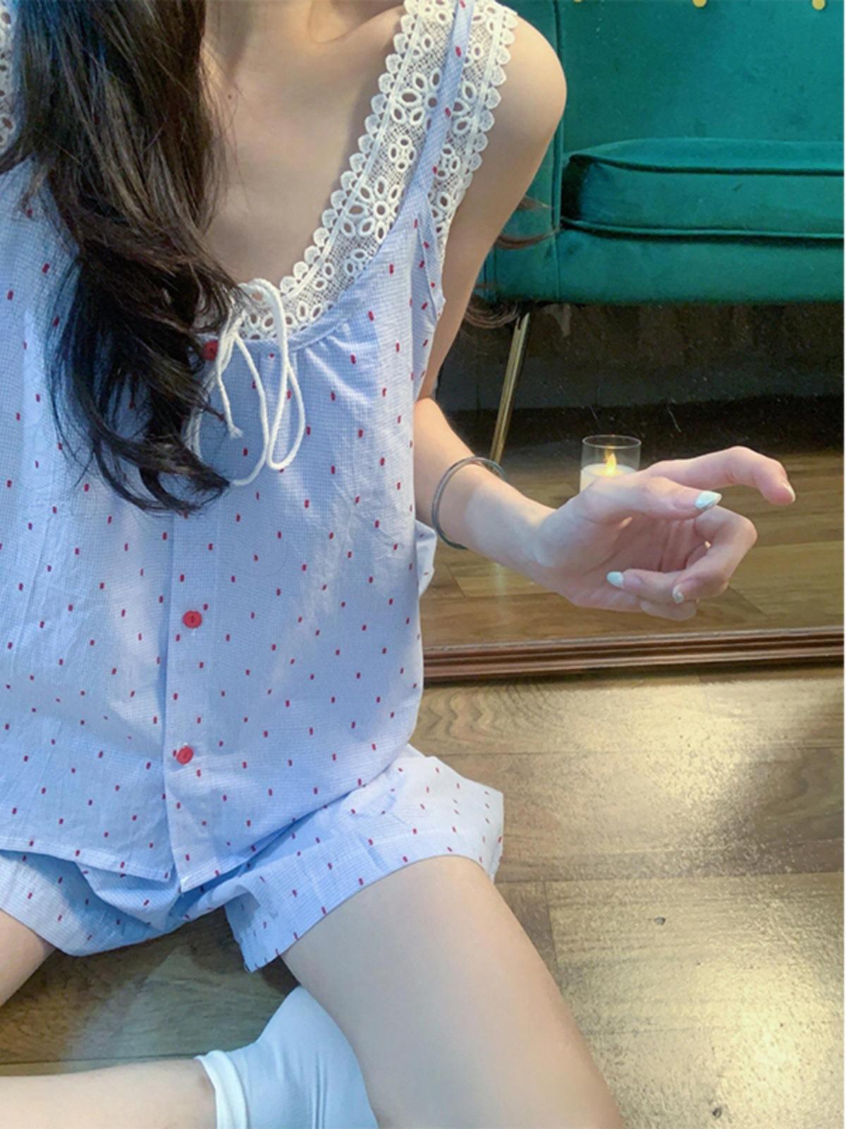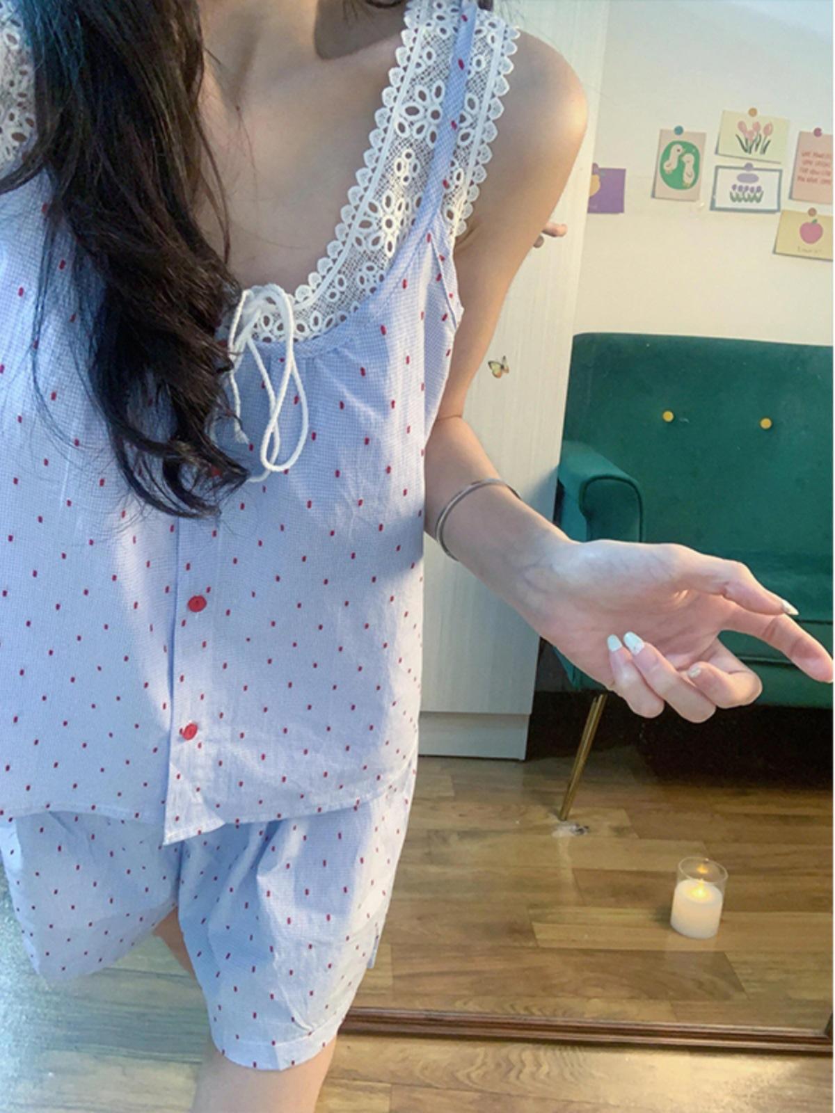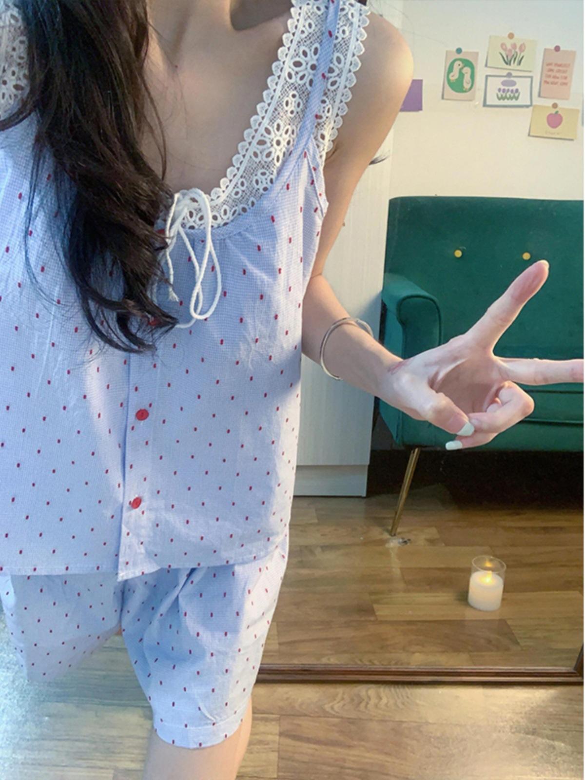 Pijama de encaje con estampado de lunares y ondas para niña, conjunto de dos piezas para mujer, primavera y verano, nuevo estilo, para el hogar