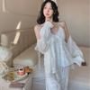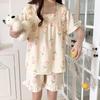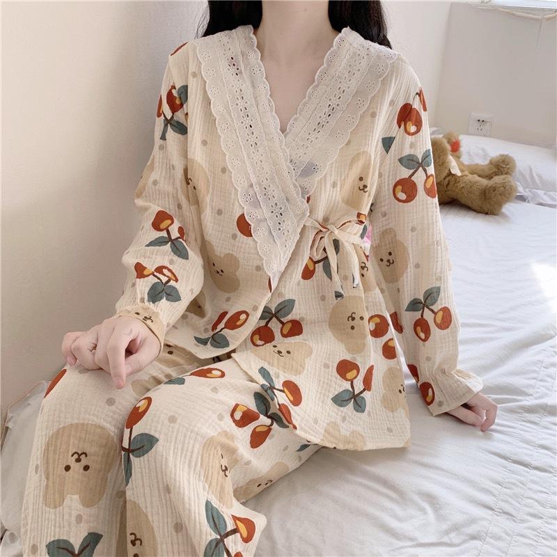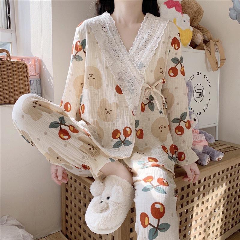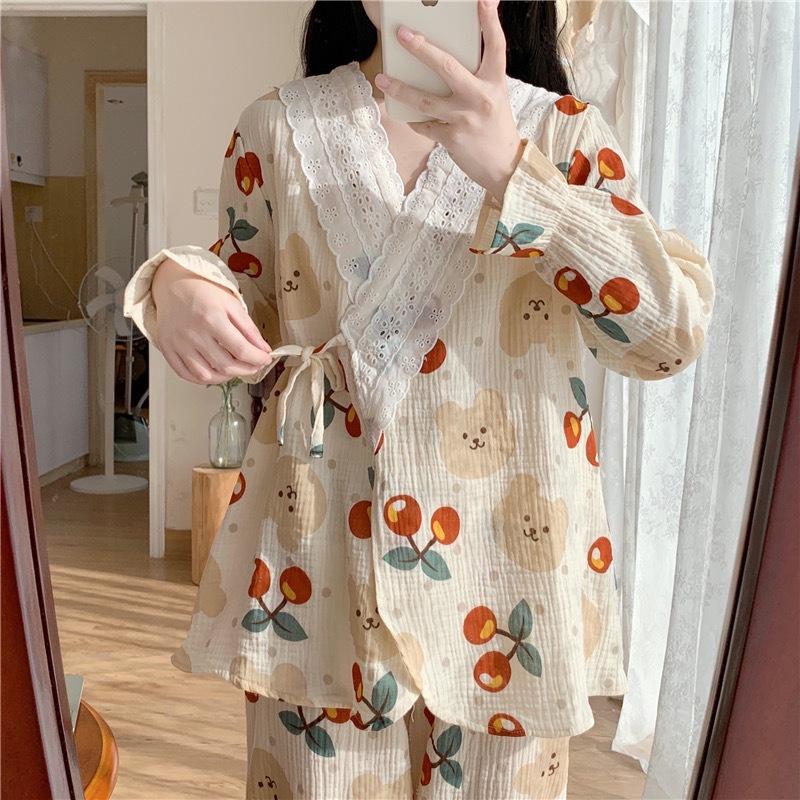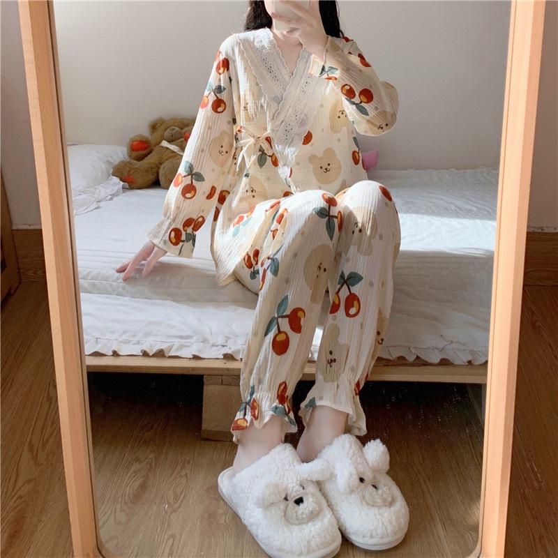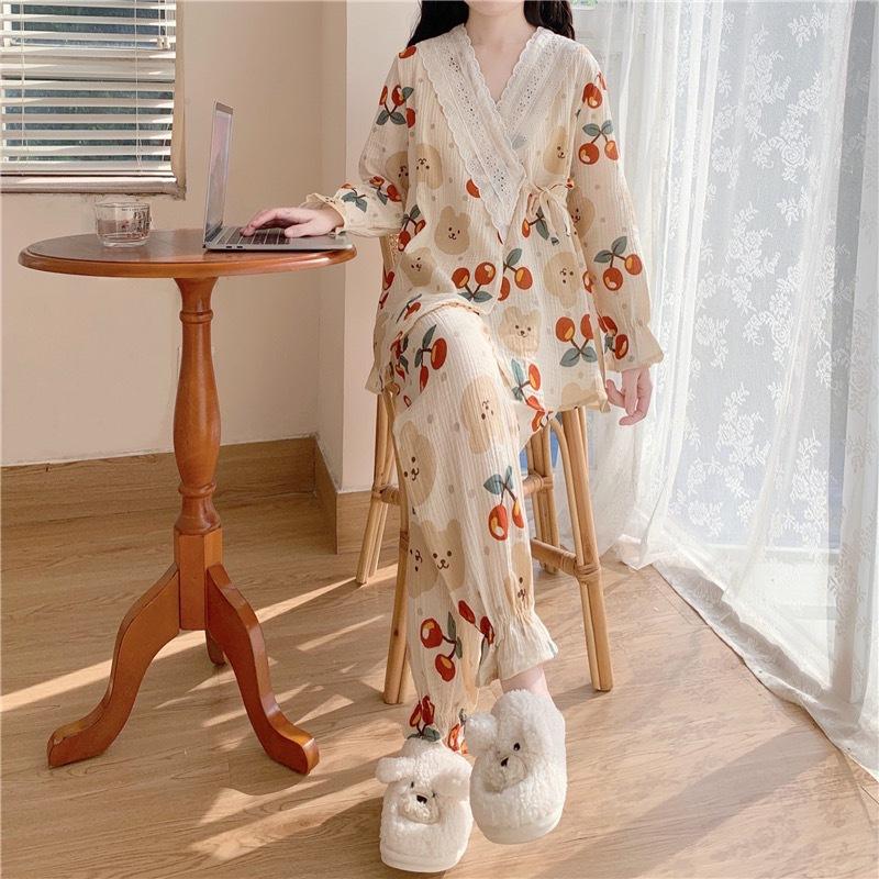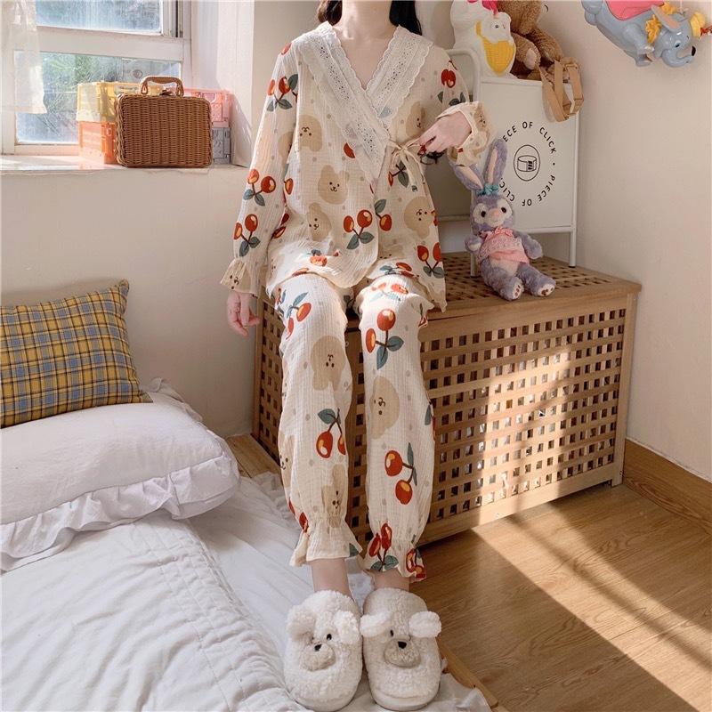 Pijamas de mujer de primavera y otoño, nuevo estilo francés, con encaje de oso y cereza, bonito y dulce, de manga larga, para el hogar.
