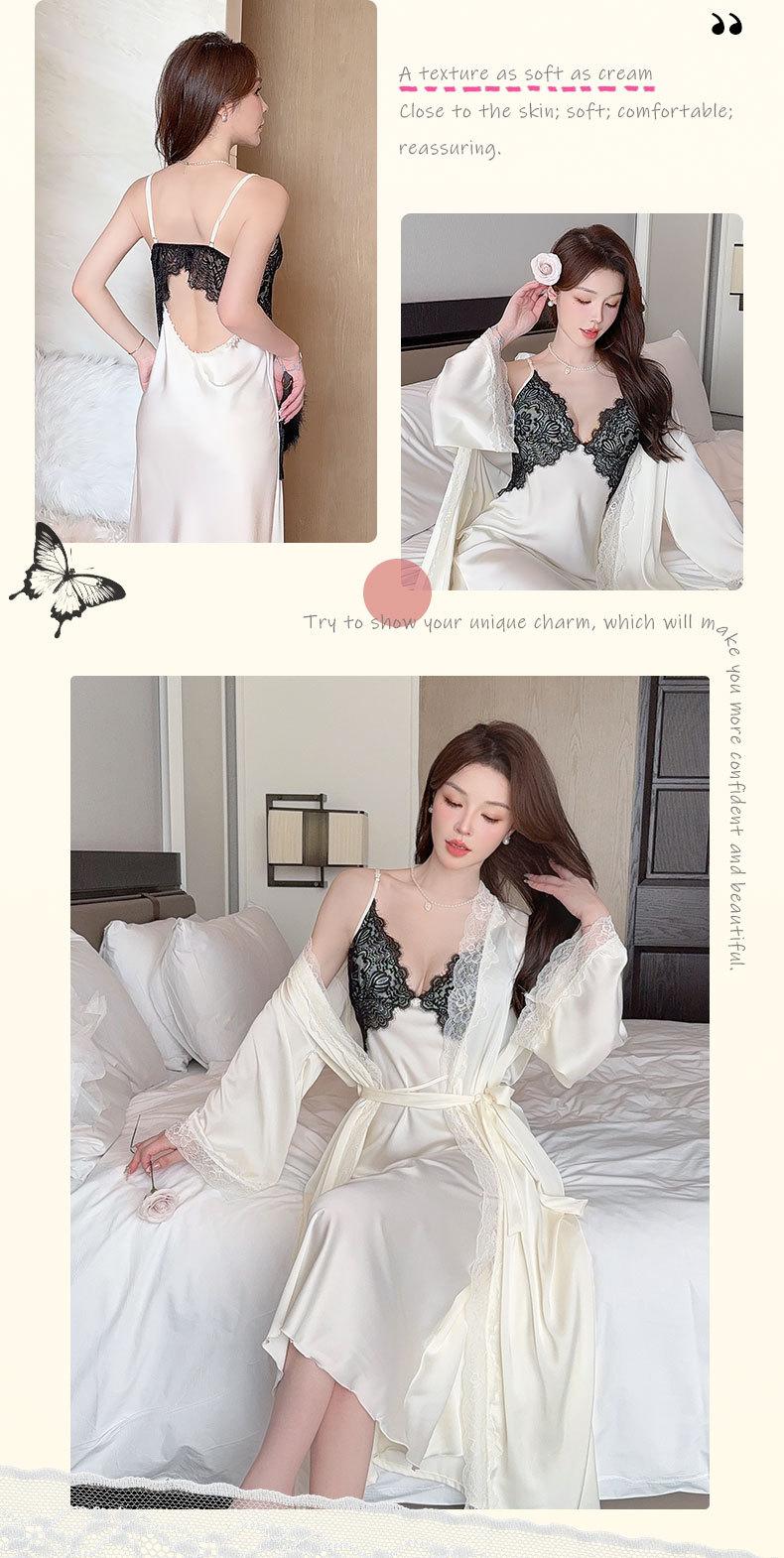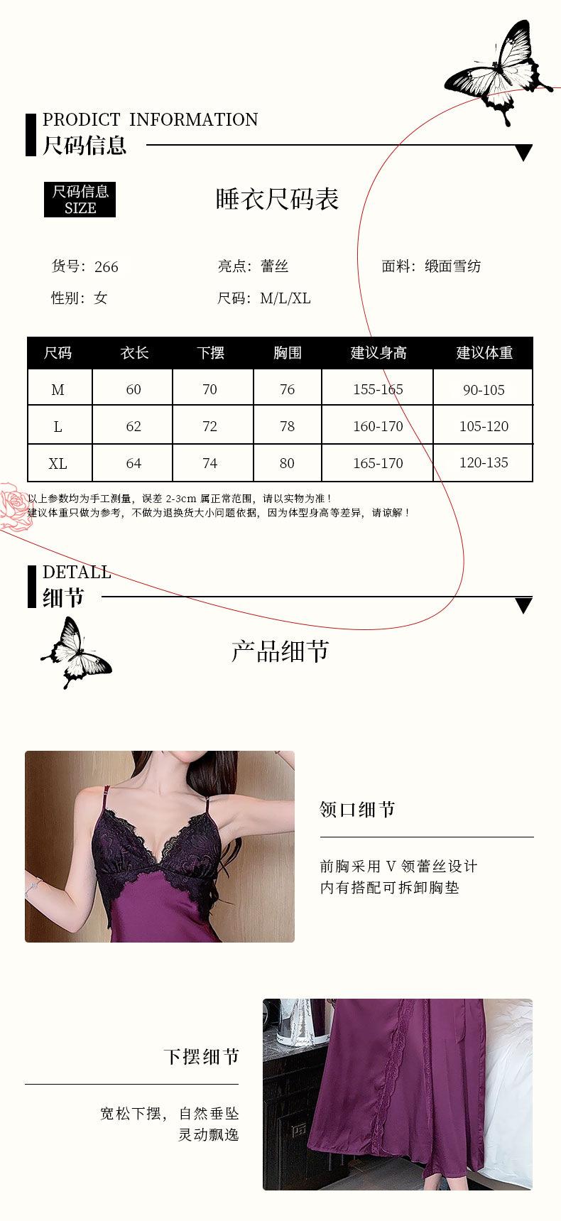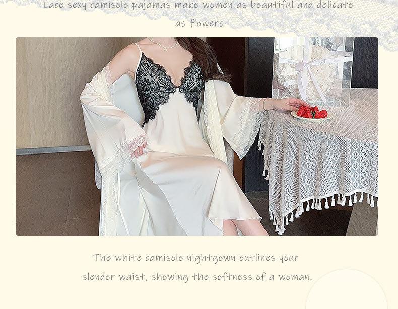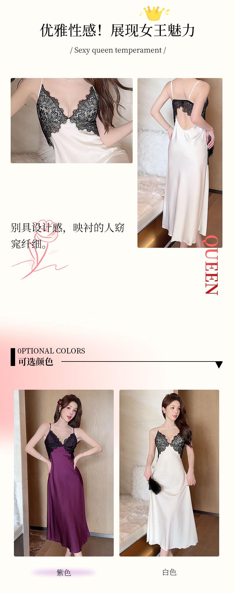 Camisón francés con copas para el busto, Seda de hielo, Alta gama, Sexy camisón de encaje con tirantes y espalda descubierta en V profunda, Estilo lujurioso puro falda larga
