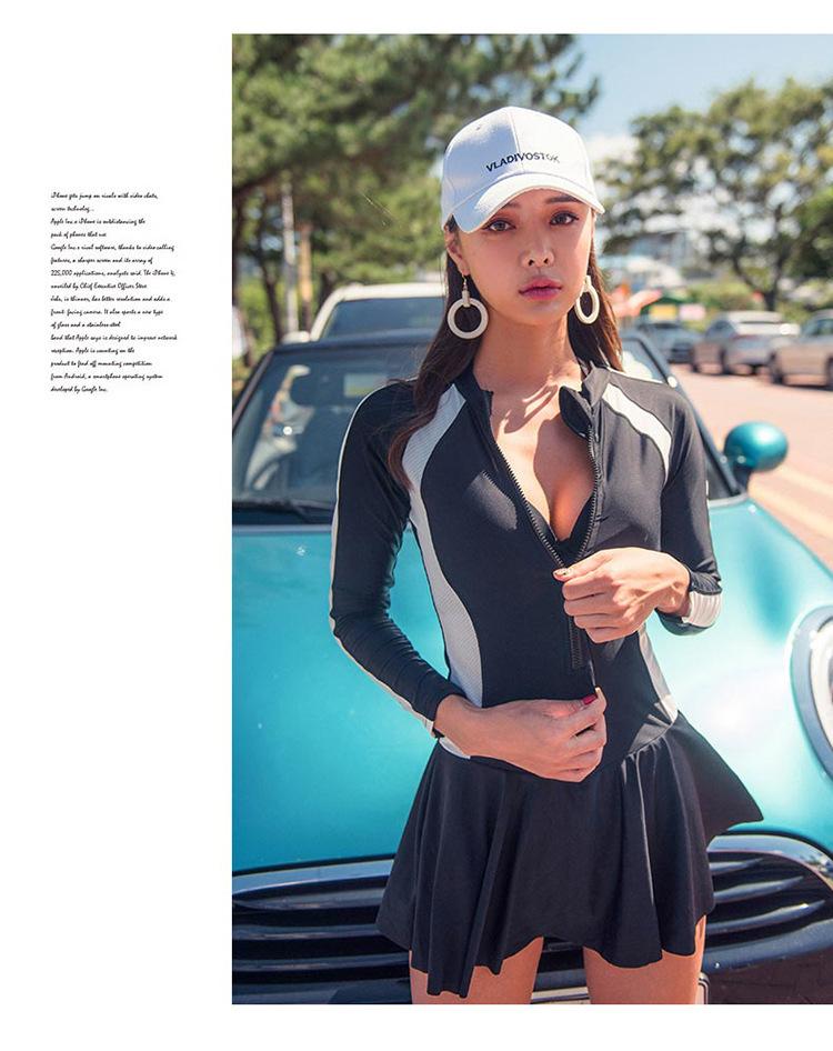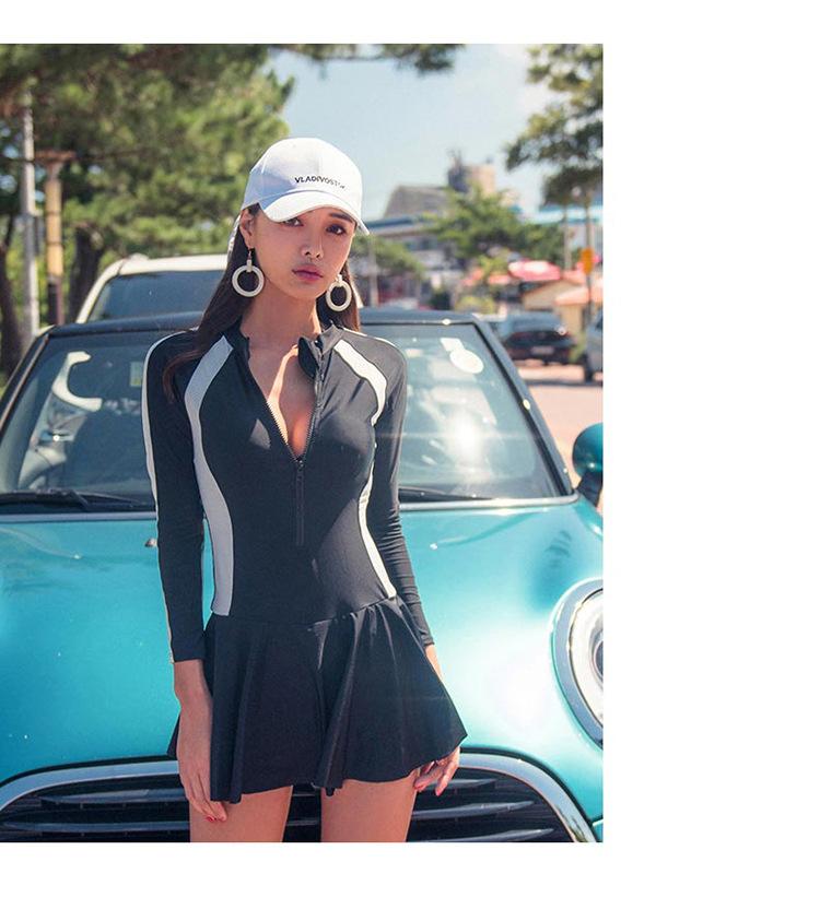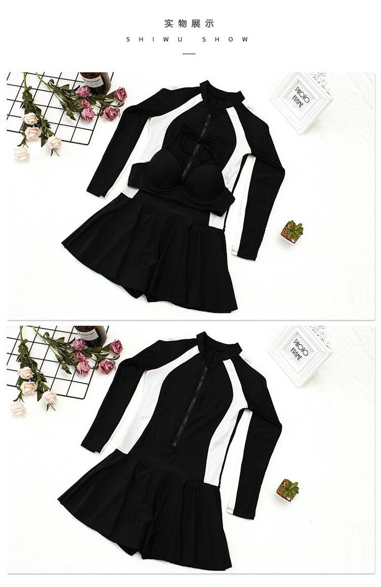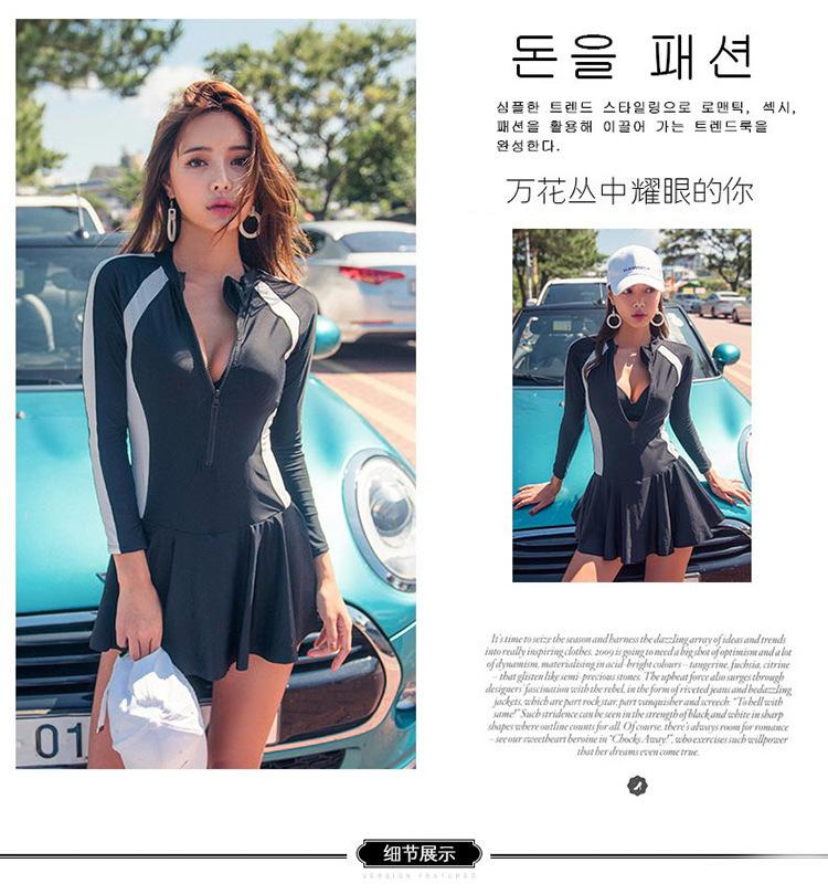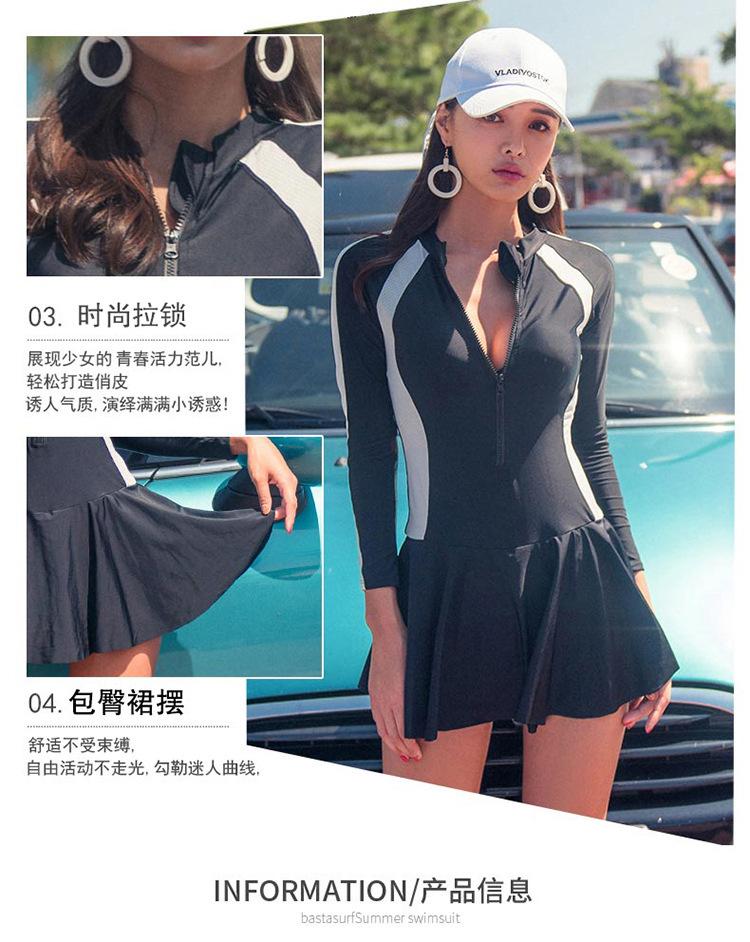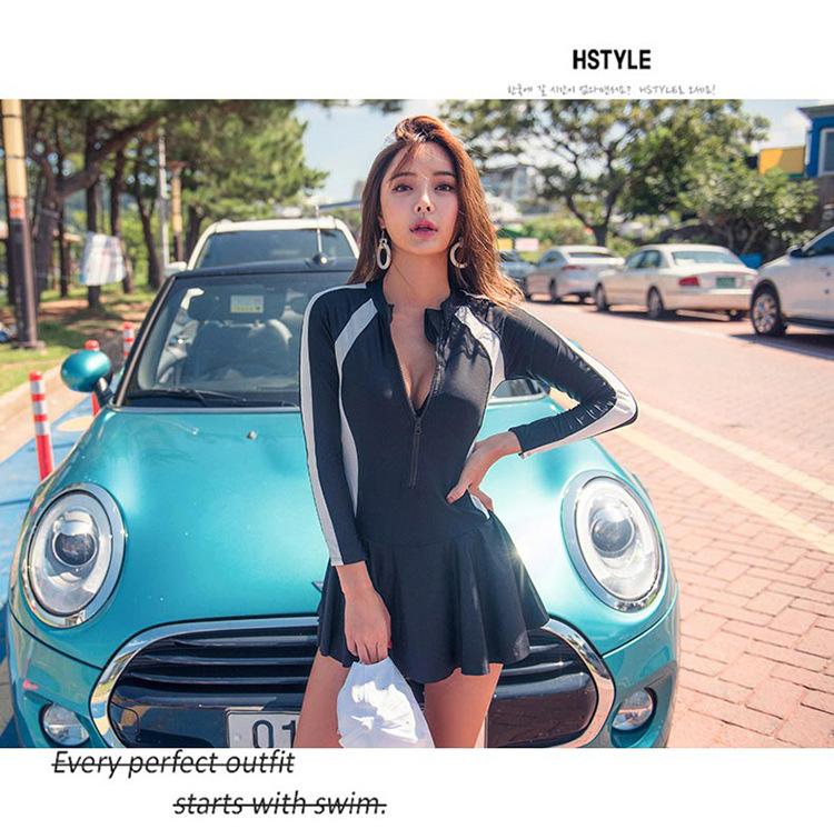 Traje de baño deportivo de moda para mujer, de manga larga, conservador, con falda dividida y corte ajustado.