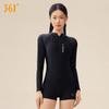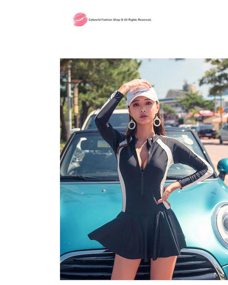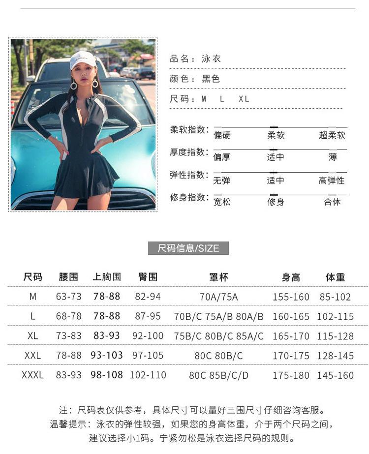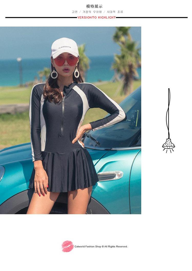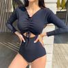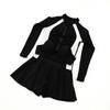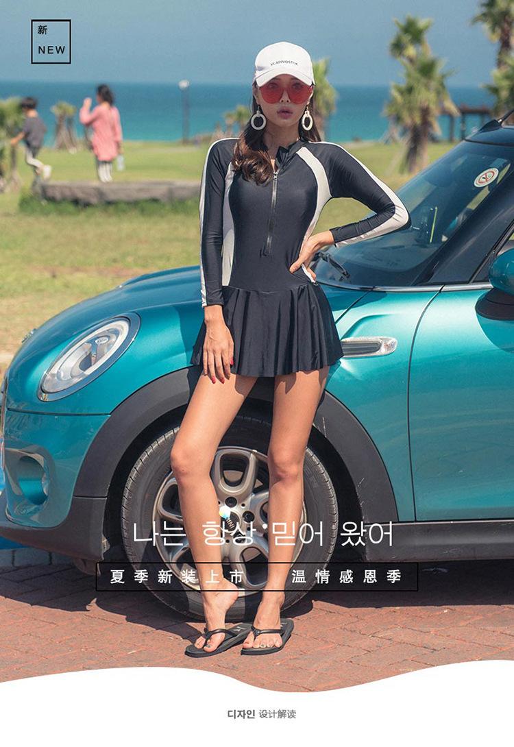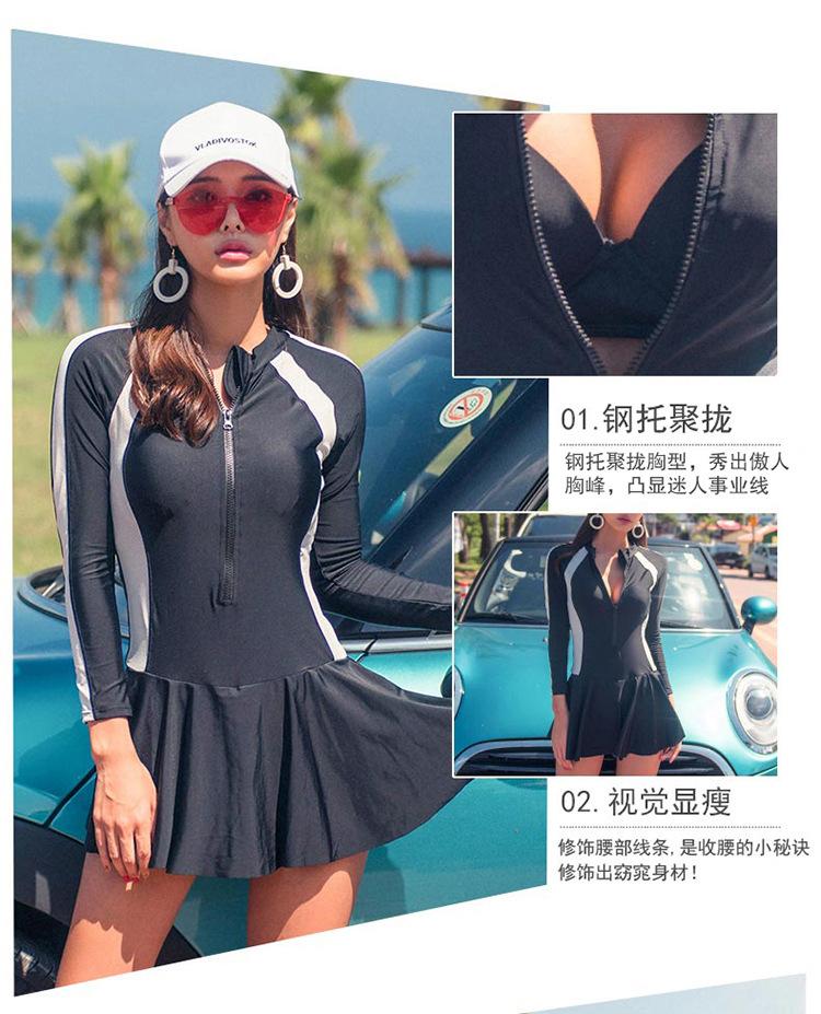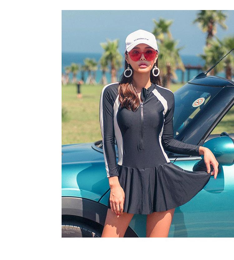 Traje de baño deportivo de moda para mujer, de manga larga, conservador, con falda dividida y corte ajustado.