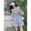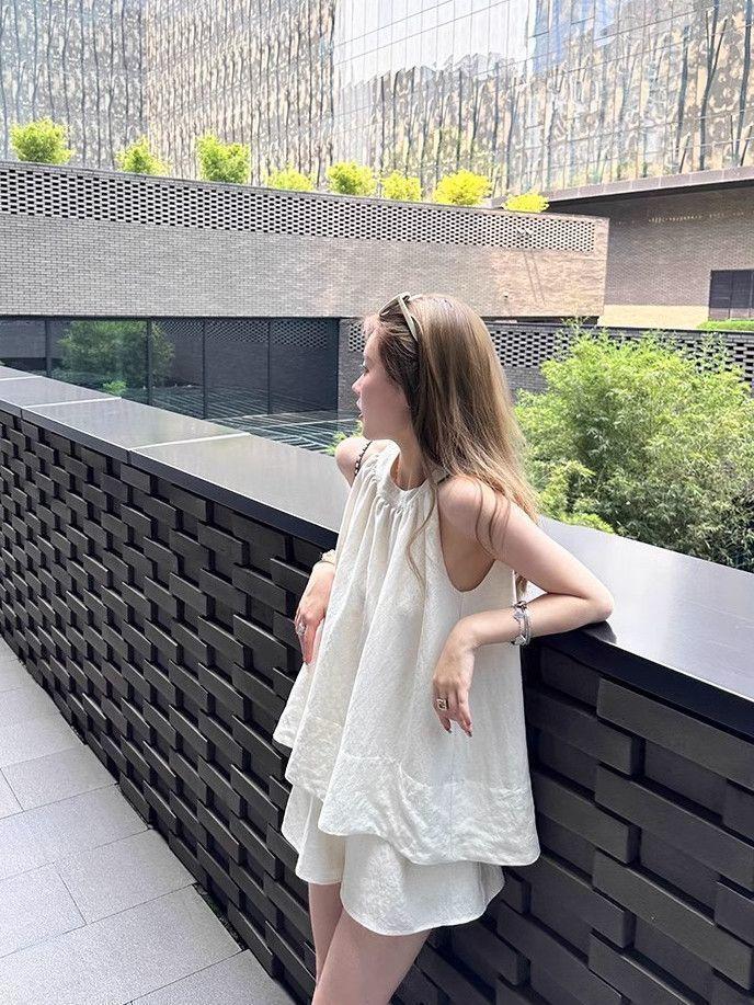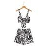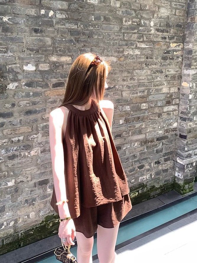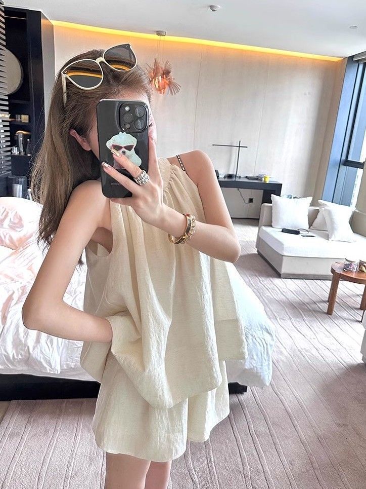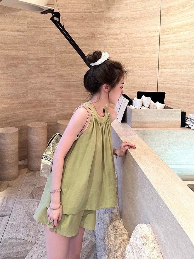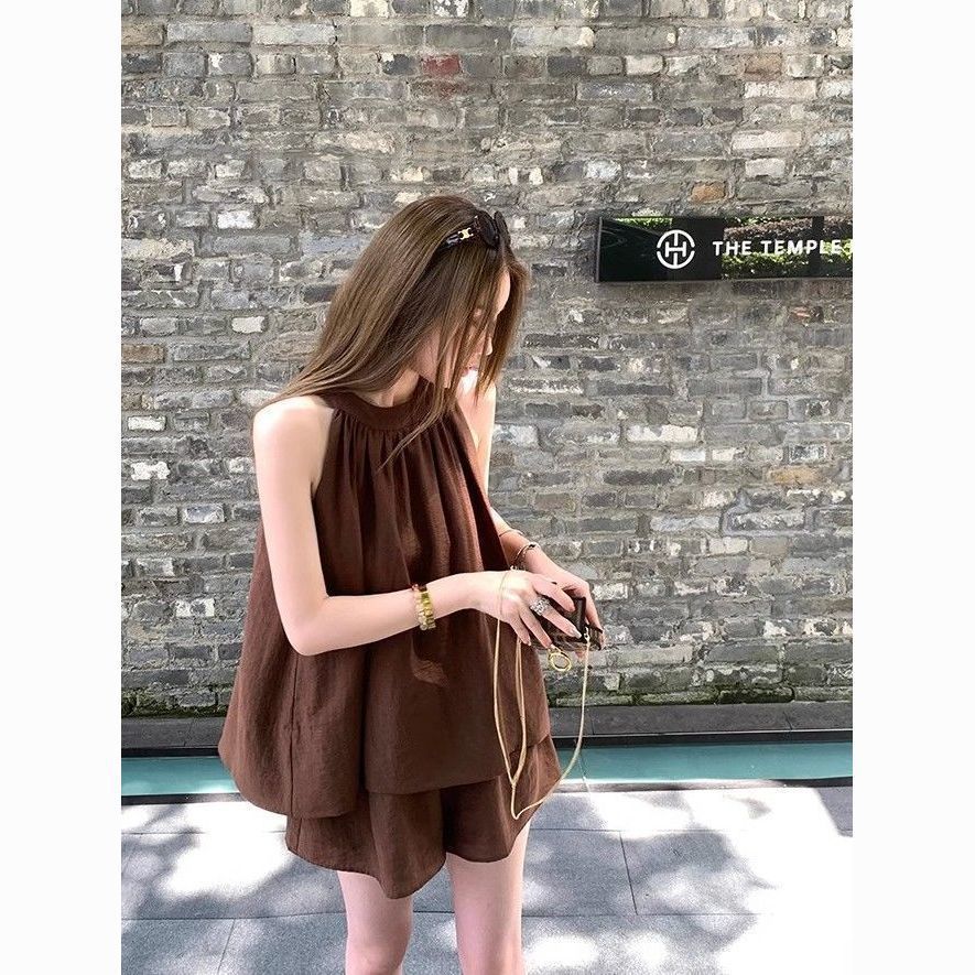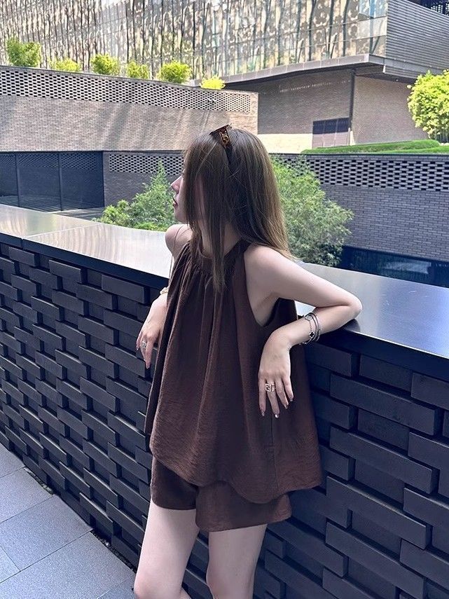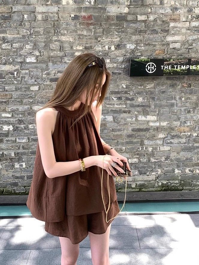 Set de dos piezas de top sin mangas con tirantes finos y cuello halter y shorts. Nuevo de verano. Traje casual moderno que cubre el vientre.
