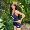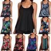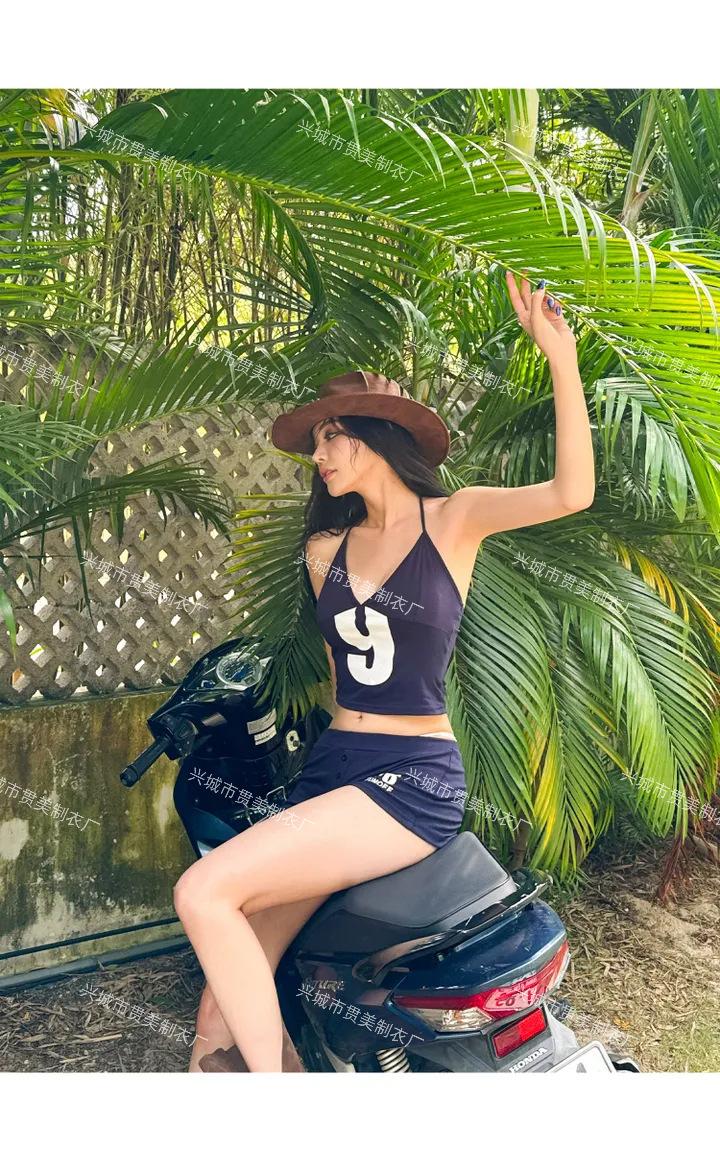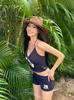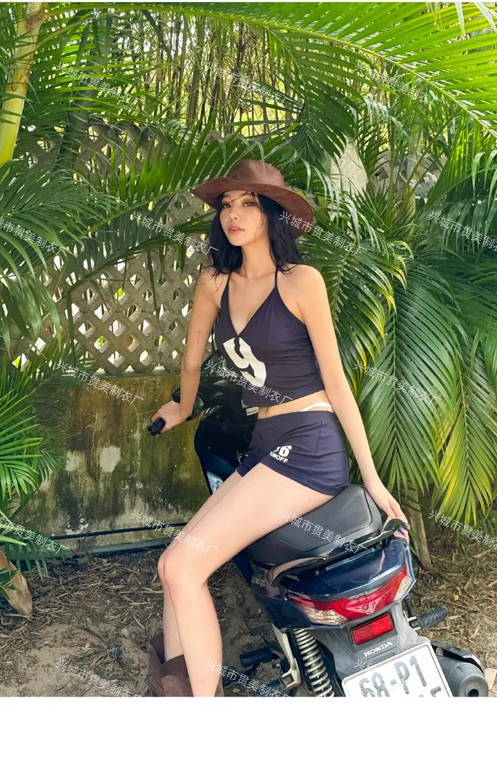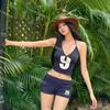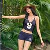 Traje de baño de tres piezas estilo americano Spice Girl, estilo retro, con contraste de colores, ajustado, con tirantes para colgar en el cuello, deportivo, tipo bóxer dividido para mujer.