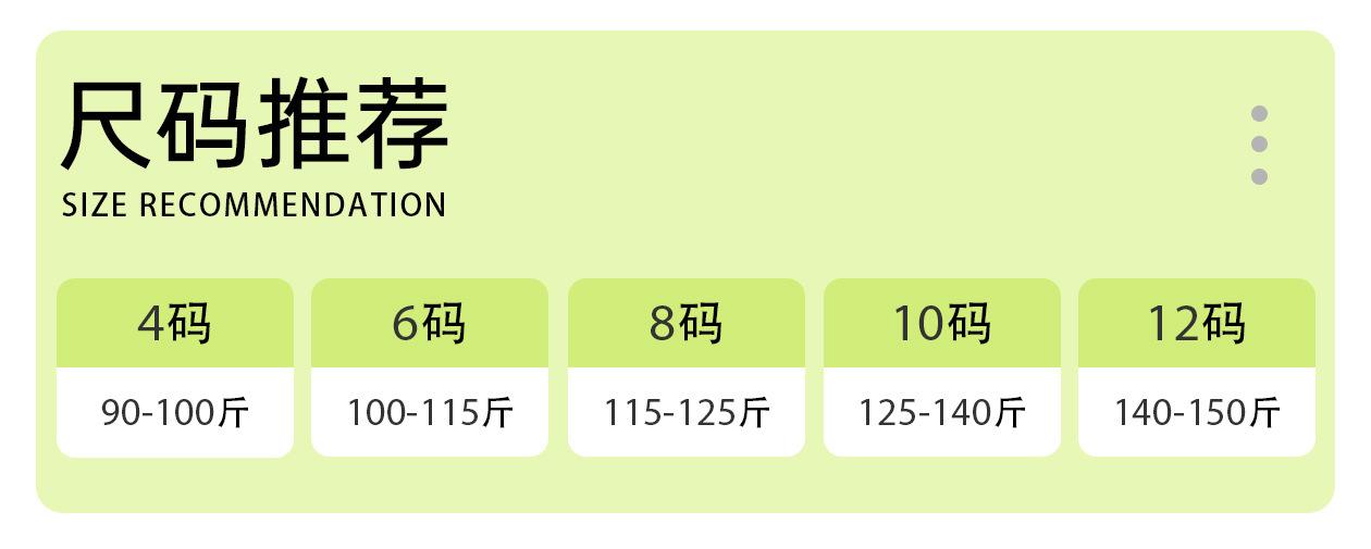 4( 45-50kg ), 6( 50-57.5kg ), 8( 57.5-62.5kg ), 10( 62.5-70kg ), 12( 70-75kg )