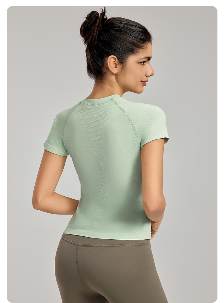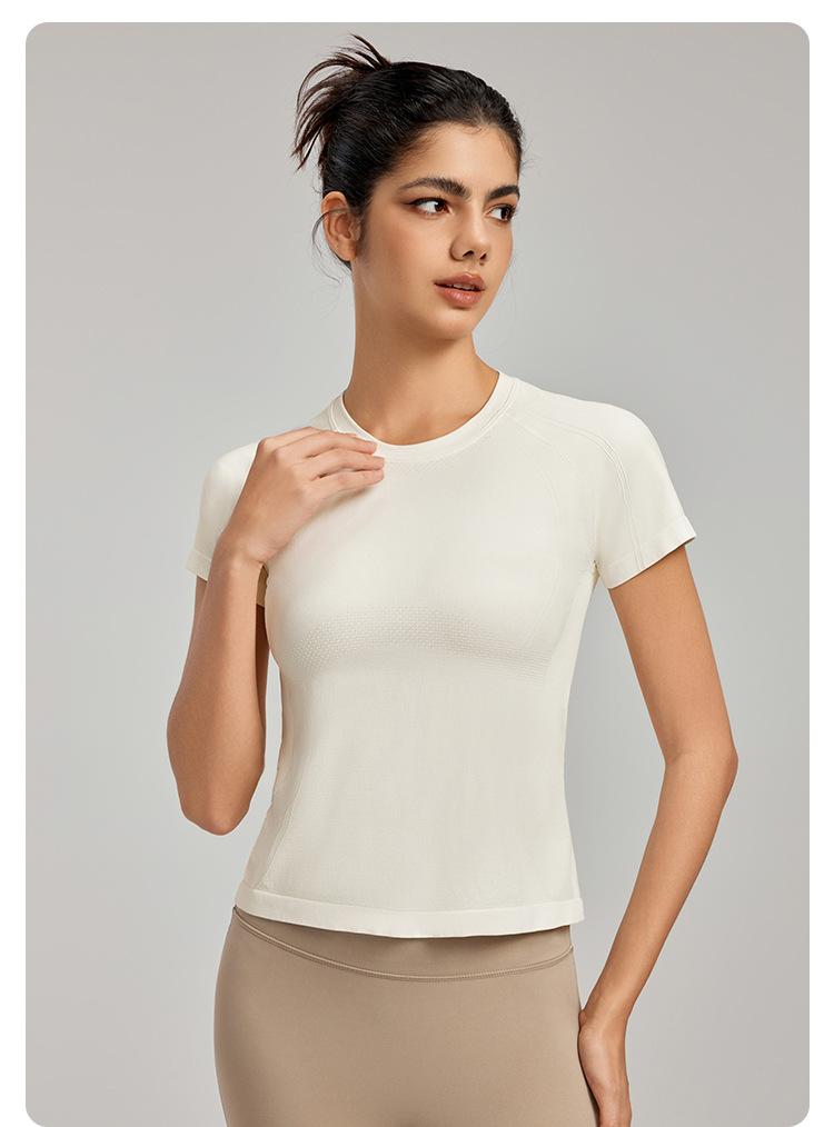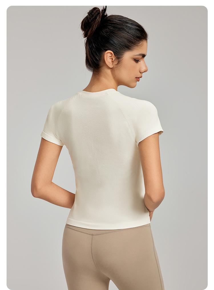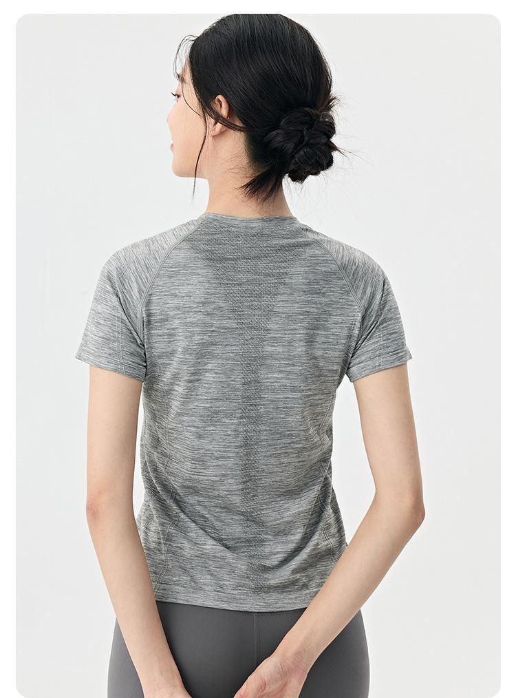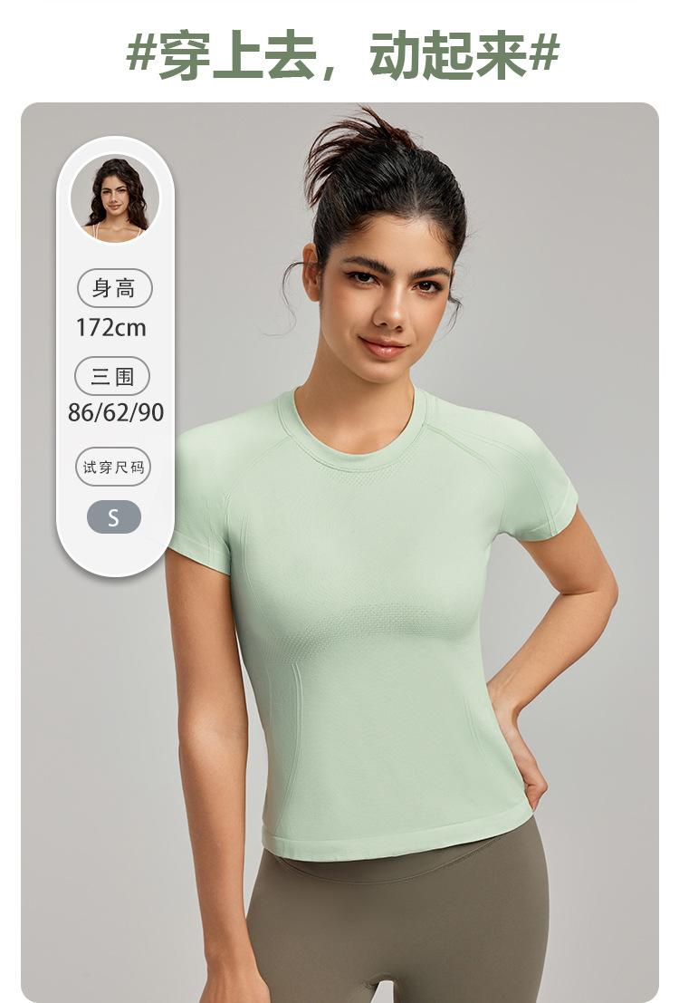 Traje de yoga sin costuras, camiseta de manga corta con cuello redondo que adelgaza la cintura, transpirable y agradable para la piel, top deportivo fresco para mujer.