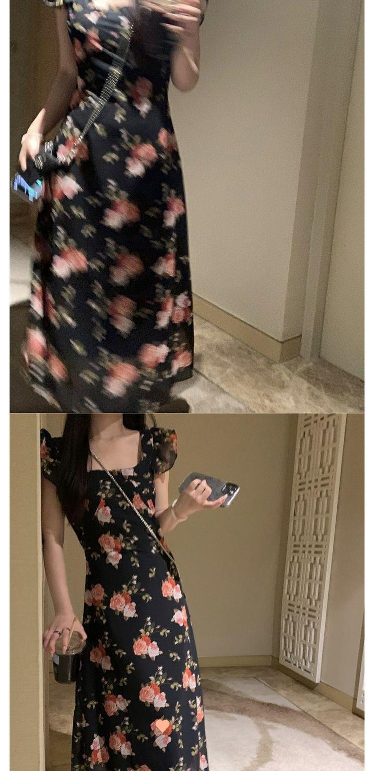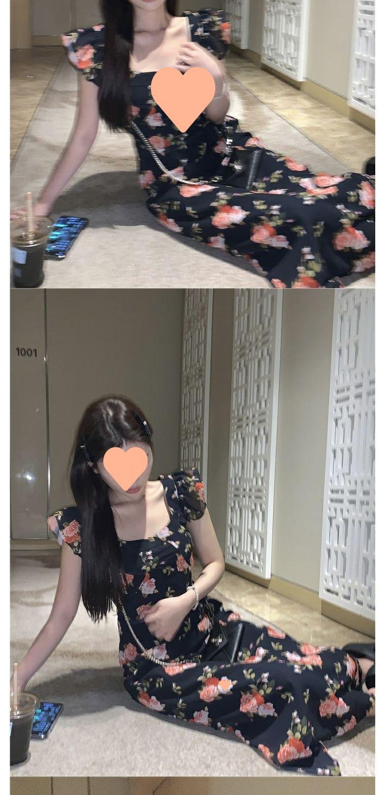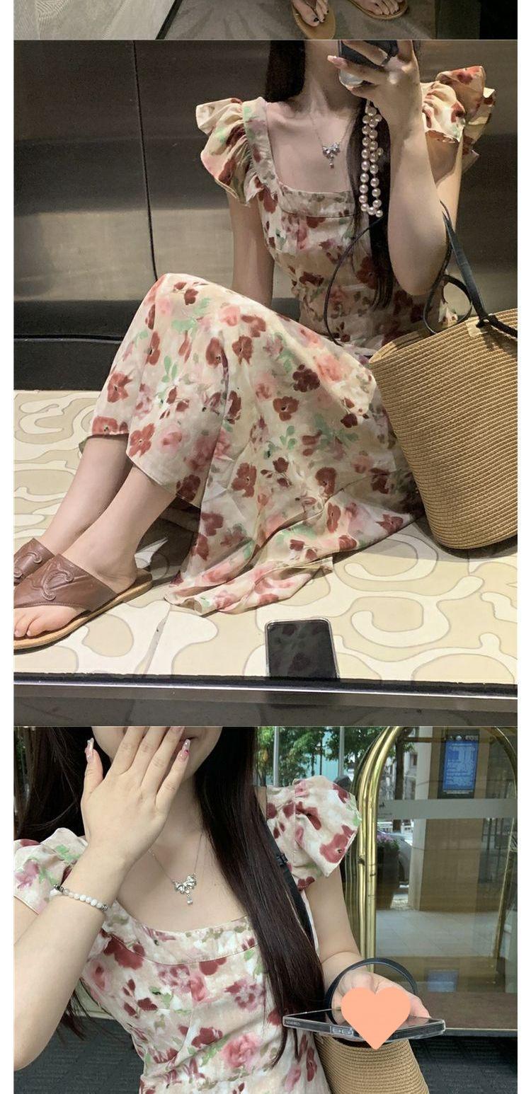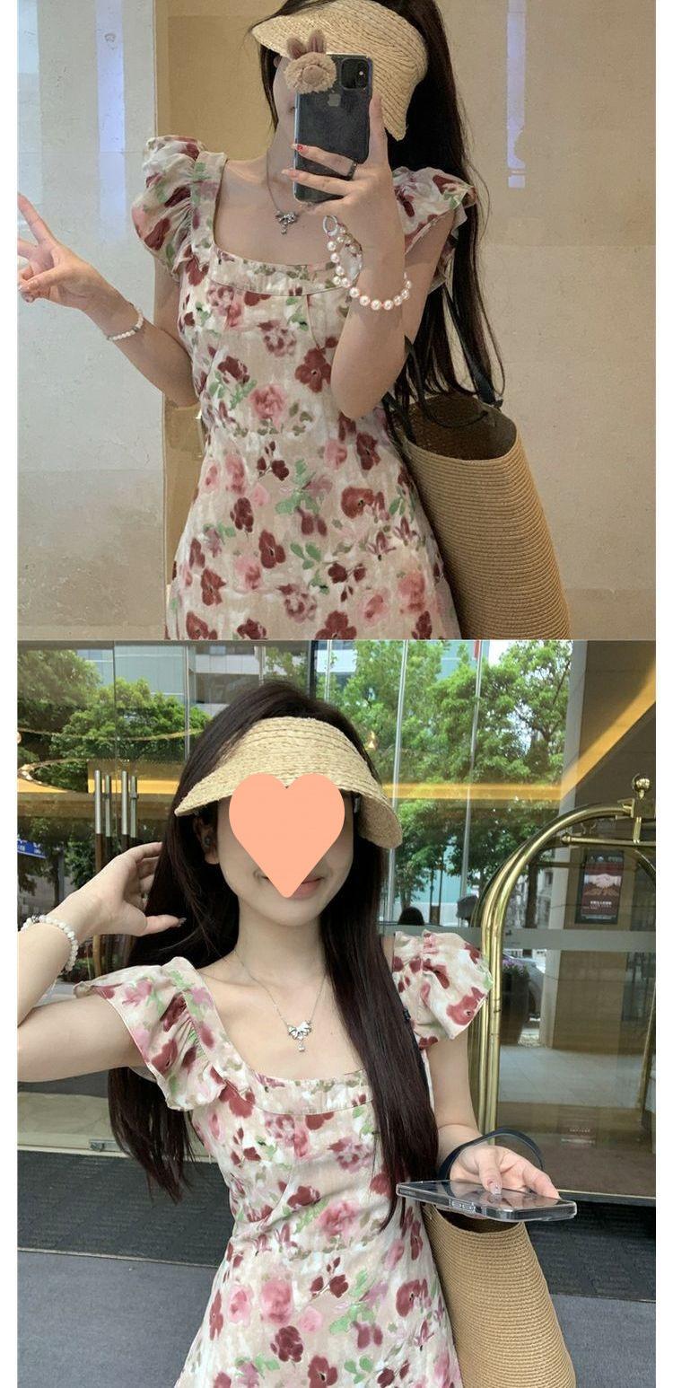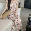 Vestido Floral de Verano para Mujer Estilo Resort Manga Corta Abullonada Cuello Cuadrado Retro Francés Adelgazante para la Cintura Vestido para la Hora del Té Falda Larga