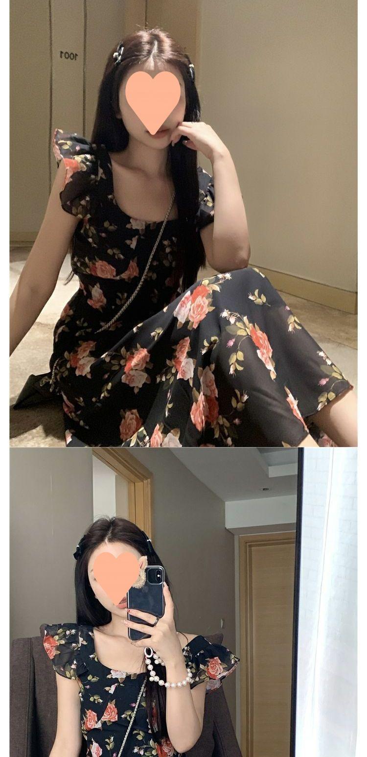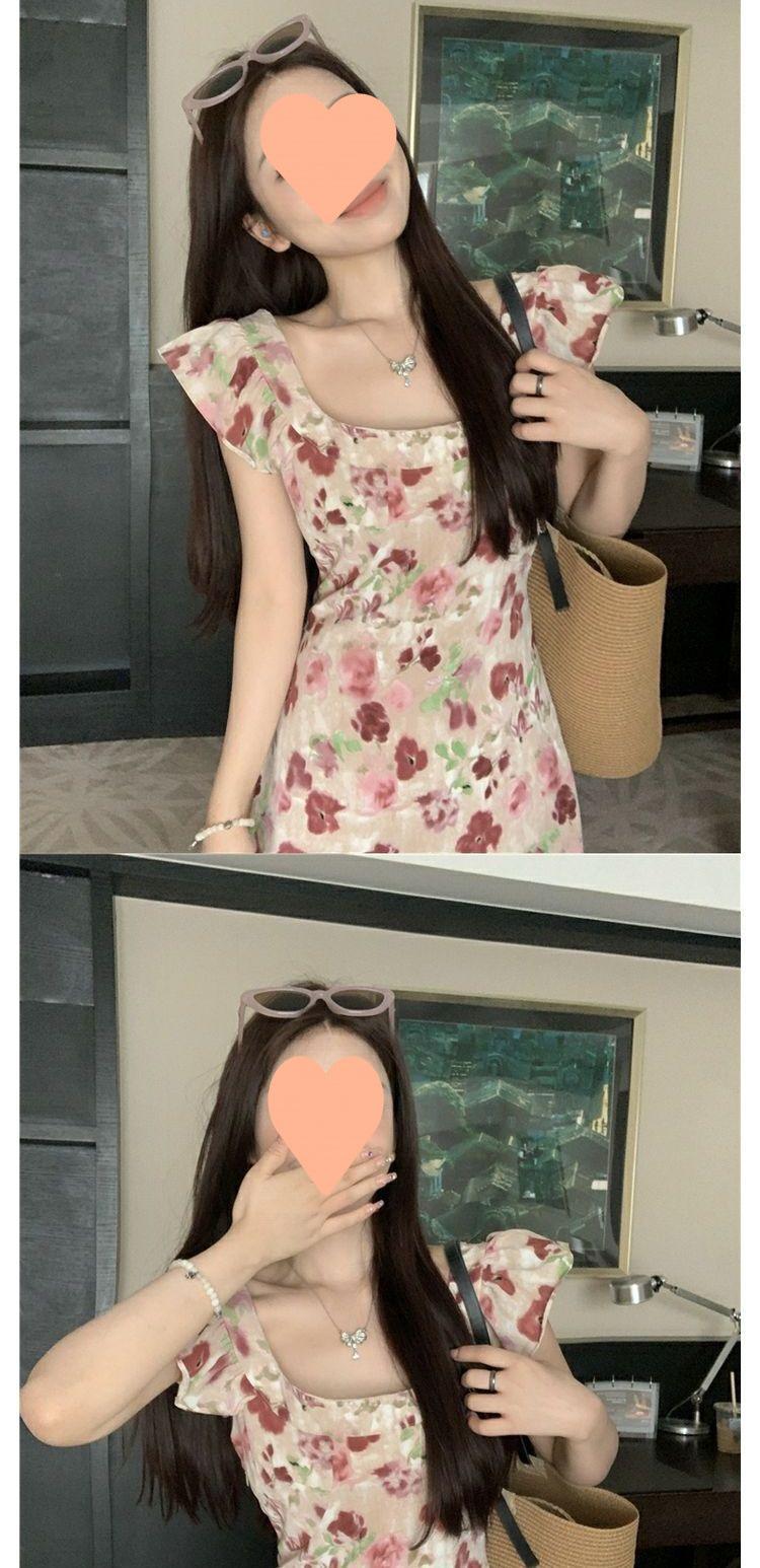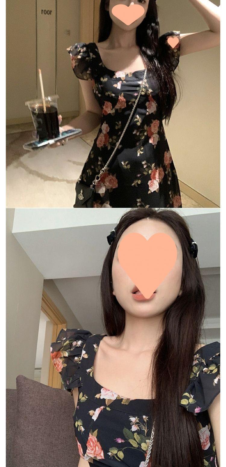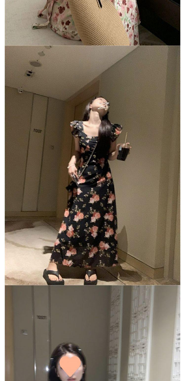 Vestido Floral de Verano para Mujer Estilo Resort Manga Corta Abullonada Cuello Cuadrado Retro Francés Adelgazante para la Cintura Vestido para la Hora del Té Falda Larga