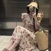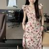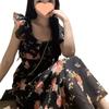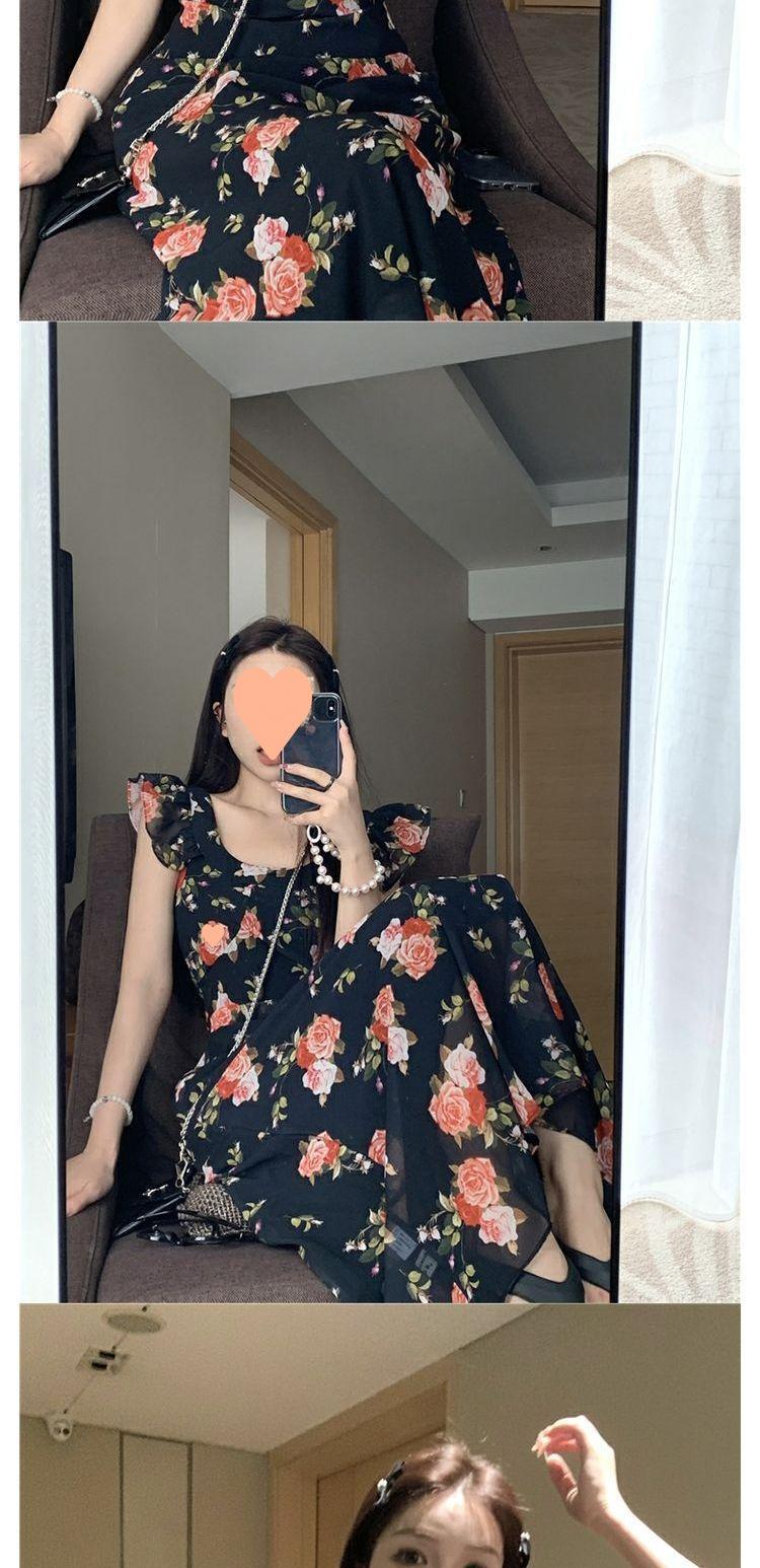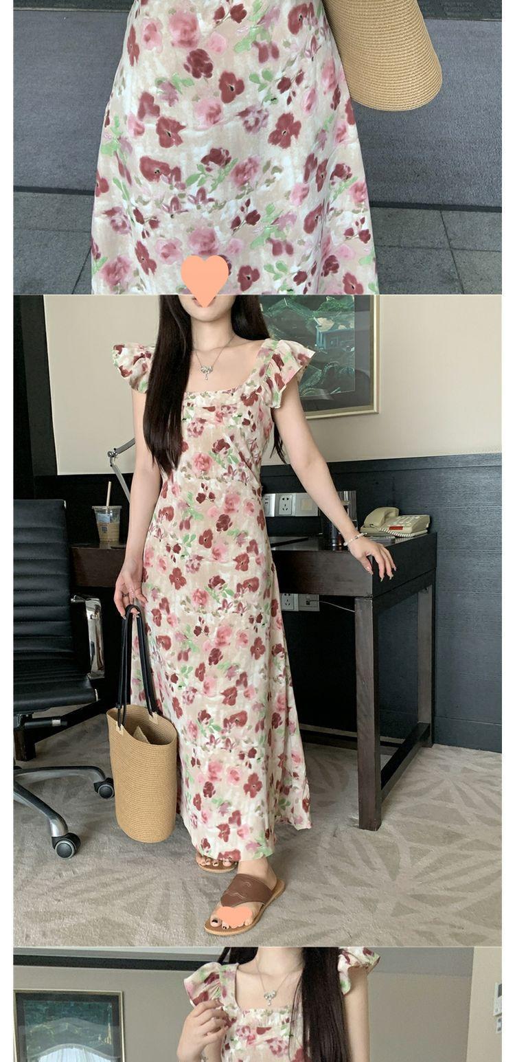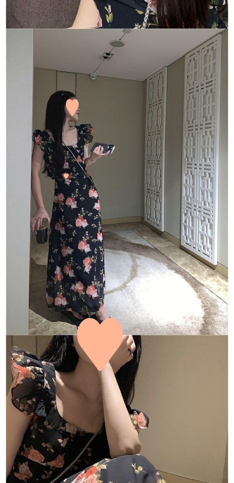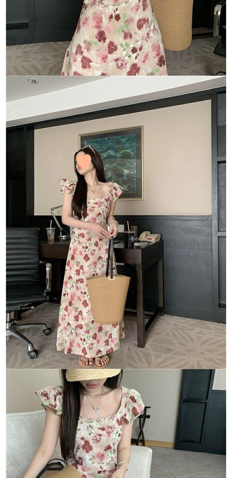Vestido Floral de Verano para Mujer Estilo Resort Manga Corta Abullonada Cuello Cuadrado Retro Francés Adelgazante para la Cintura Vestido para la Hora del Té Falda Larga