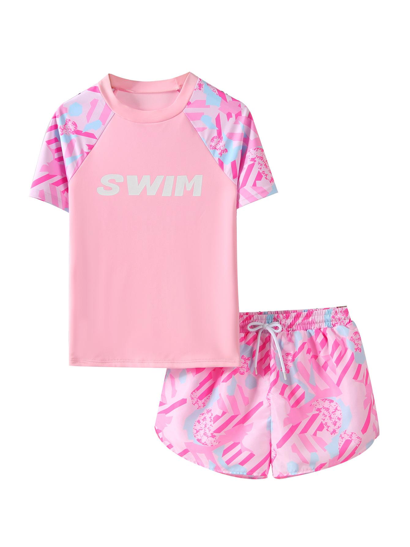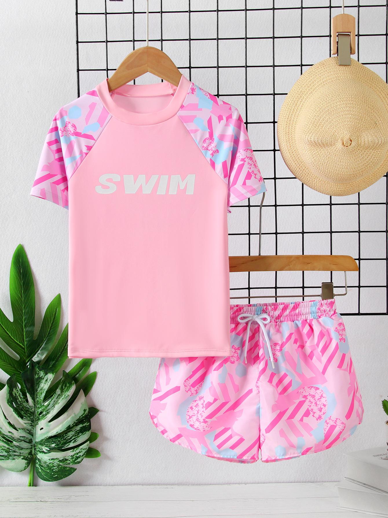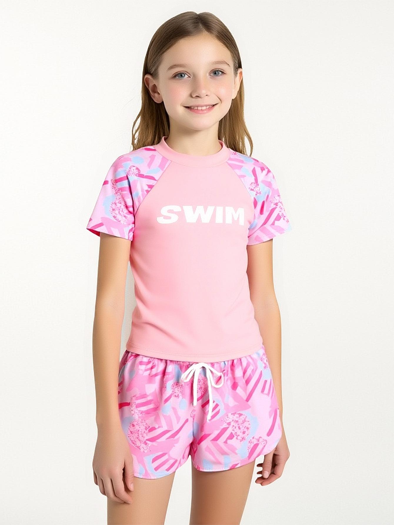Traje de Baño para Niñas Traje de Baño Dividido 2025 Nuevo Rosa Manga Corta Shorts Letra Deportivo Traje de Baño para Niña