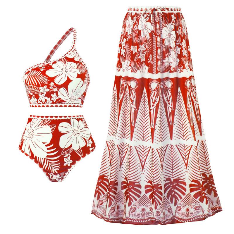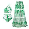 Nuevo traje de baño de bikini de tres piezas con abertura retro francés para mujer, estilo europeo y americano, con falda de malla y hombros descubiertos.