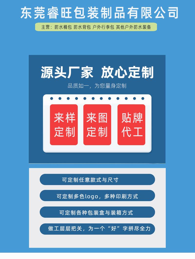 Dongguan Ruiwang Packaging Products Co., Ltd. es una empresa especializada enProducción de bolsas impermeables para exteriores, mochilas impermeables, bolsas de equipaje impermeables, bolsas de aislamiento impermeables y bolsas impermeables para teléfonos móviles.Nuestra fábrica fabrica productos impermeables para equipos de exterior, ayudando a nuestros clientes a resolver el problema de la impermeabilización de sus artículos personales durante la práctica de deportes al aire libre. Desde su apertura, ha fabricado productos para numerosas marcas deportivas de renombre mundial, y la calidad de sus productos ha sido ampliamente reconocida por nuestros clientes. Nos dedicamos principalmente a la personalización según planos, muestras y OEM. Además, contamos con un inventario suficiente de bolsas impermeables tipo cubo durante todo el año para satisfacer sus necesidades en cualquier momento. Esperamos con interés las llamadas de nuestros clientes, tanto nuevos como antiguos, para consultas y visitas a nuestra fábrica para orientación y negociación.