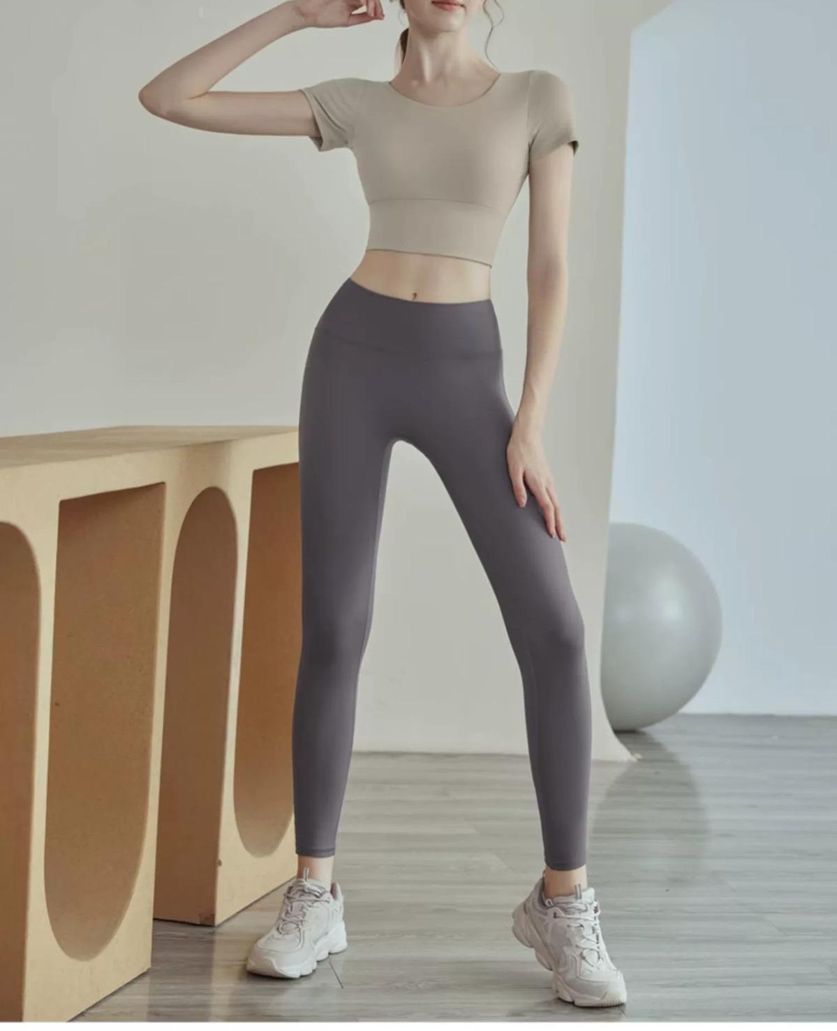 Caramel short-sleeved top [fixed cup] + gray trousers