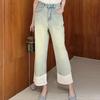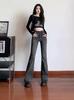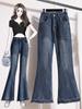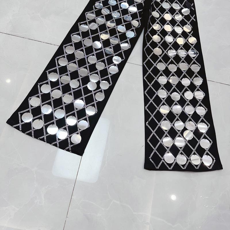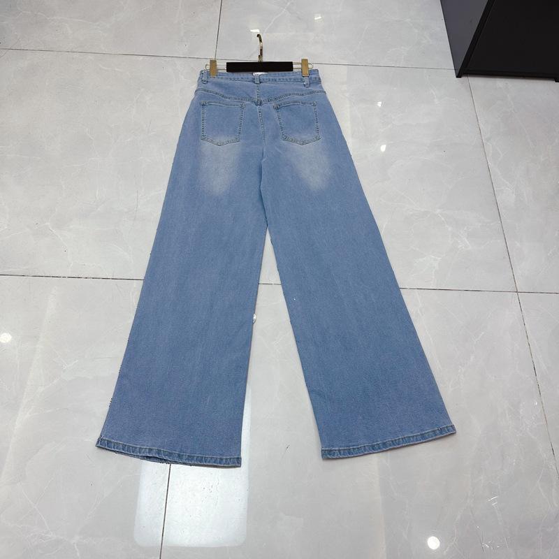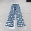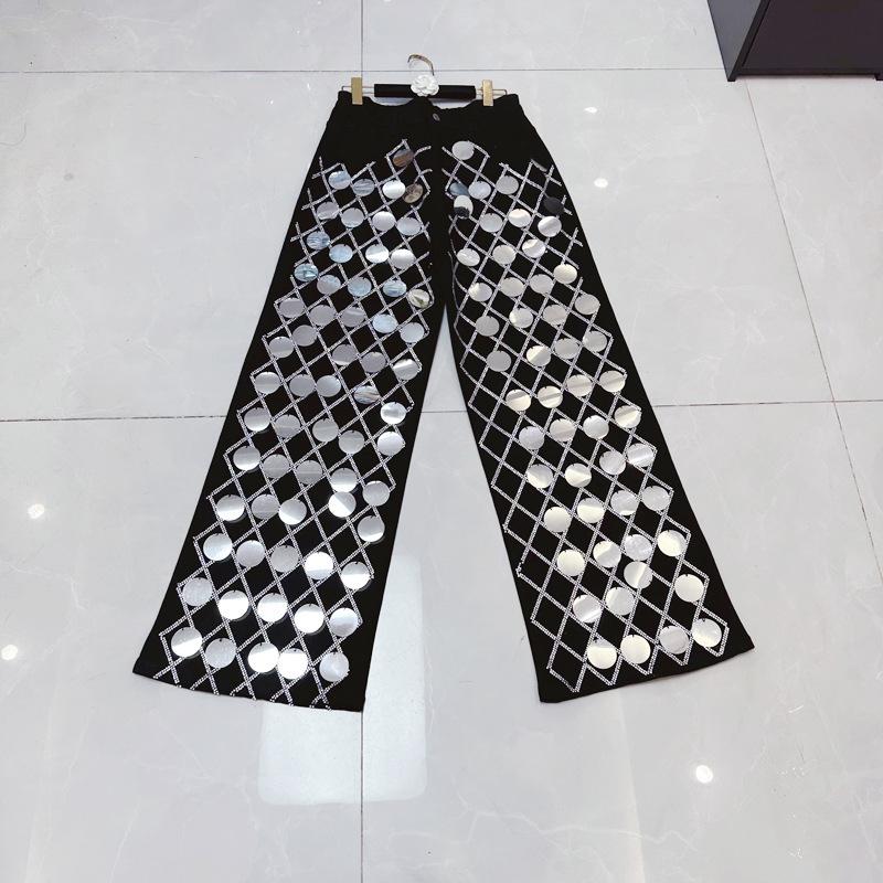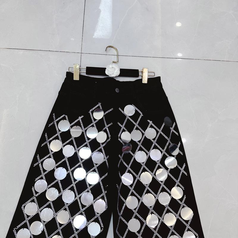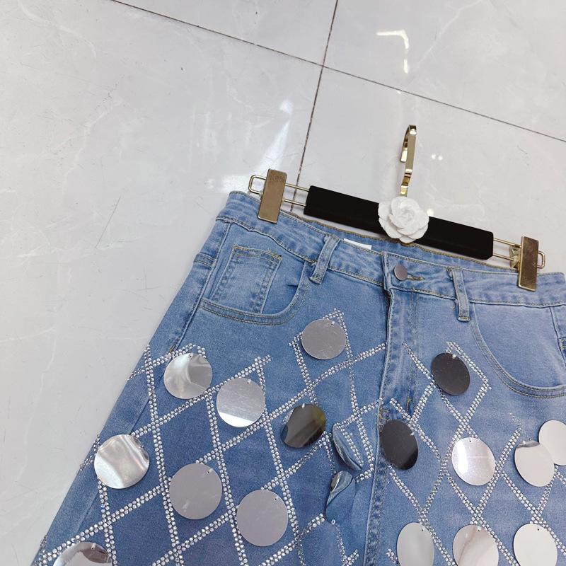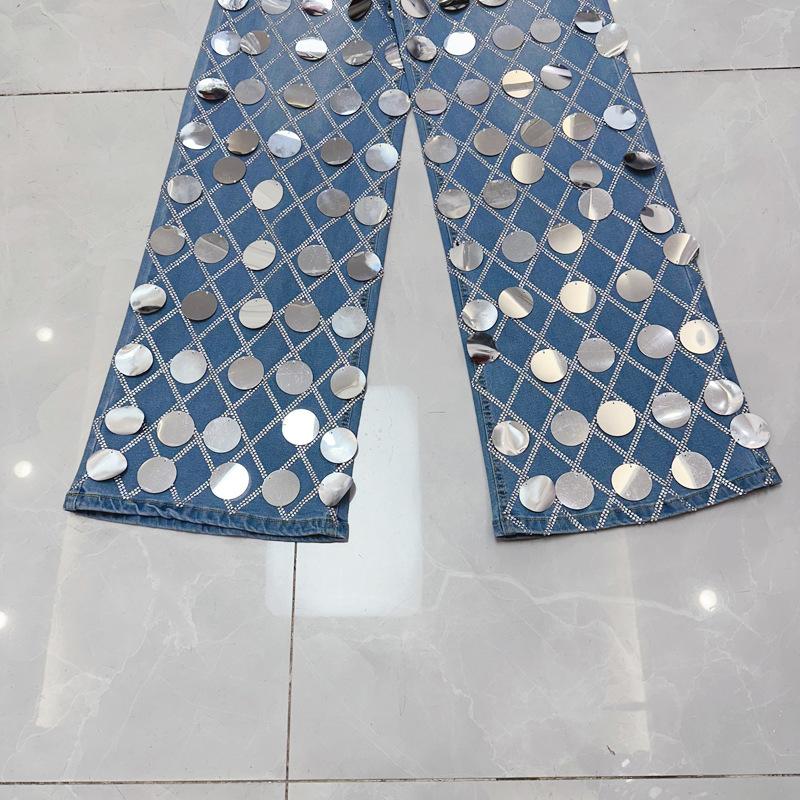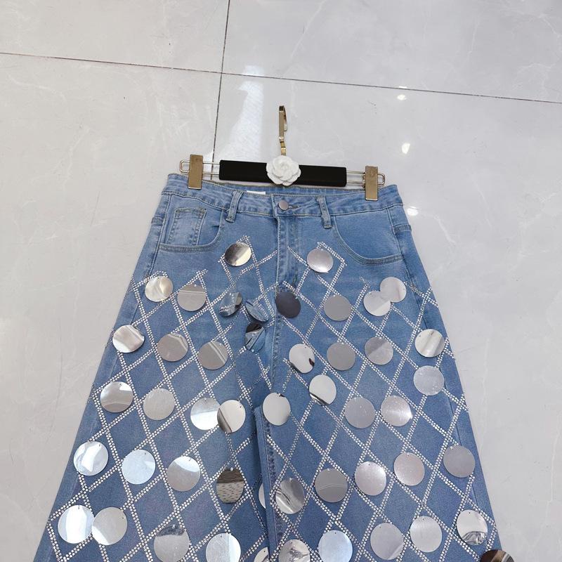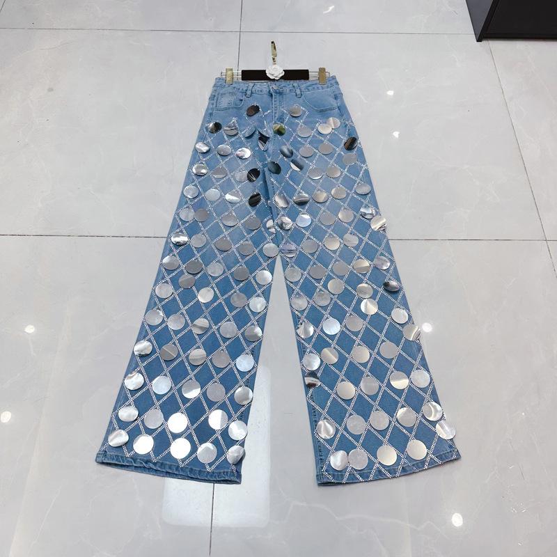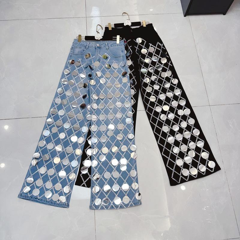 Pantalones de Mezclilla para Mujer de Moda con Diseño Europeo y Americano Transfronterizo, Cintura Alta, Corte Slim de Pierna Ancha, con Lentejuelas y Cuentas de Industria Pesada