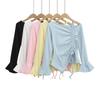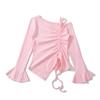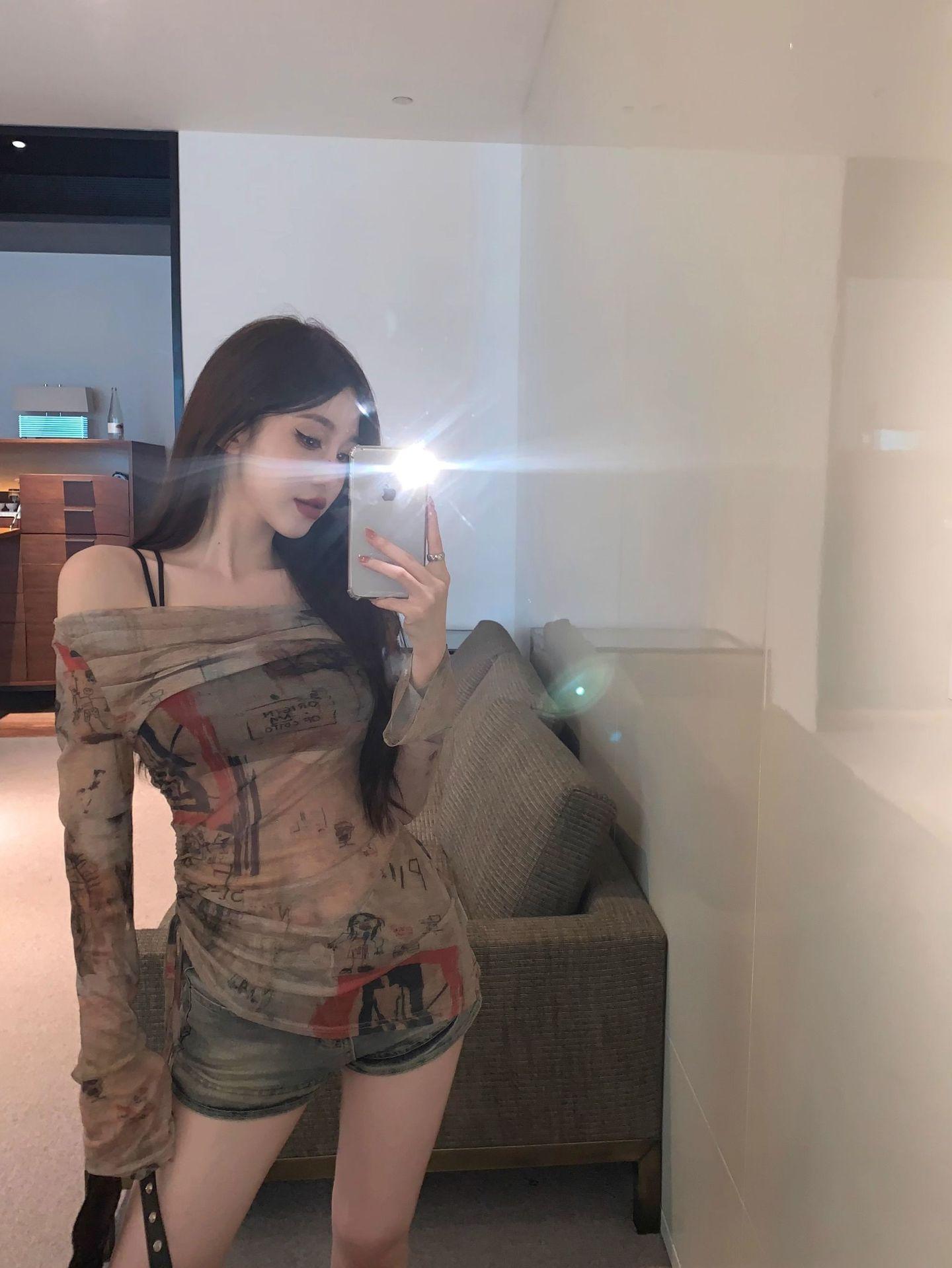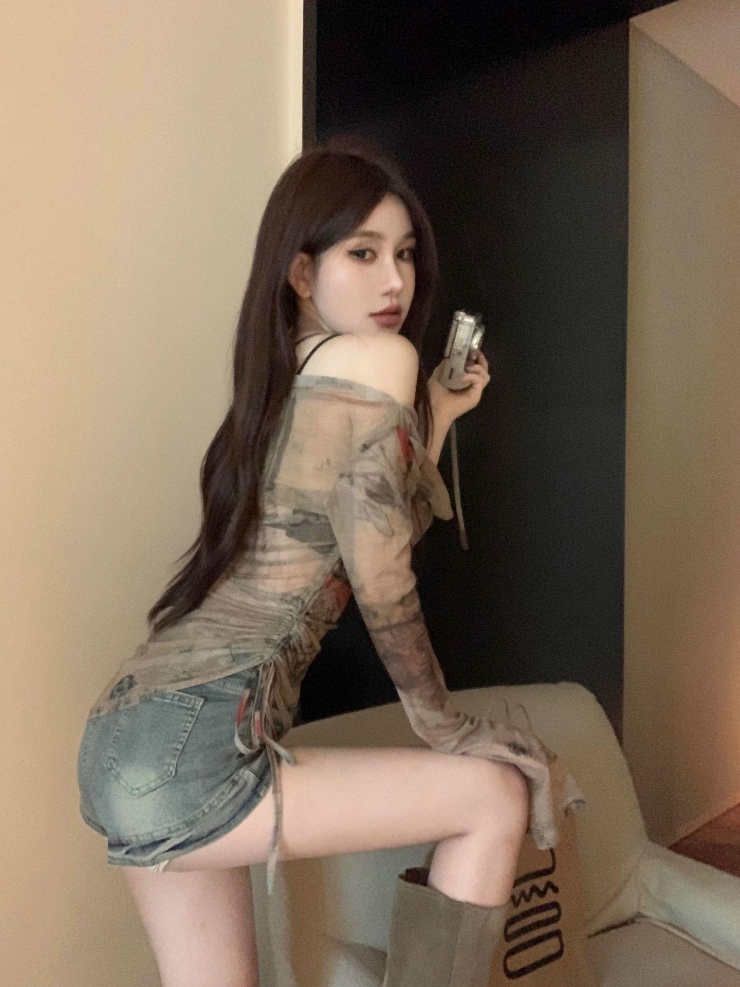 Camiseta con hombros descubiertos y estampado de chica sexy retro americana, blusa fina de malla de manga larga para mujer, blusa con cordón, comercio exterior al por mayor