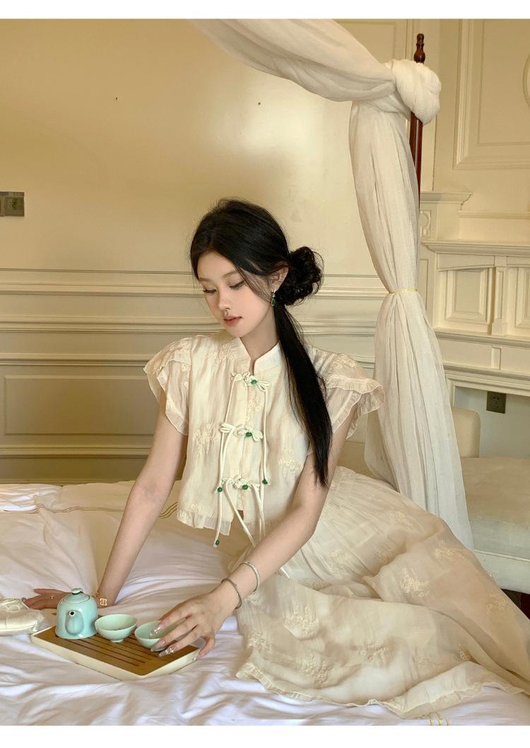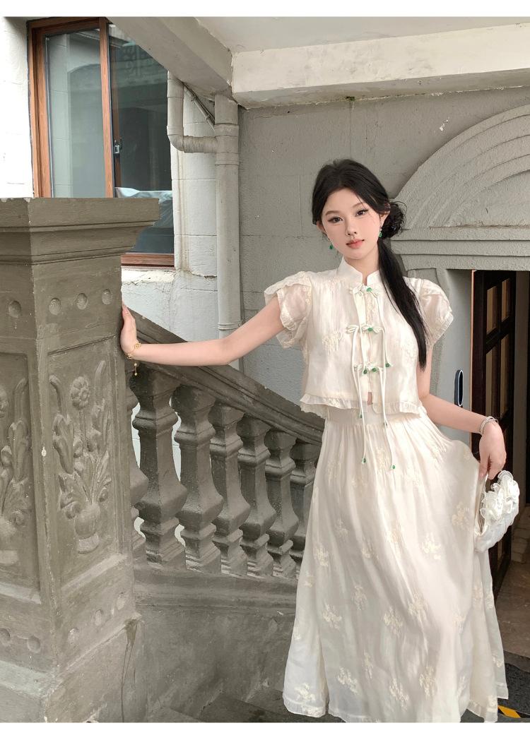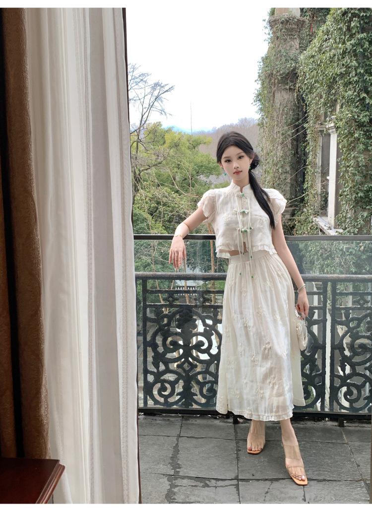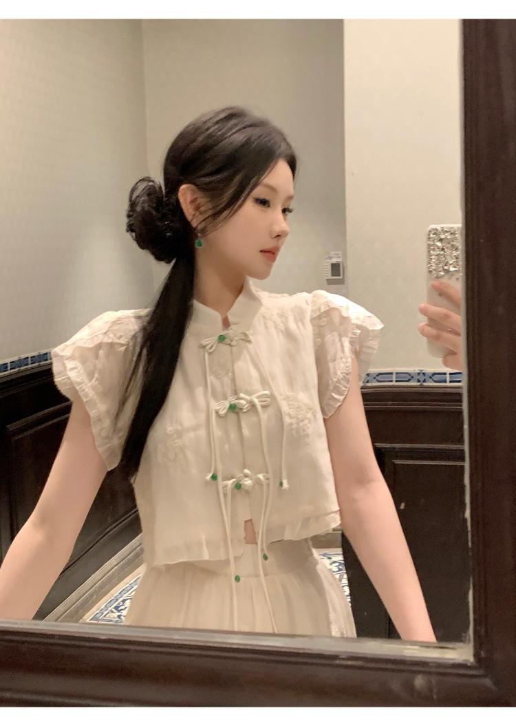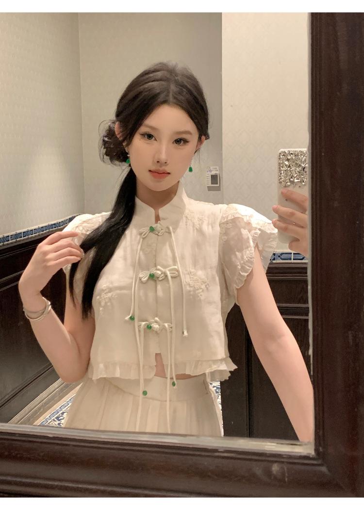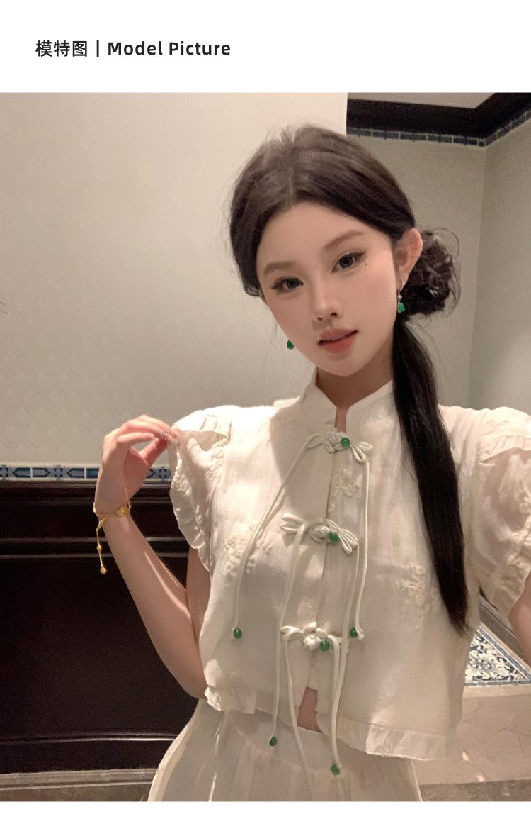 Foto Real y Precio Real Nueva Camisa Elegante de Manga Corta con Hebilla de Borla Chinoiserie Falda de Cintura Alta Traje de Moda de Diseño para Mujer