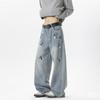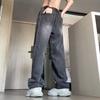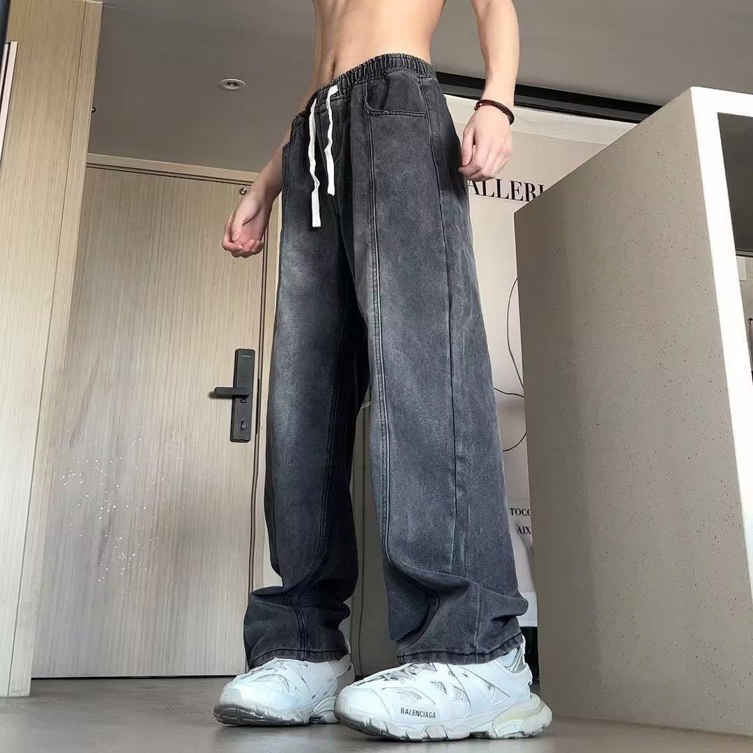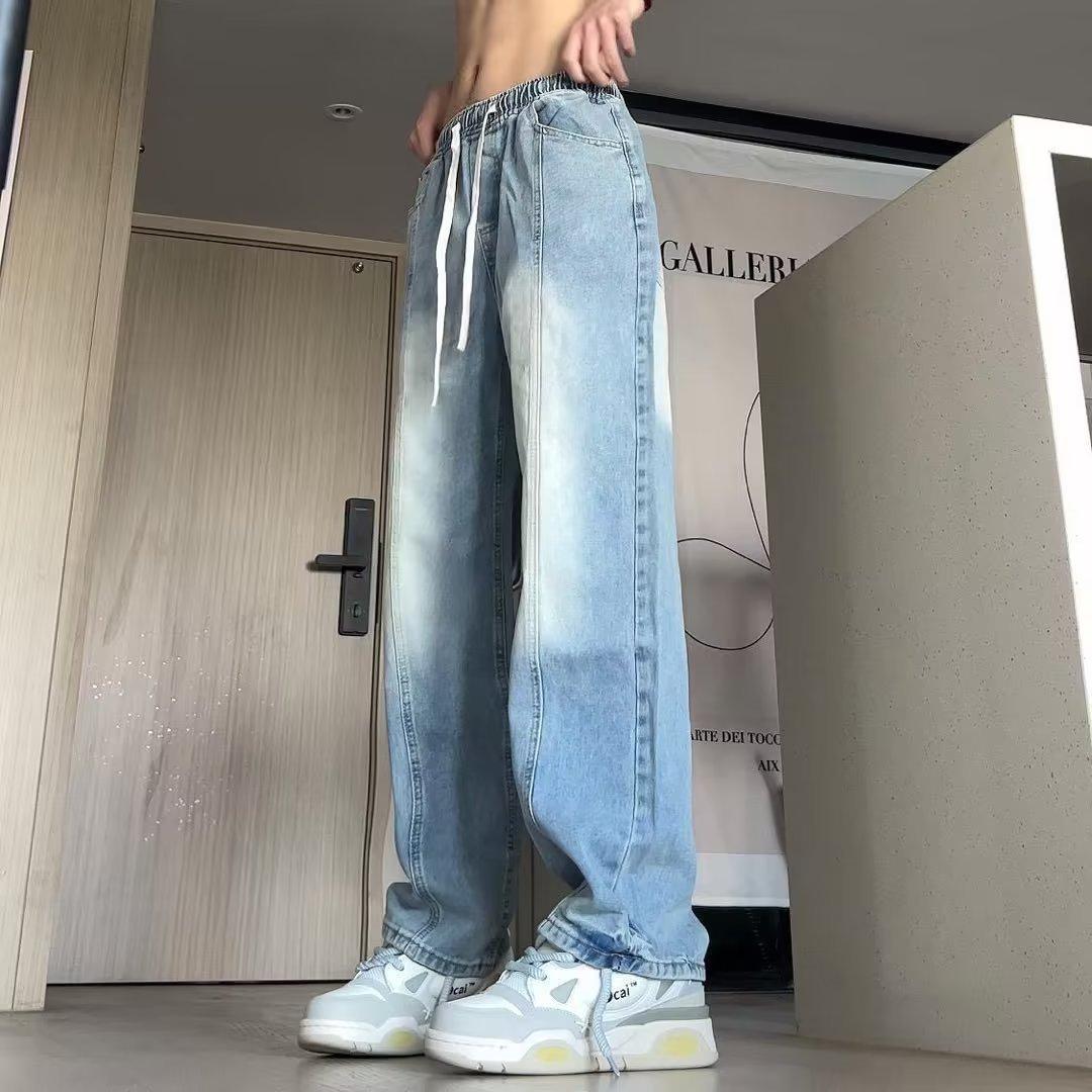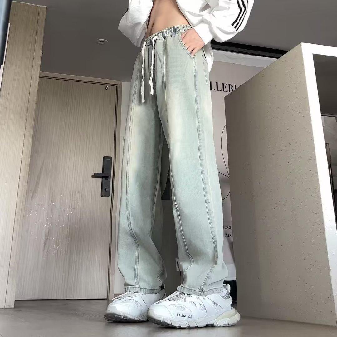 Jeans Lavados Vintage Primavera y Otoño Nuevo Sentido del Diseño Sueltos Rectos Estilo Americano High Street Pantalones con Costuras y Cordón para Hombre y Mujer