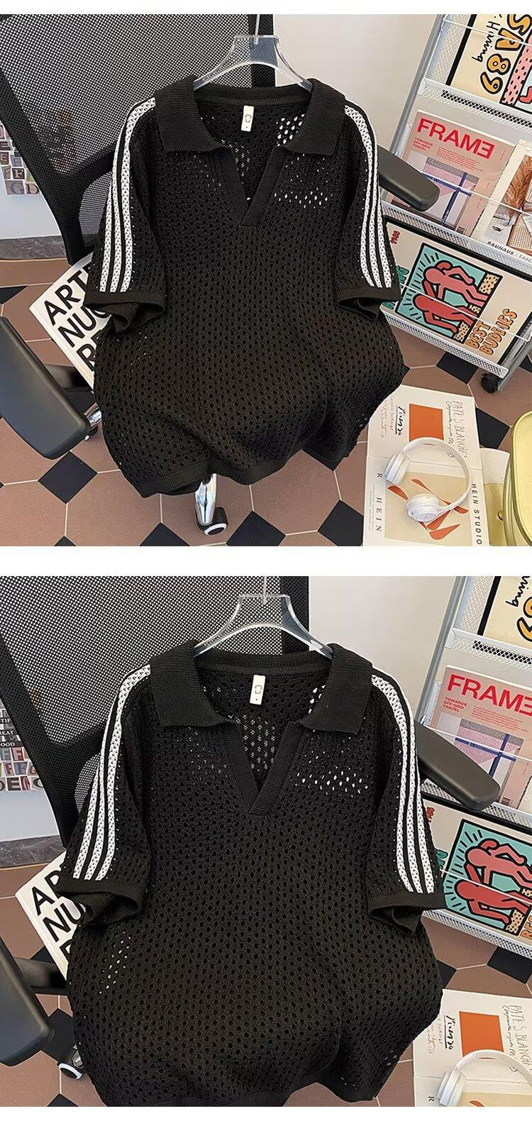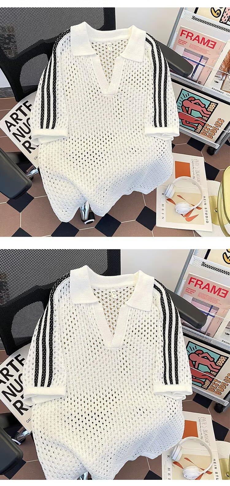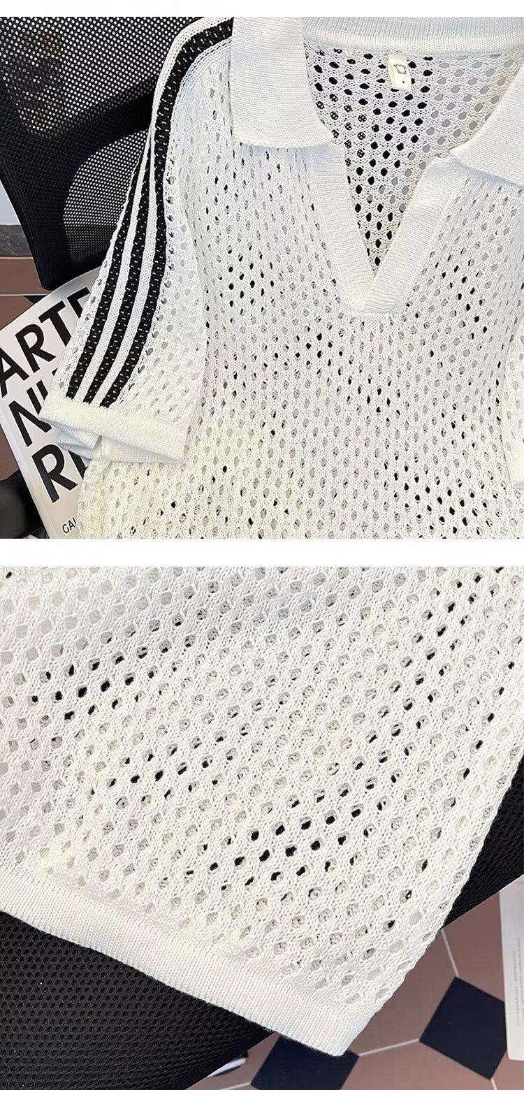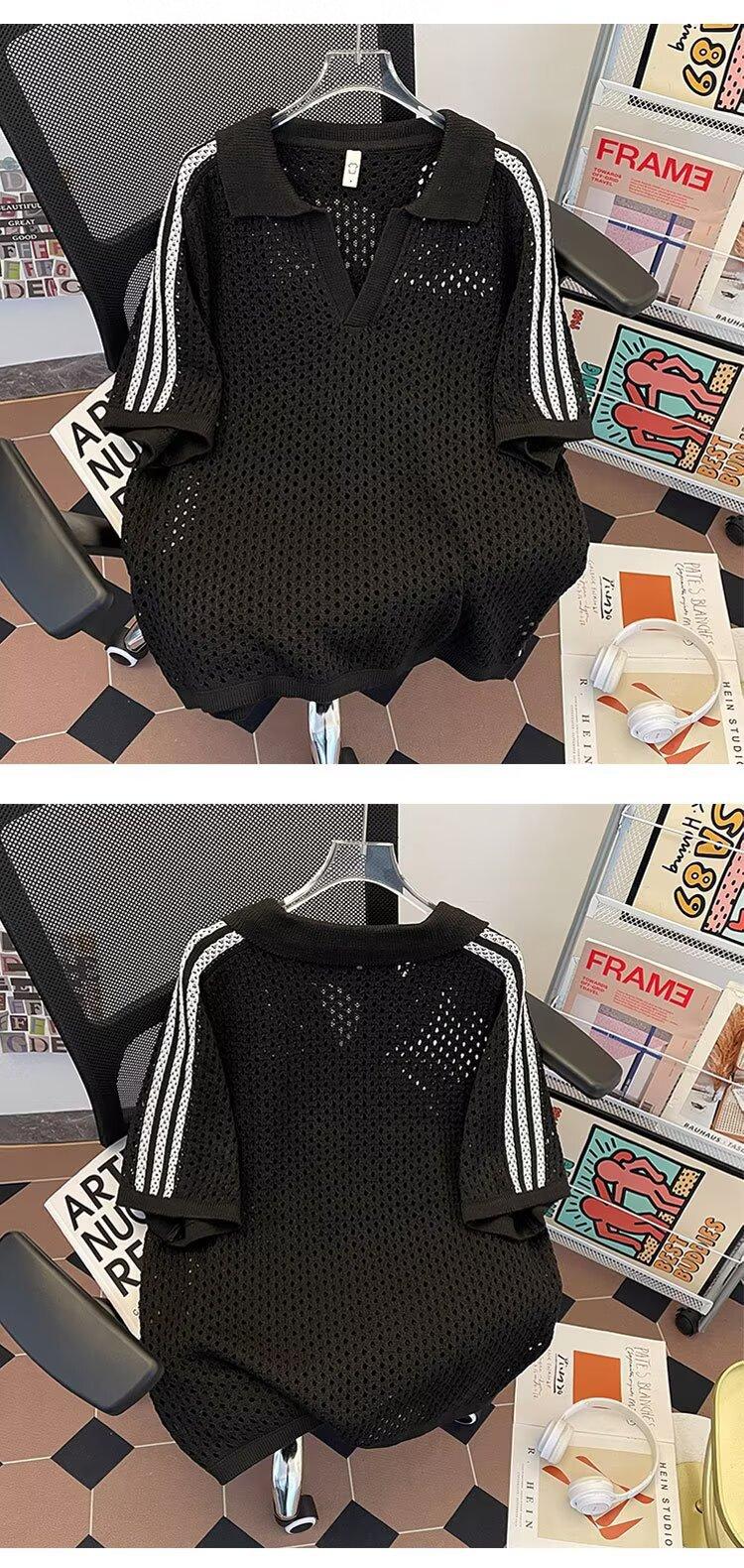 Verano 2025 Polo de punto hueco para hombre Moda callejera holgada de cuello suelto Top de malla de manga corta
