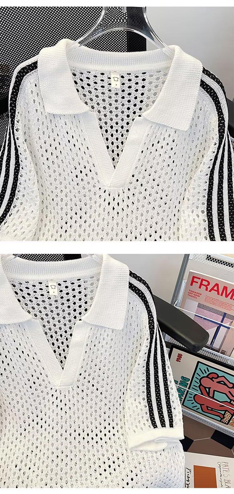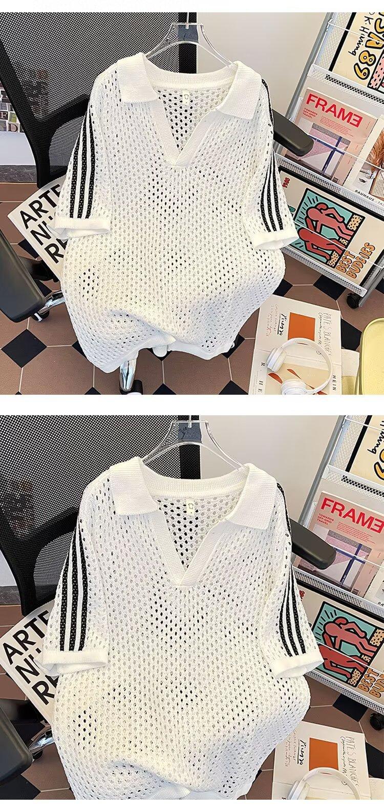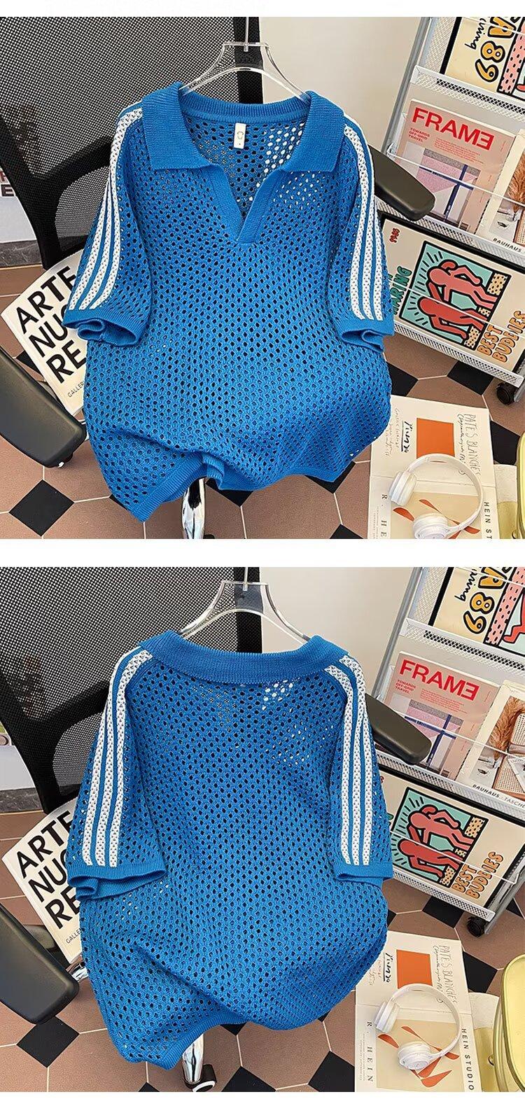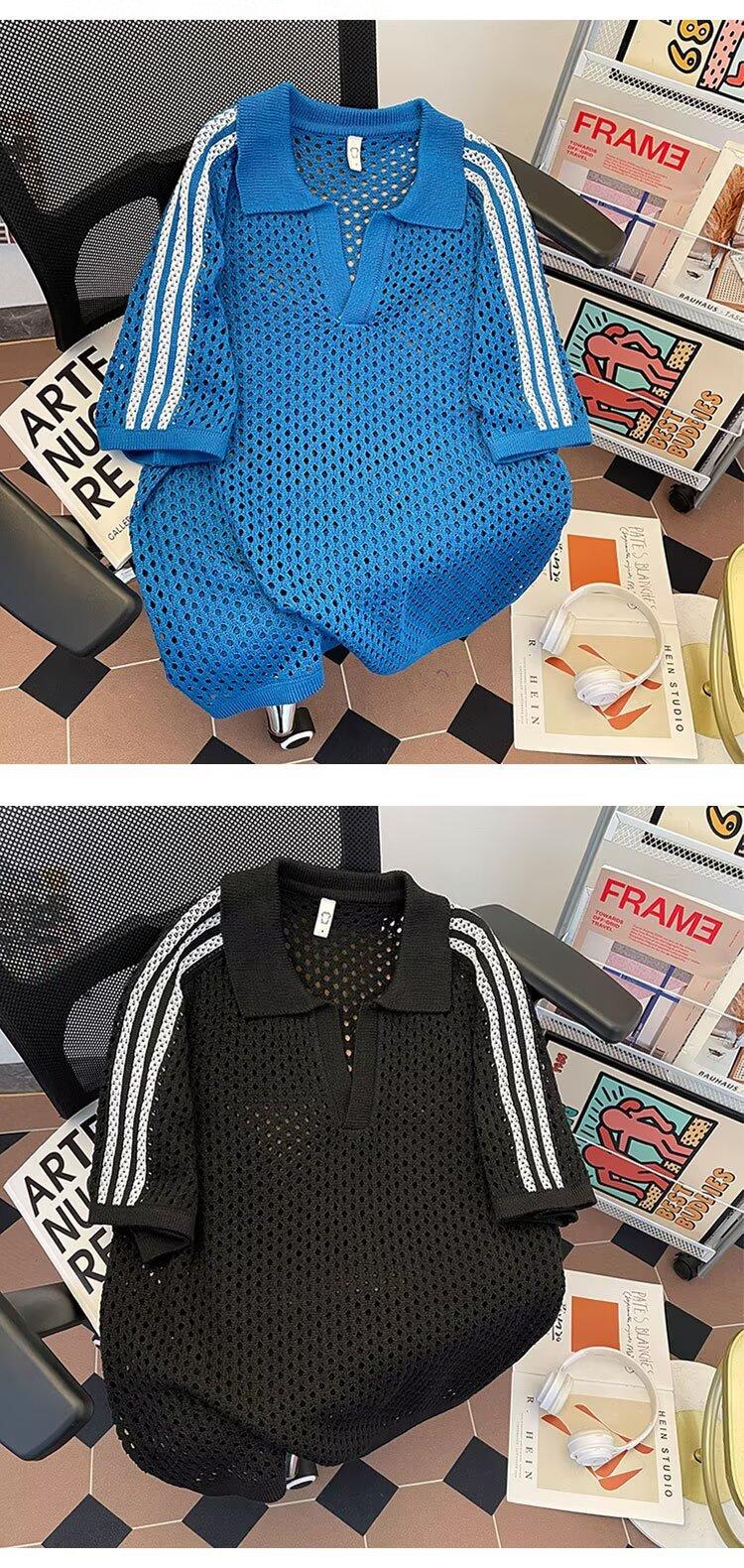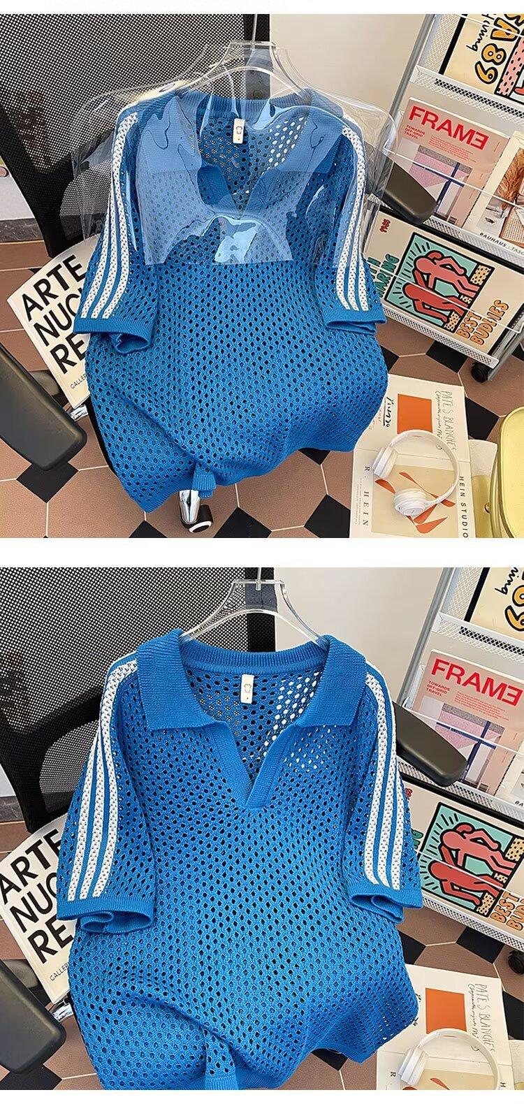 Verano 2025 Polo de punto hueco para hombre Moda callejera holgada de cuello suelto Top de malla de manga corta
