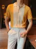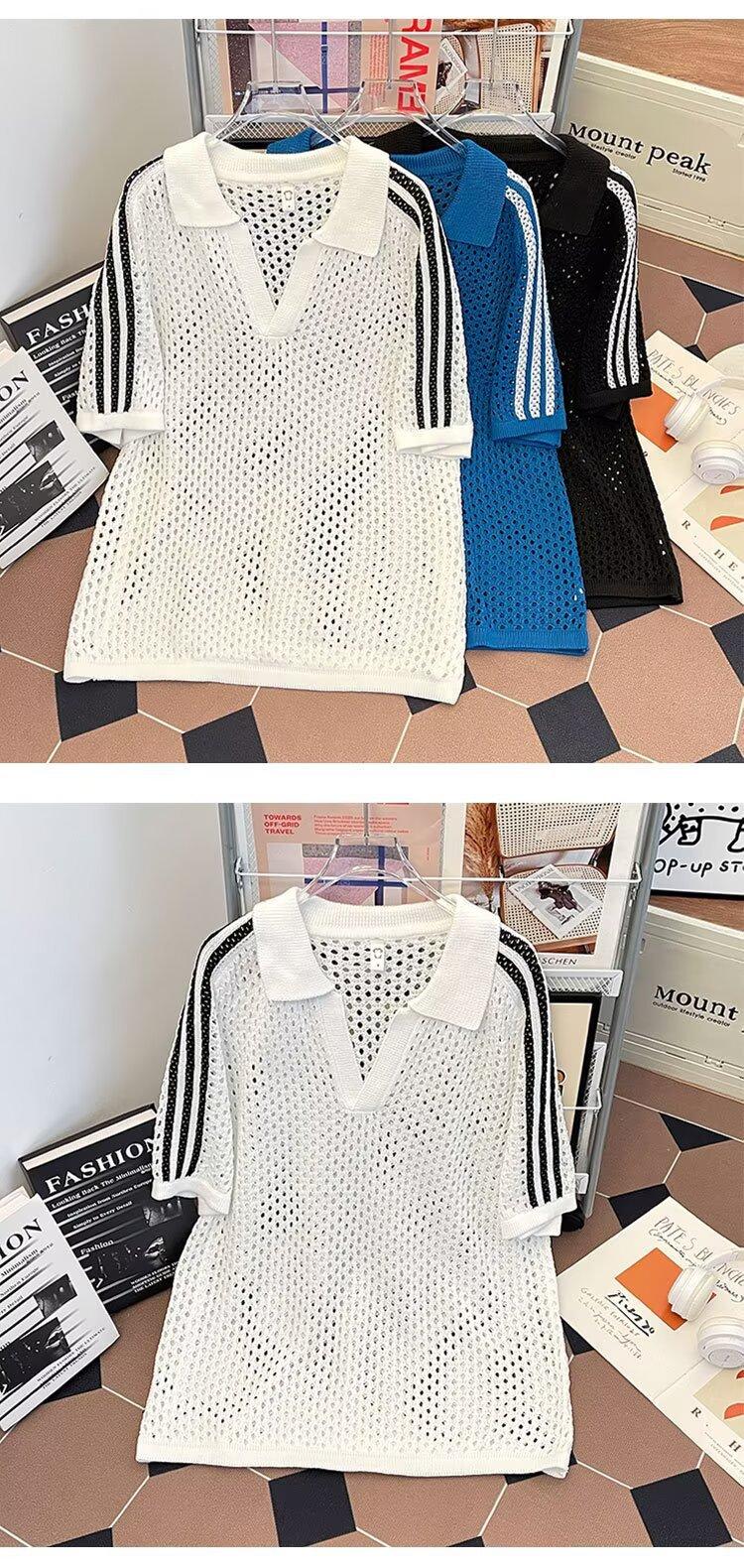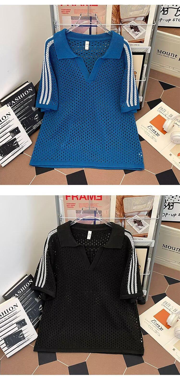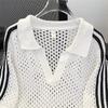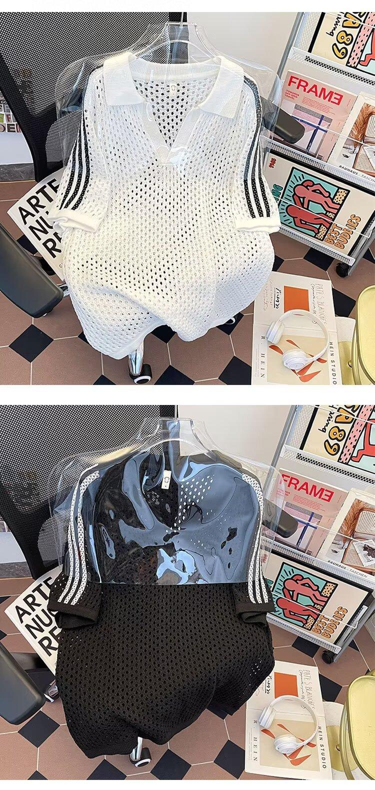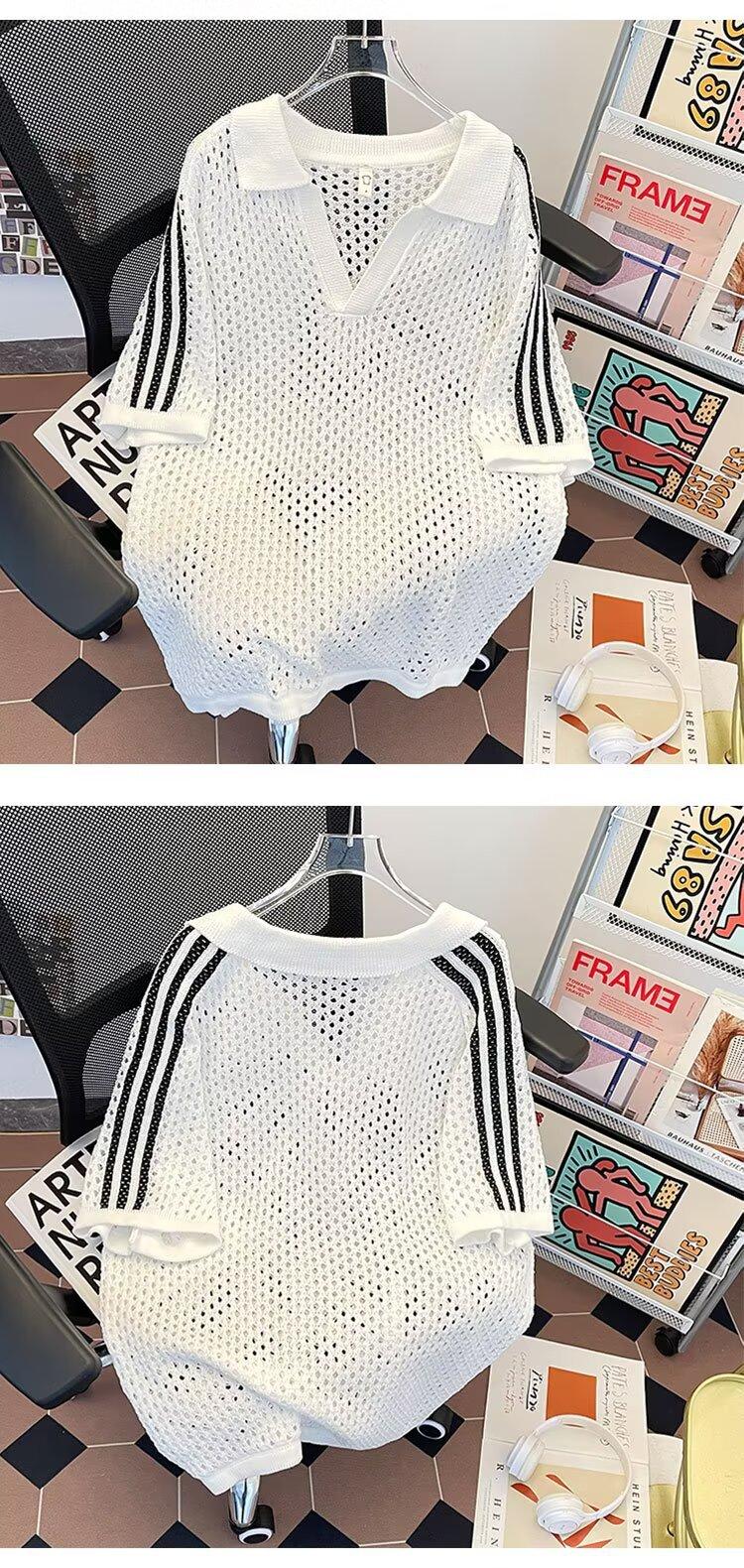 Verano 2025 Polo de punto hueco para hombre Moda callejera holgada de cuello suelto Top de malla de manga corta