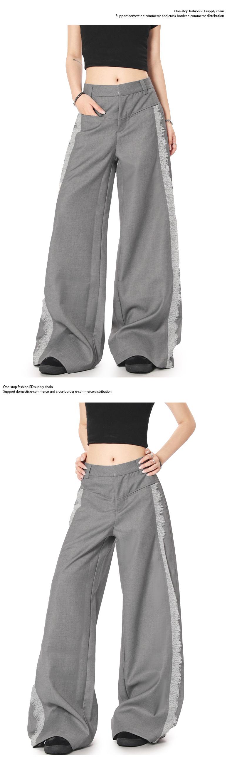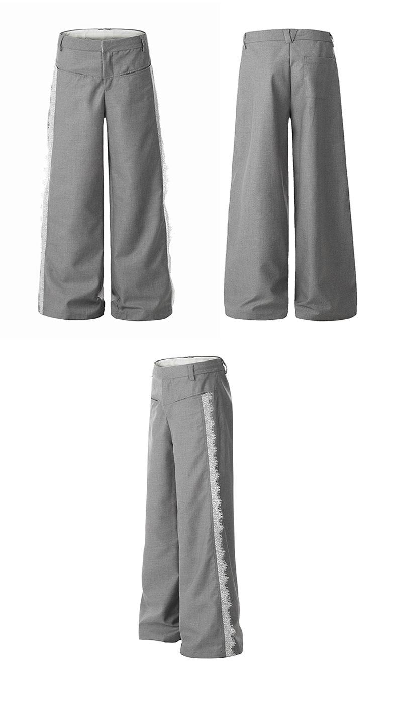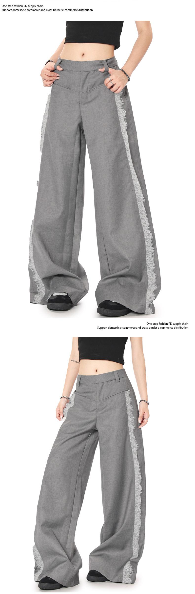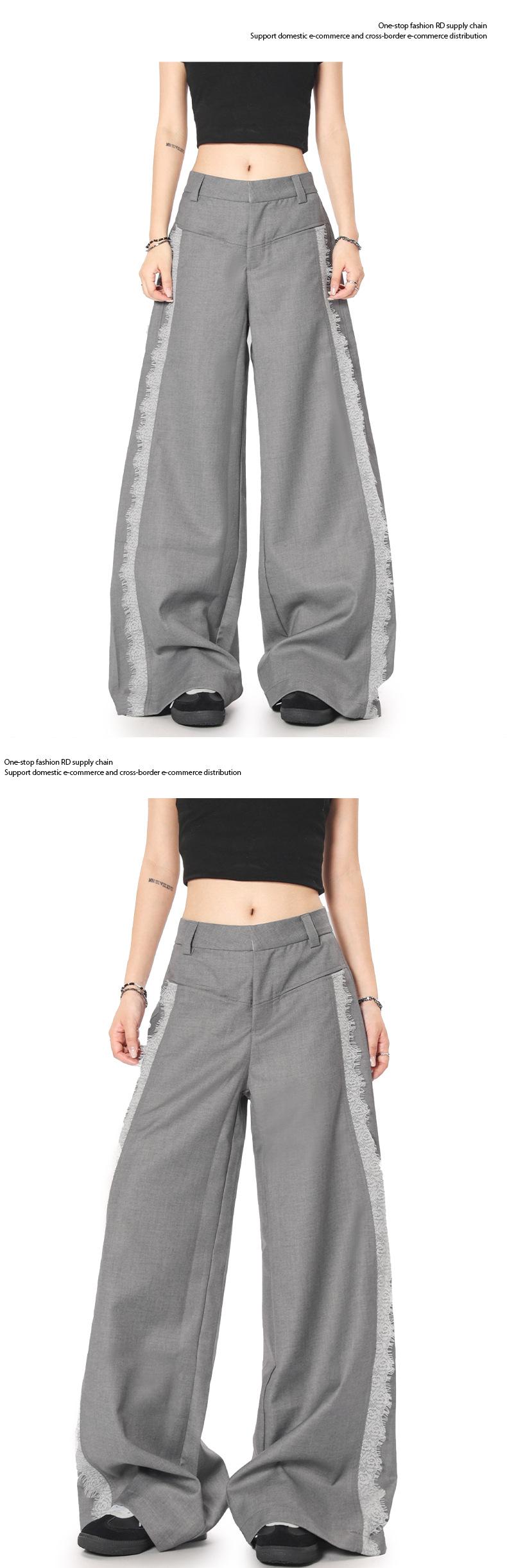 OREETA Pantalones Grises Drapeados con Encaje en el Borde y Costuras Marca de Moda Avanzada Pierna Ancha Adelgazantes Casuales