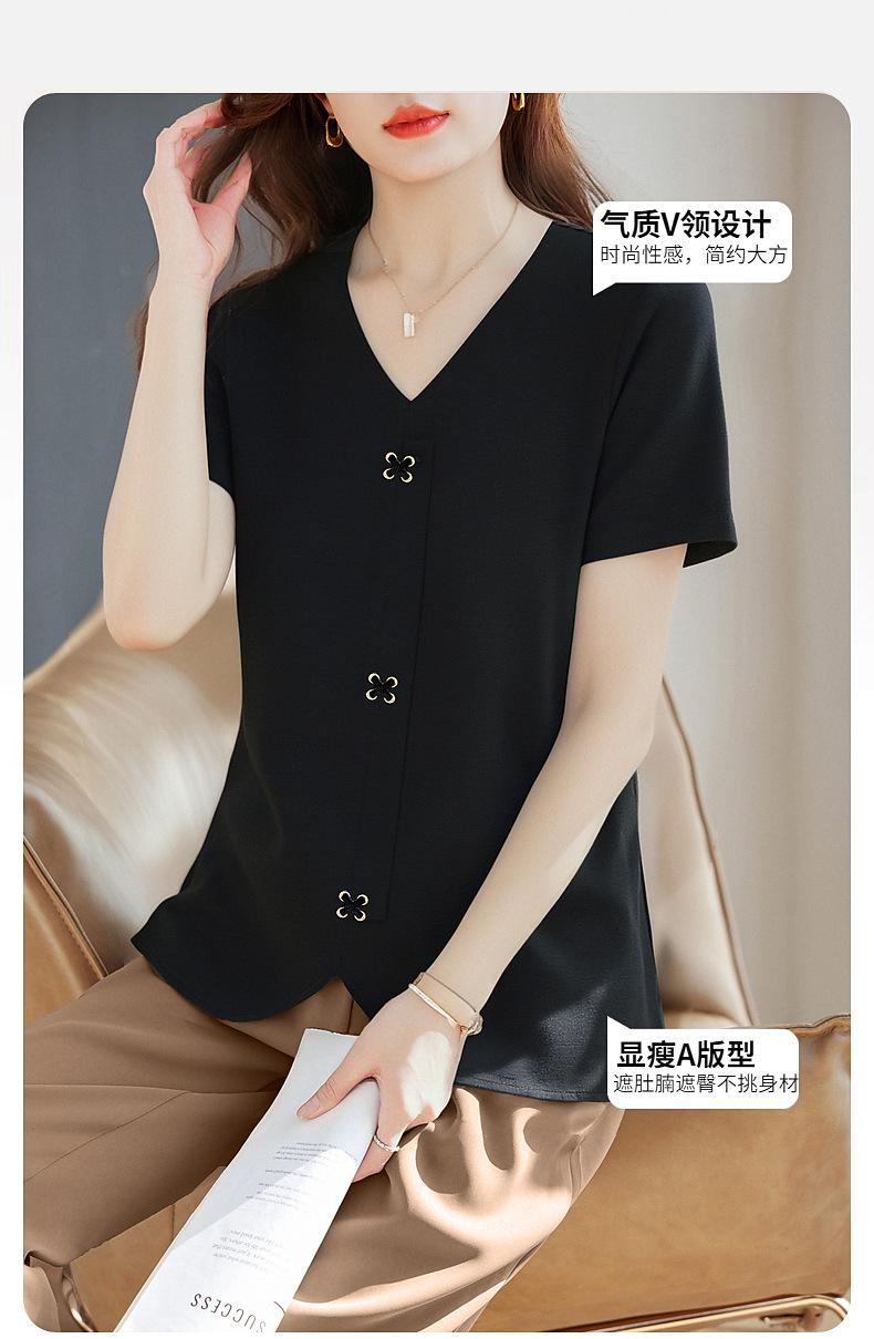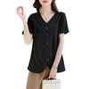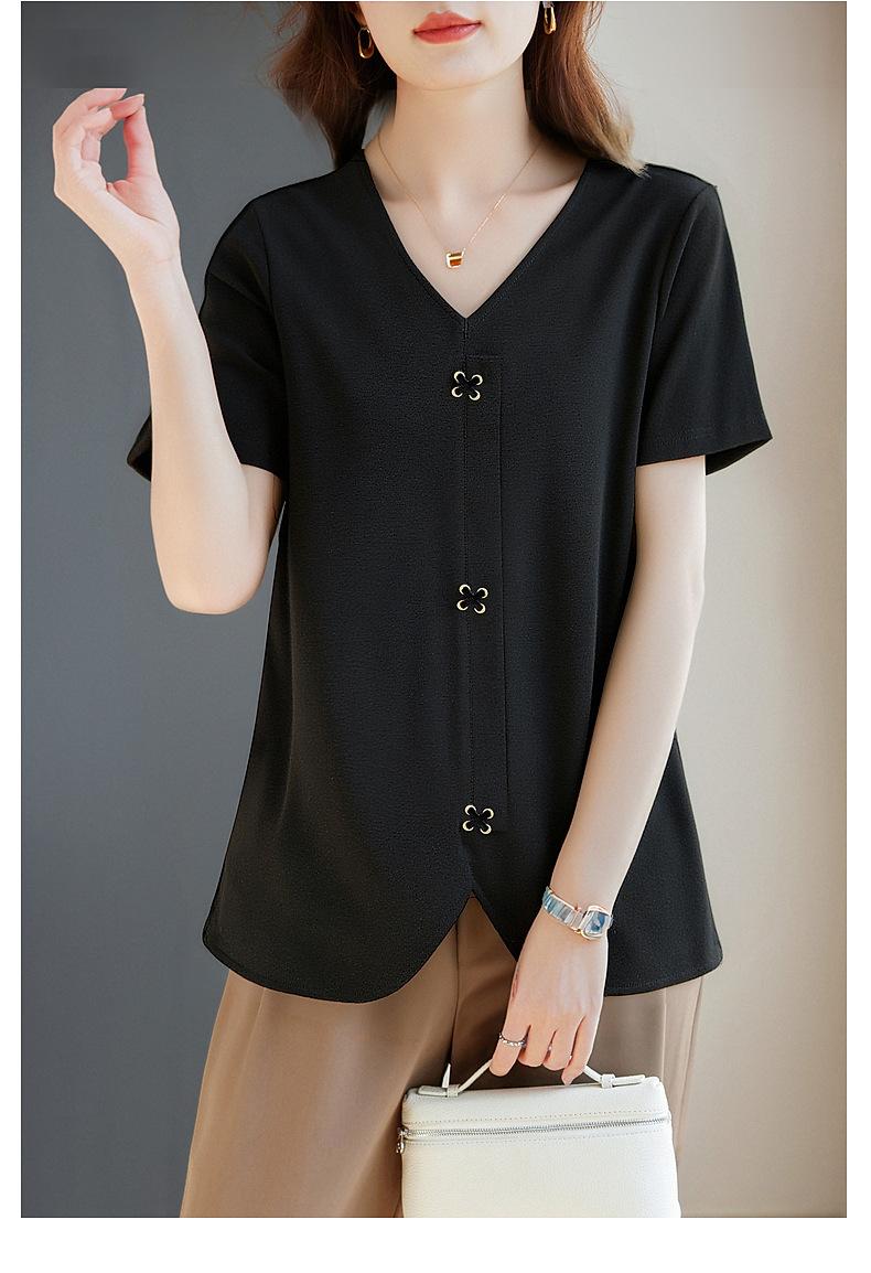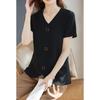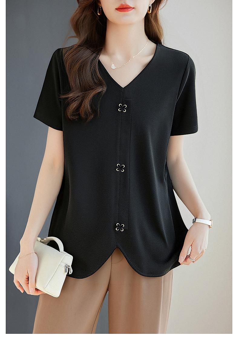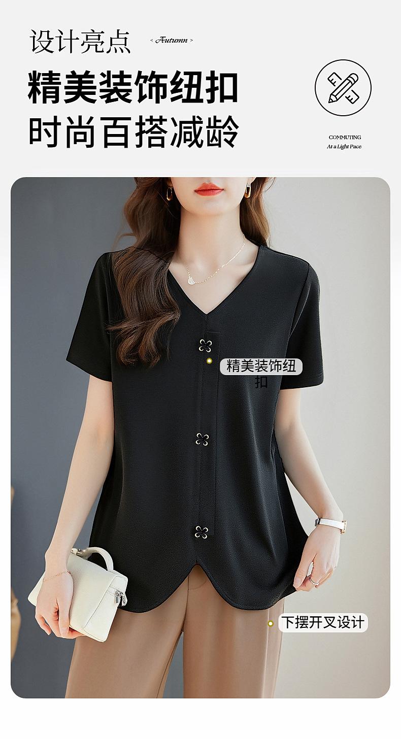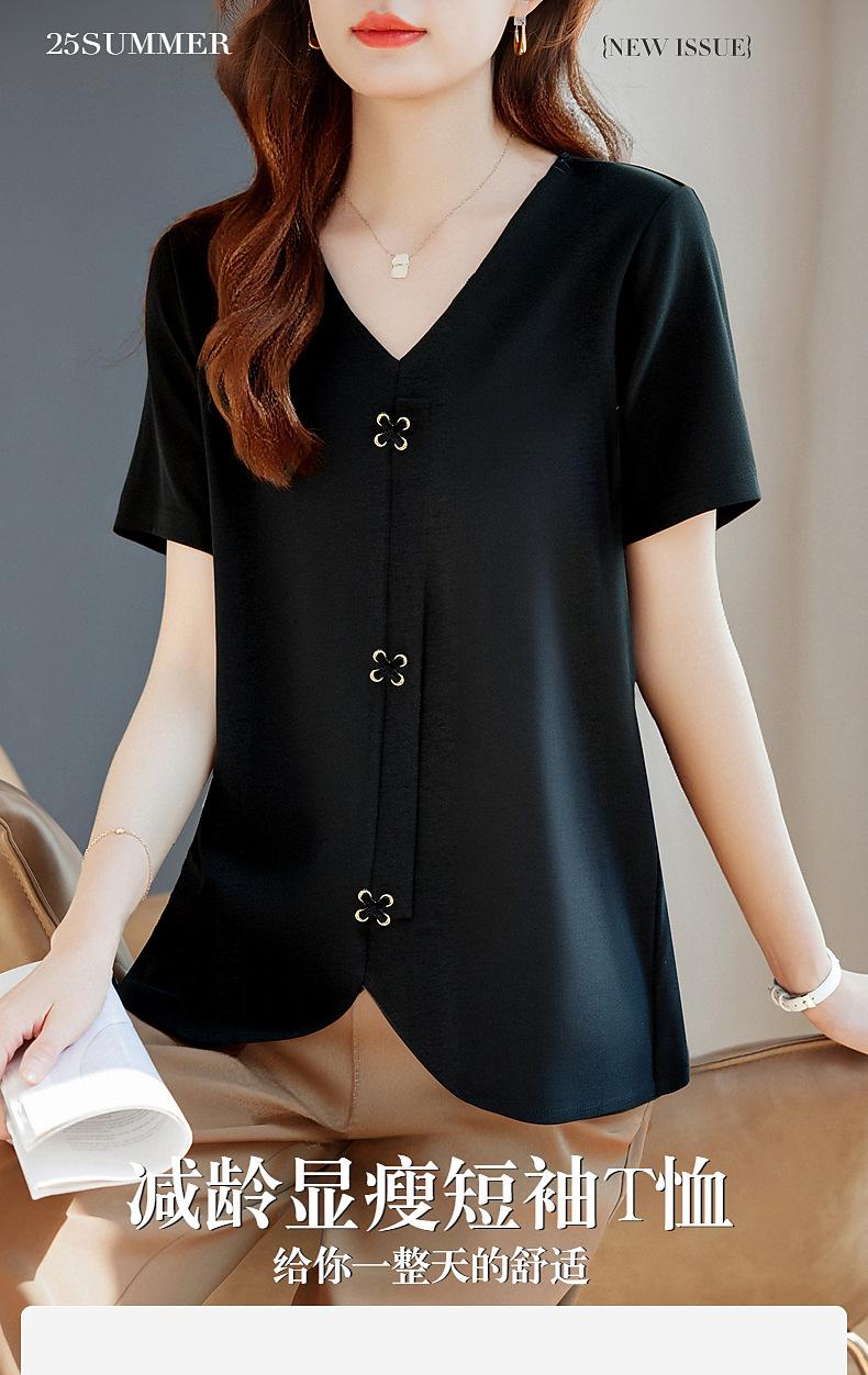 Playera Negra de Talla Grande de Manga Corta para Mujer 2025 Verano Nueva Llegada Madre de Mediana Edad Elegante Holgada Adelgazante Cuello en V Top de Moda