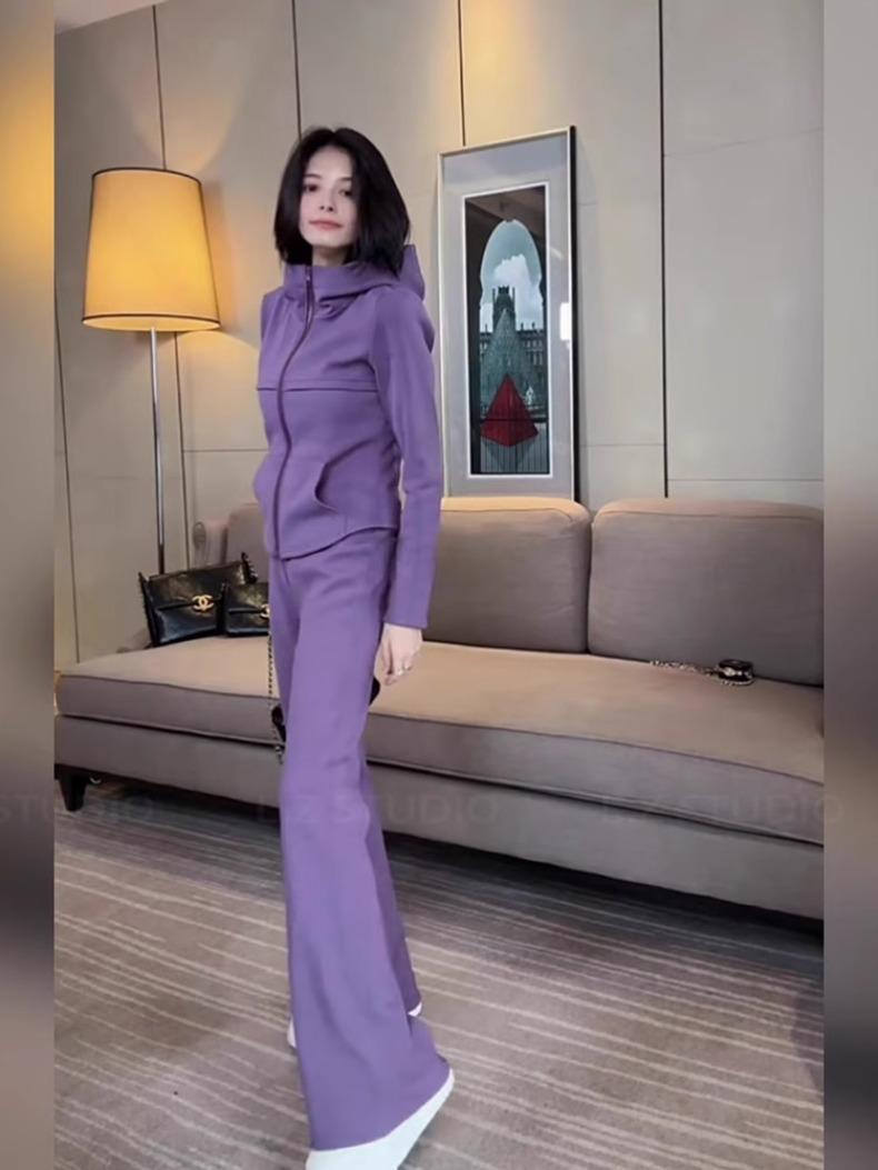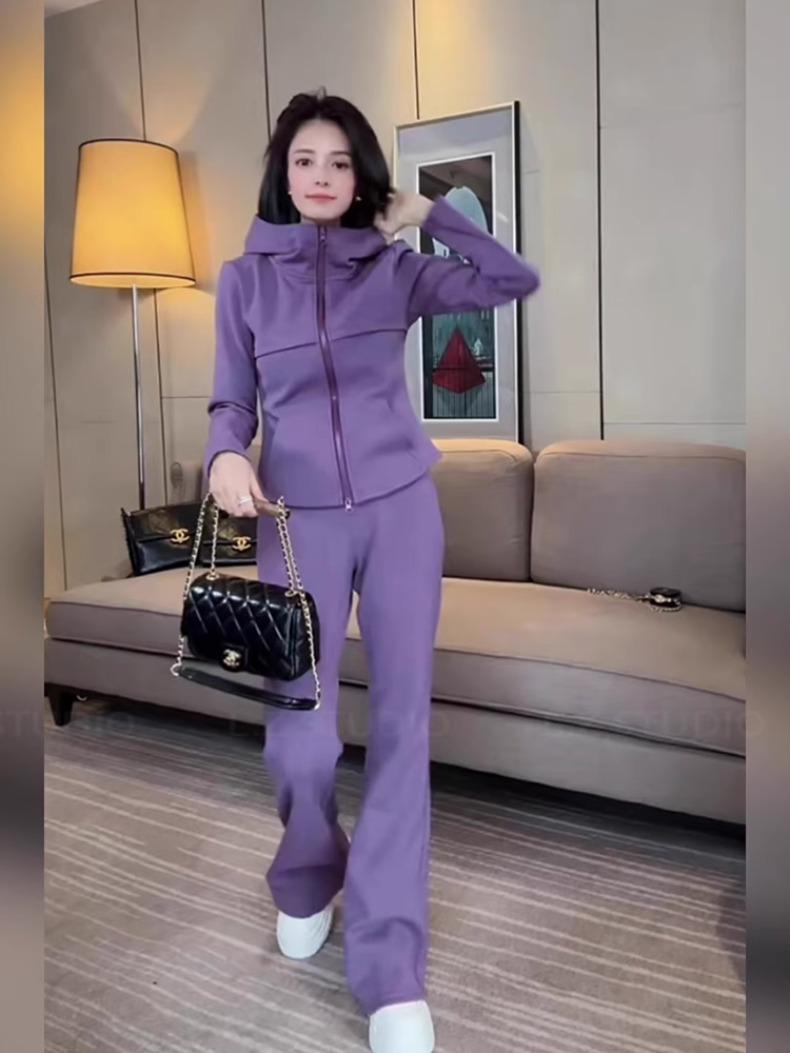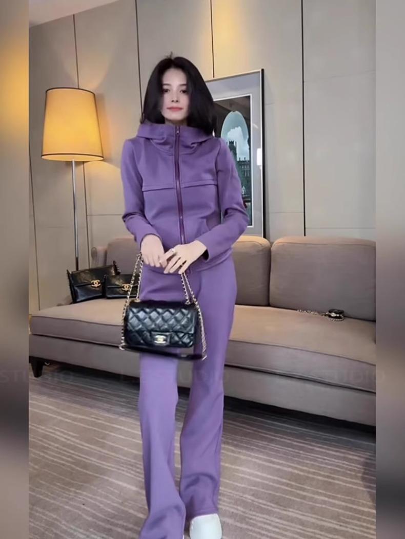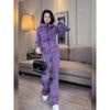 Otoño e Invierno de Alta Gama Pequeño Aroma Púrpura Casual Deportivo Sudadera con Cremallera Pantalón Recto Traje Conjunto de Dos Piezas para Mujer Lujo Ligero