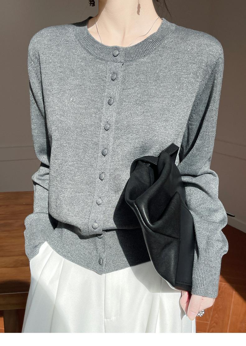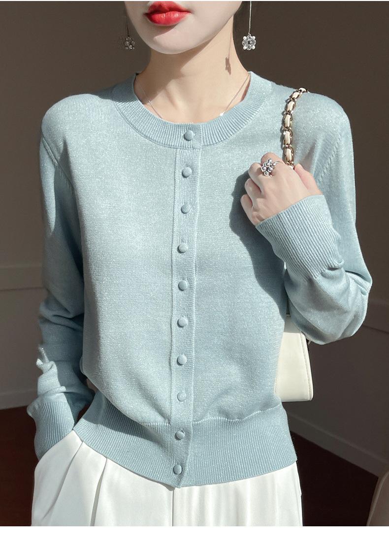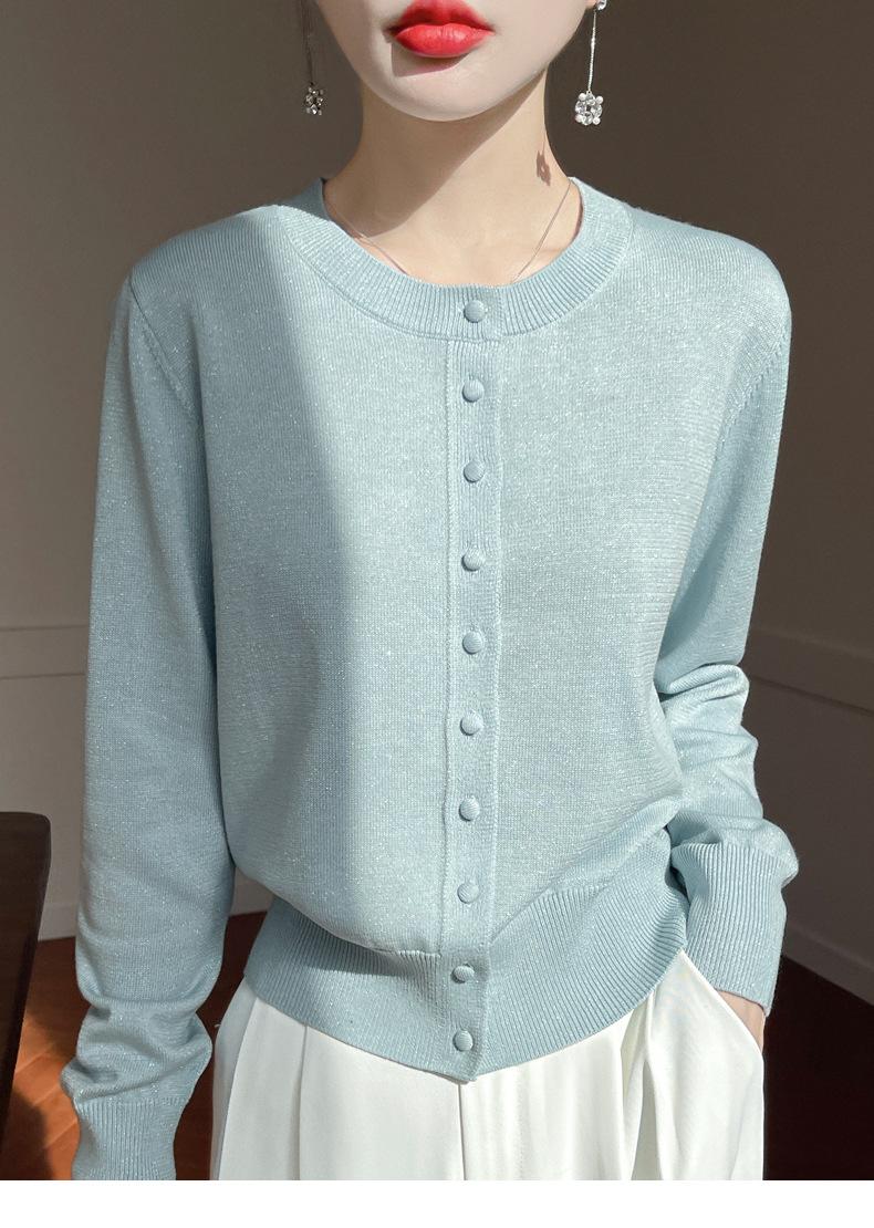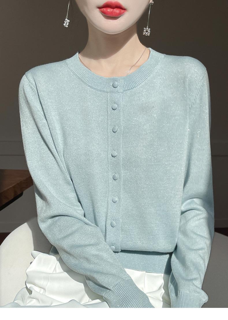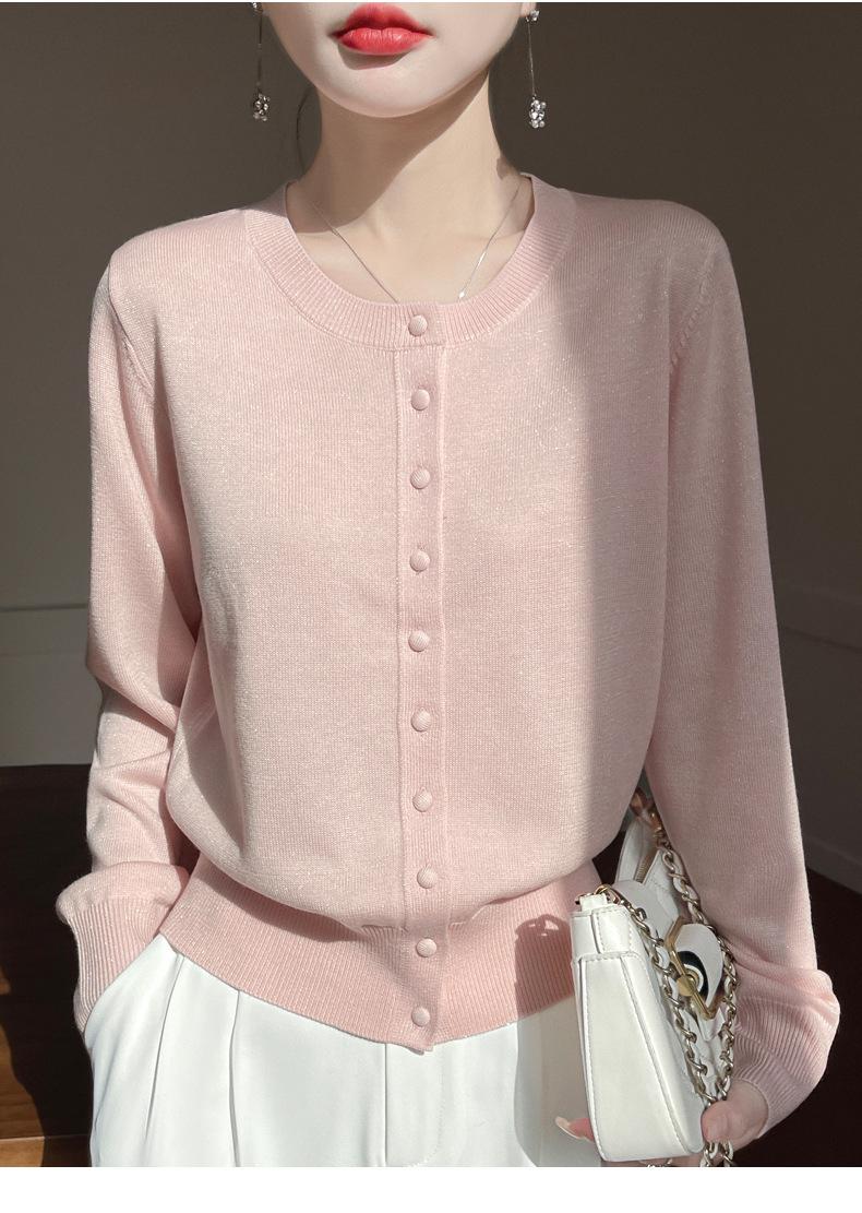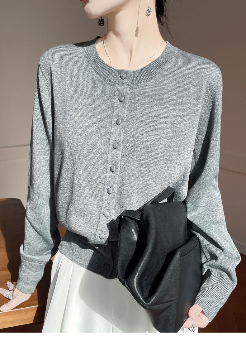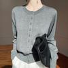 Chaqueta holgada de lana peinada con cuello redondo, de punto, con hebilla, de color liso y seda brillante, para mujer, primavera 2025