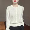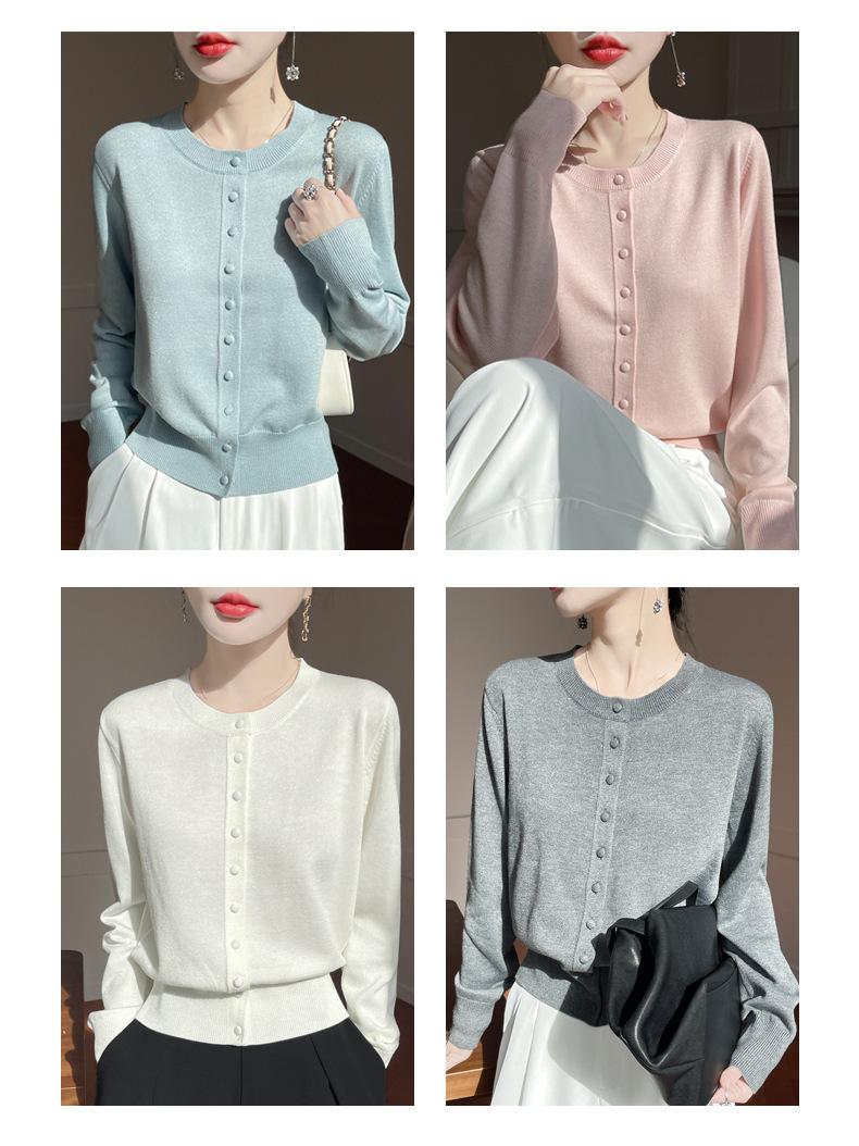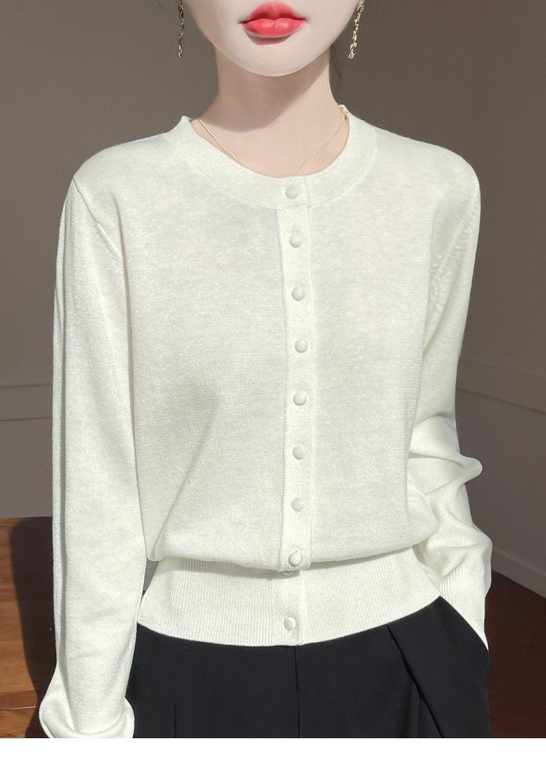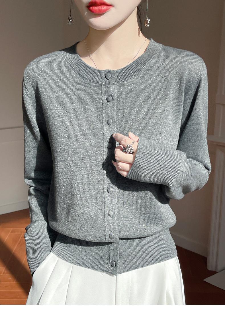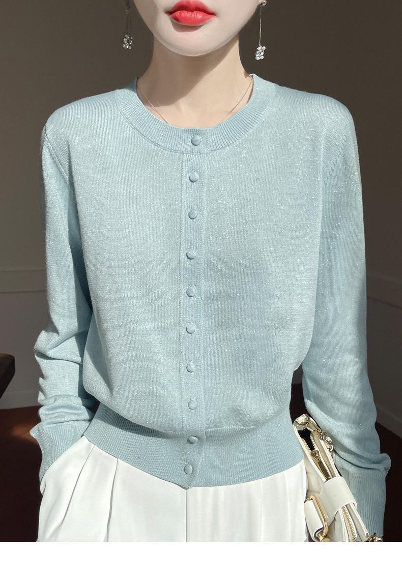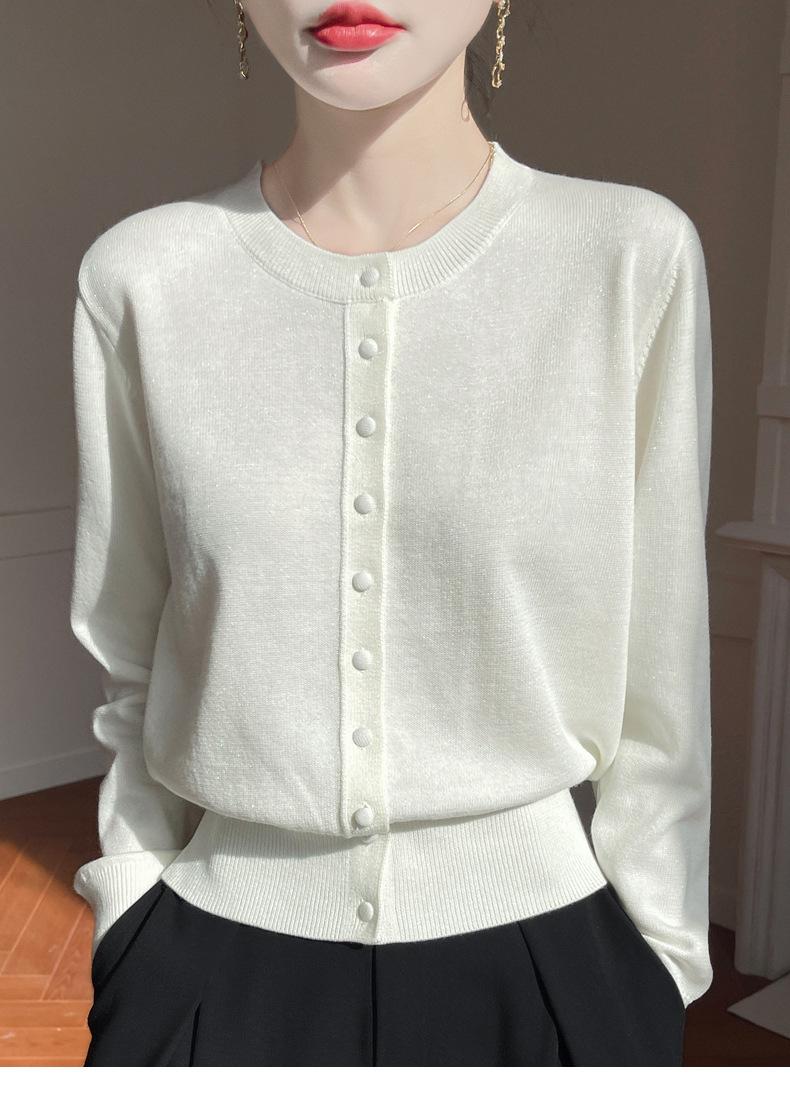 Chaqueta holgada de lana peinada con cuello redondo, de punto, con hebilla, de color liso y seda brillante, para mujer, primavera 2025