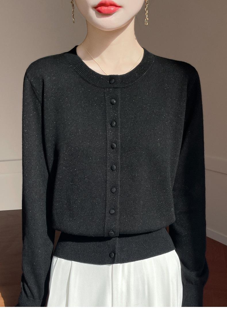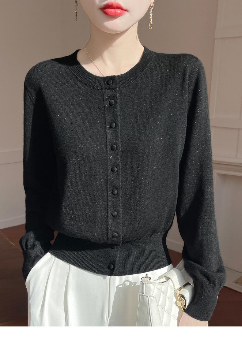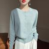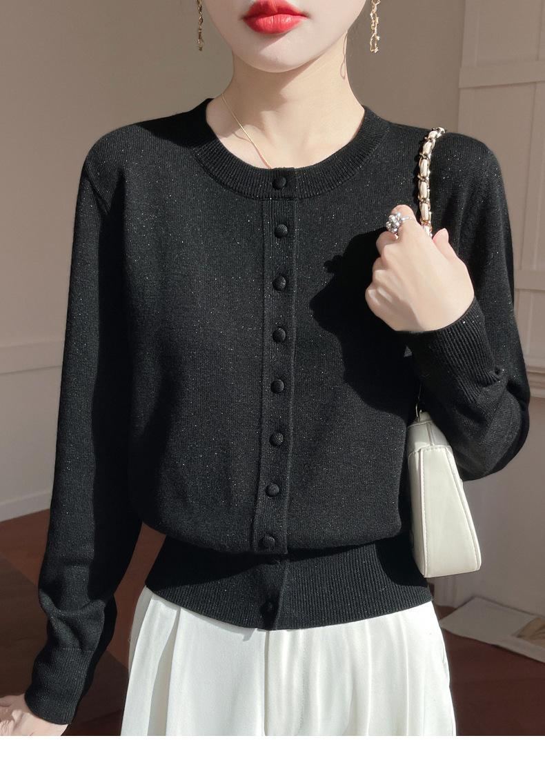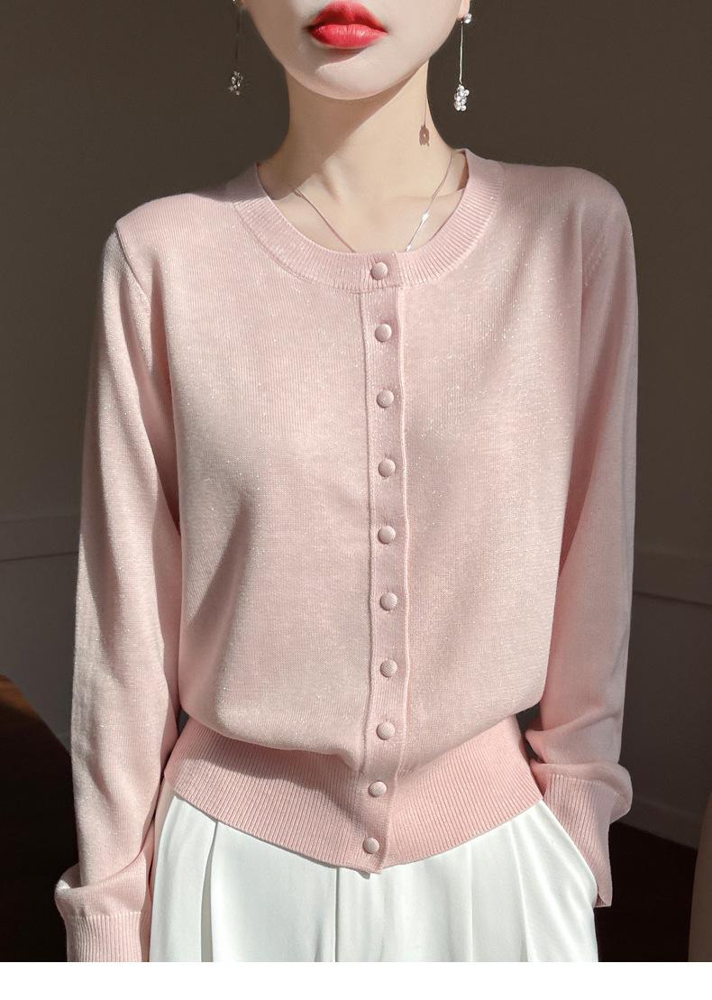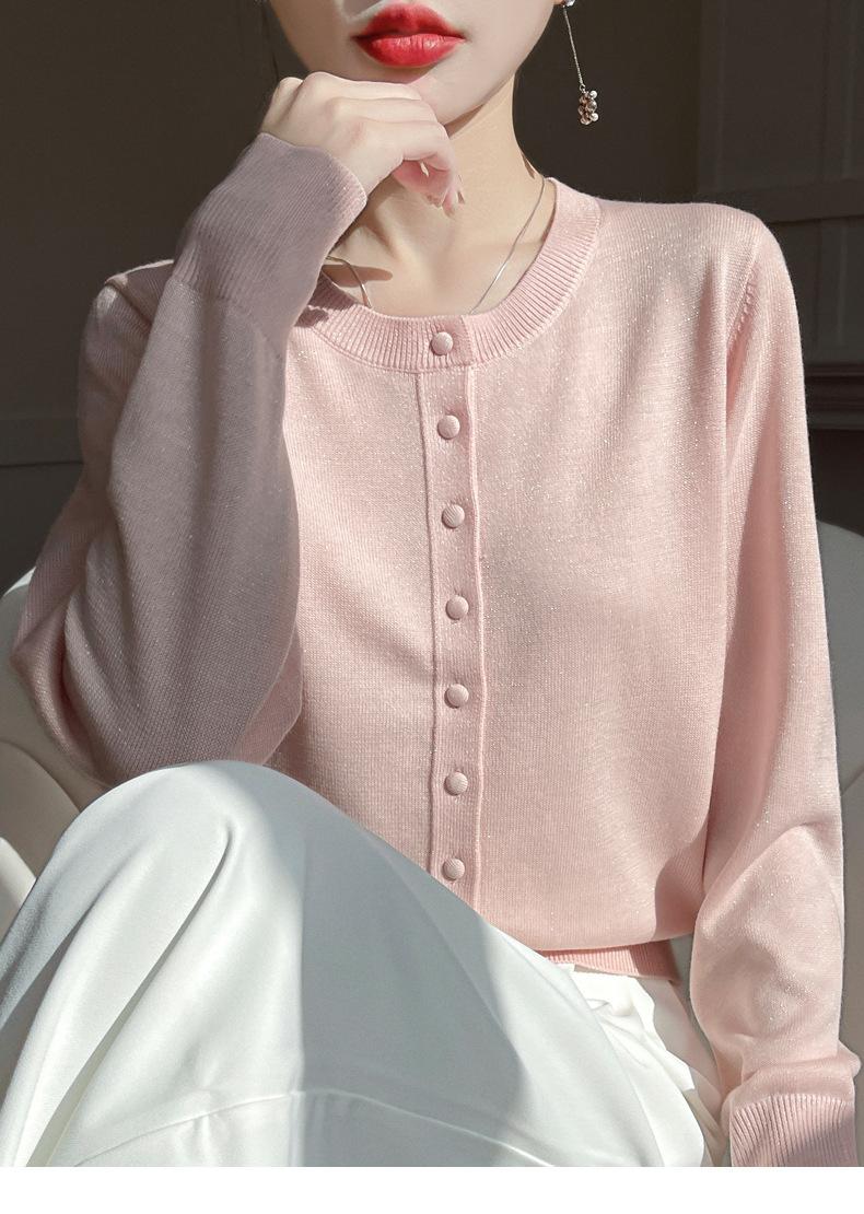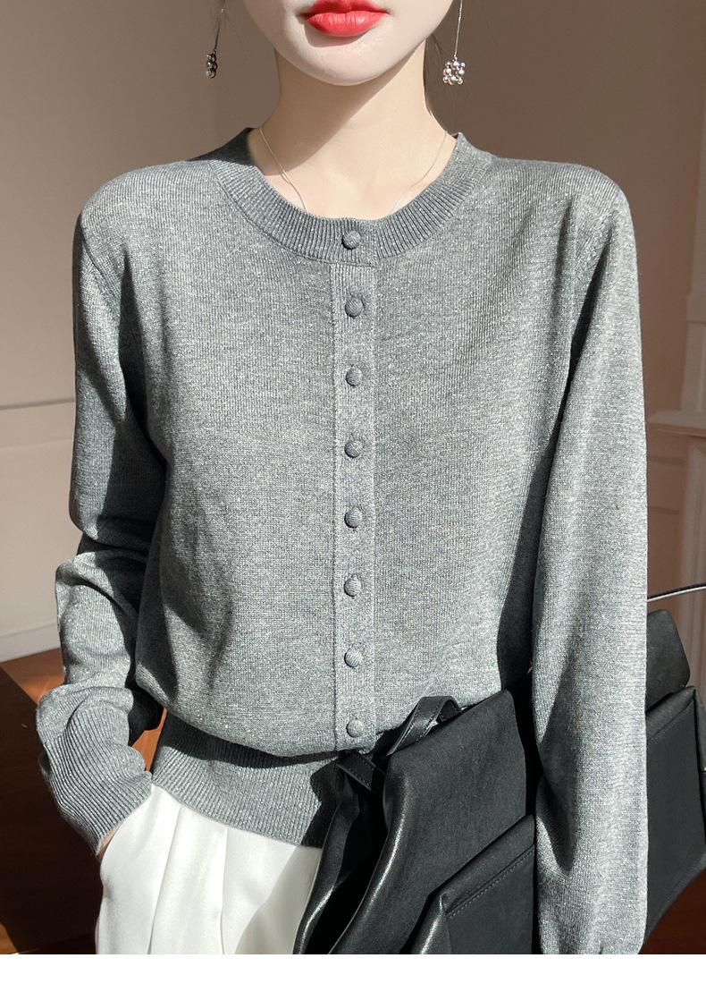 Chaqueta holgada de lana peinada con cuello redondo, de punto, con hebilla, de color liso y seda brillante, para mujer, primavera 2025