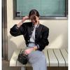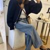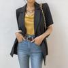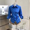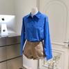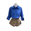 Camisa Coreana de Gama Alta para Mujer Dongdaemun Azul Klein de Manga Larga + Shorts Casuales de Mezclilla Caqui
