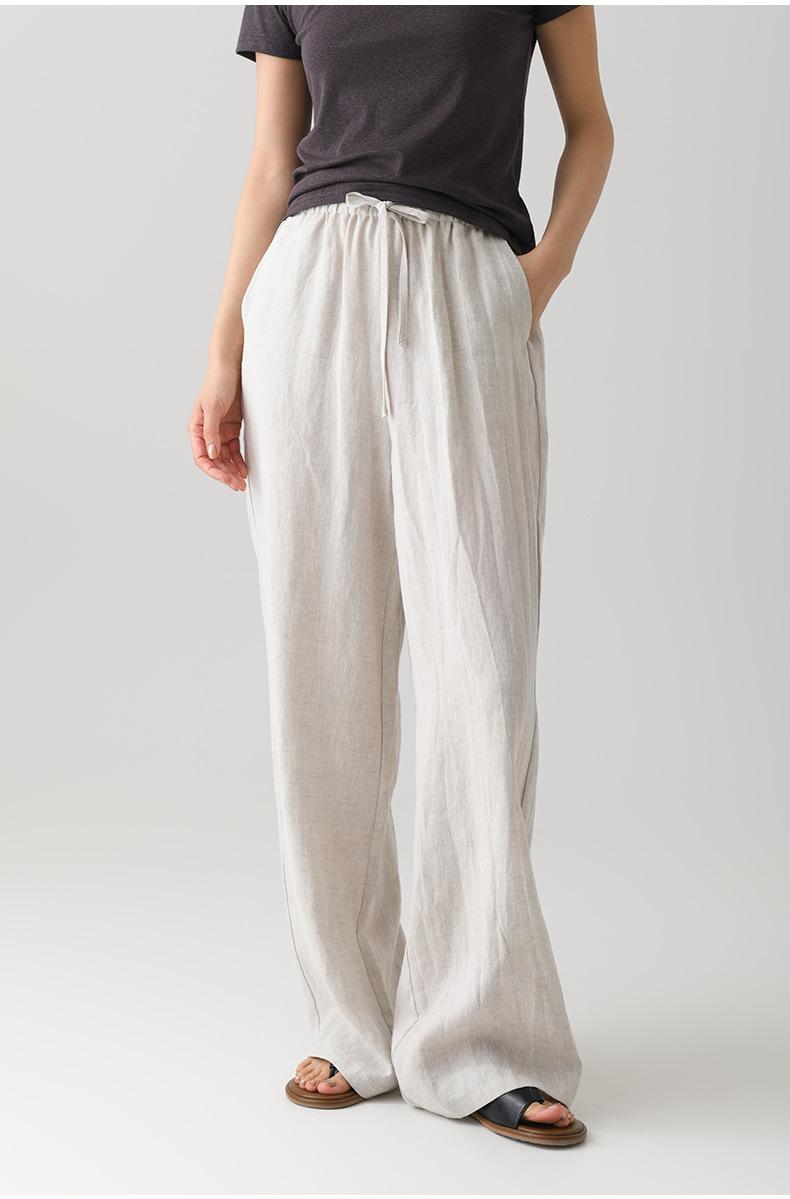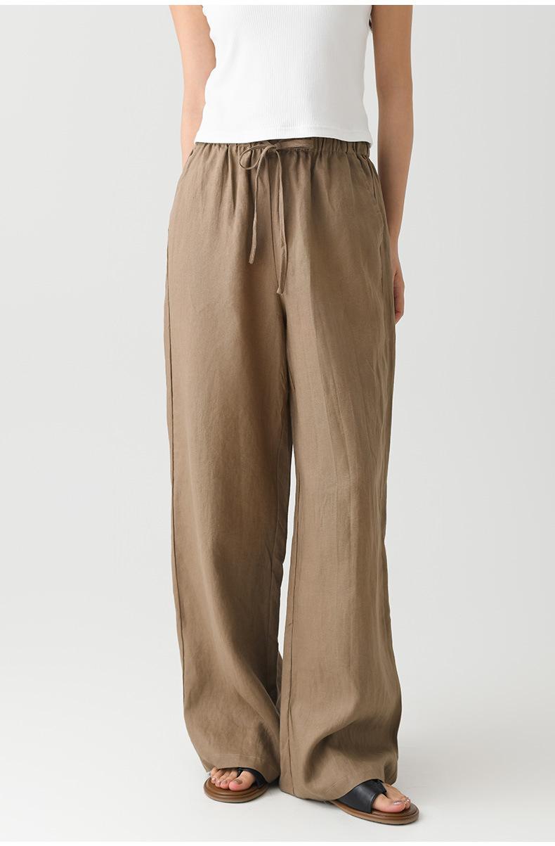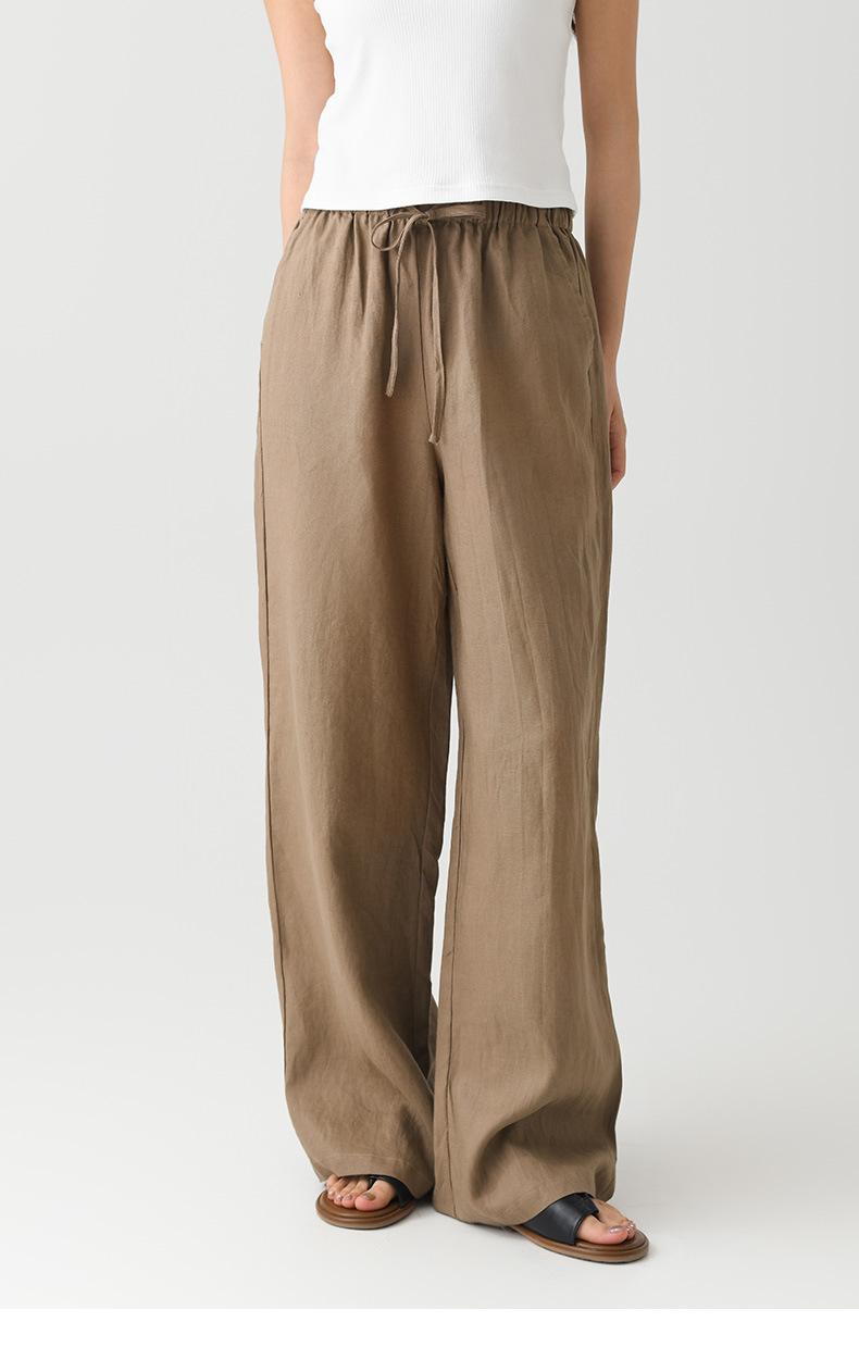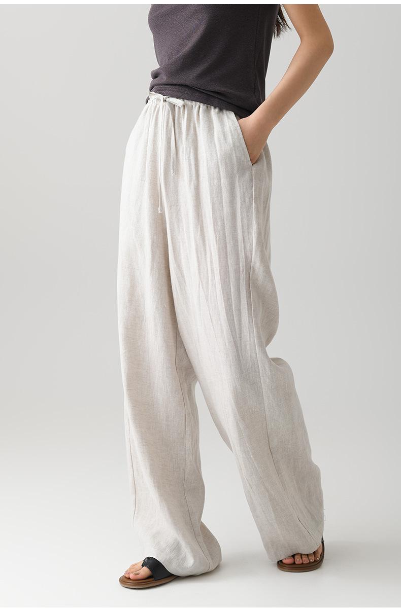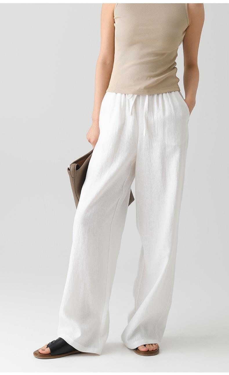 Verano Nuevo Pantalón de Lino para Mujer de Cintura Alta Drapeado Slim Pierna Ancha Casual Suelto con Cordón Recto Largo hasta el Piso