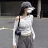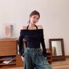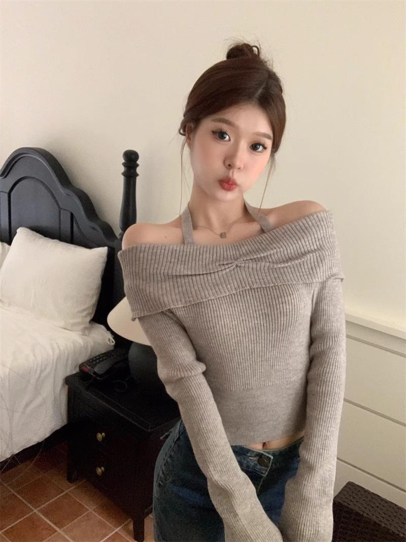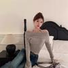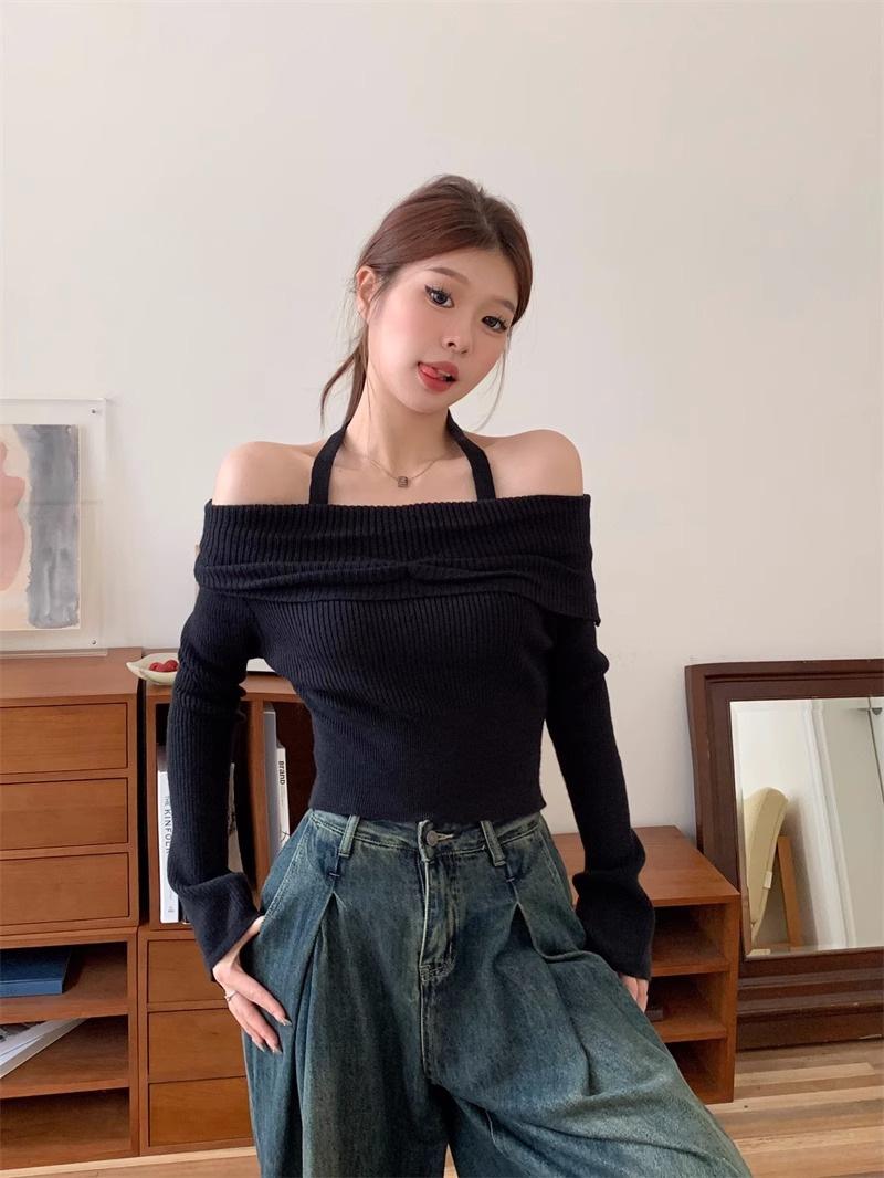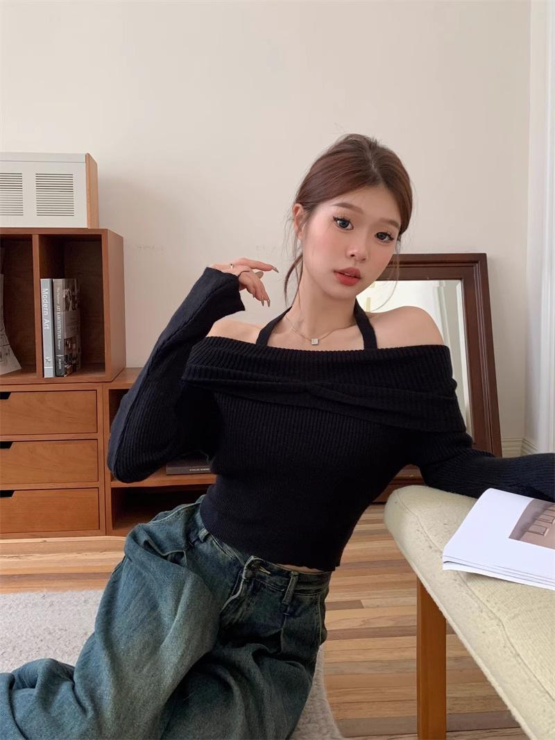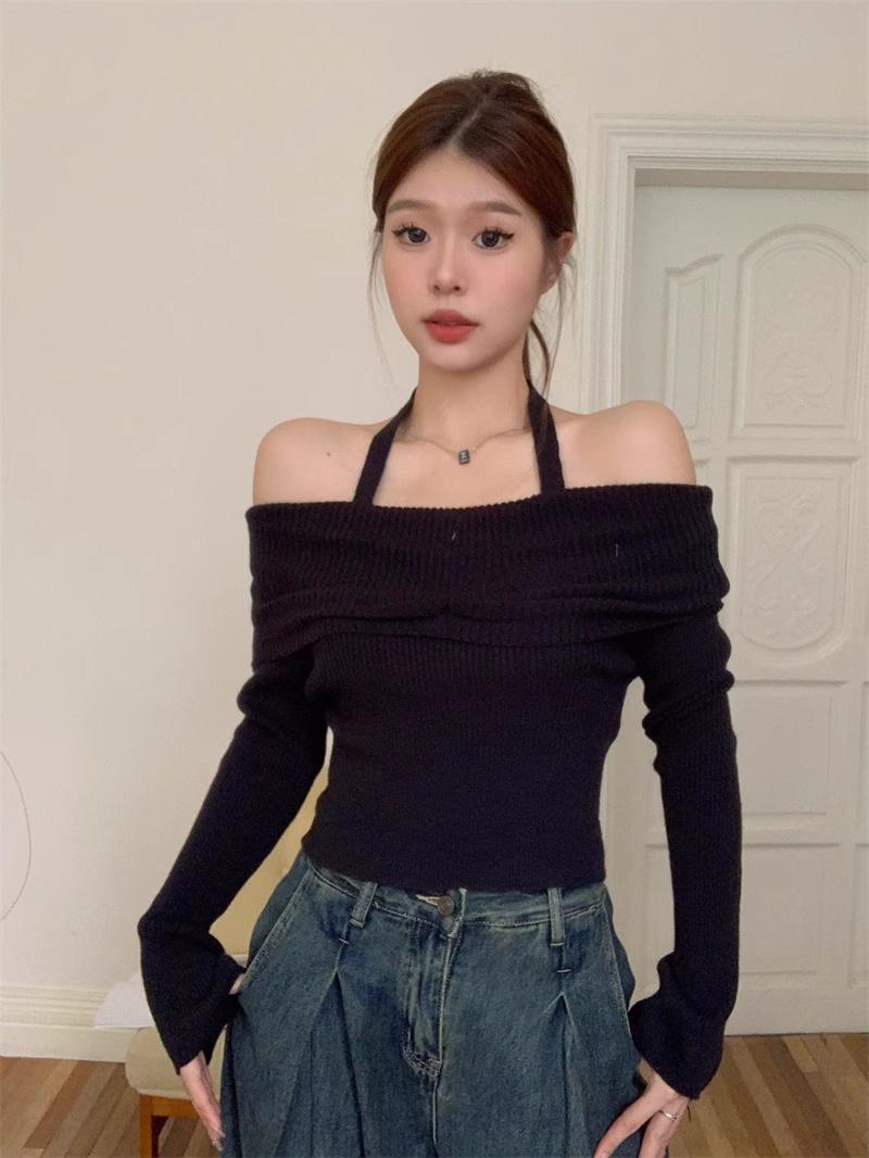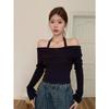 Otoño Estilo Deseo Puro Colgante Cuello Moda Nuevo Estilo Spice Girls Ajustado Adelgazante Hombros Descubiertos Camiseta Manga Larga Nicho Top con Hombros Descubiertos