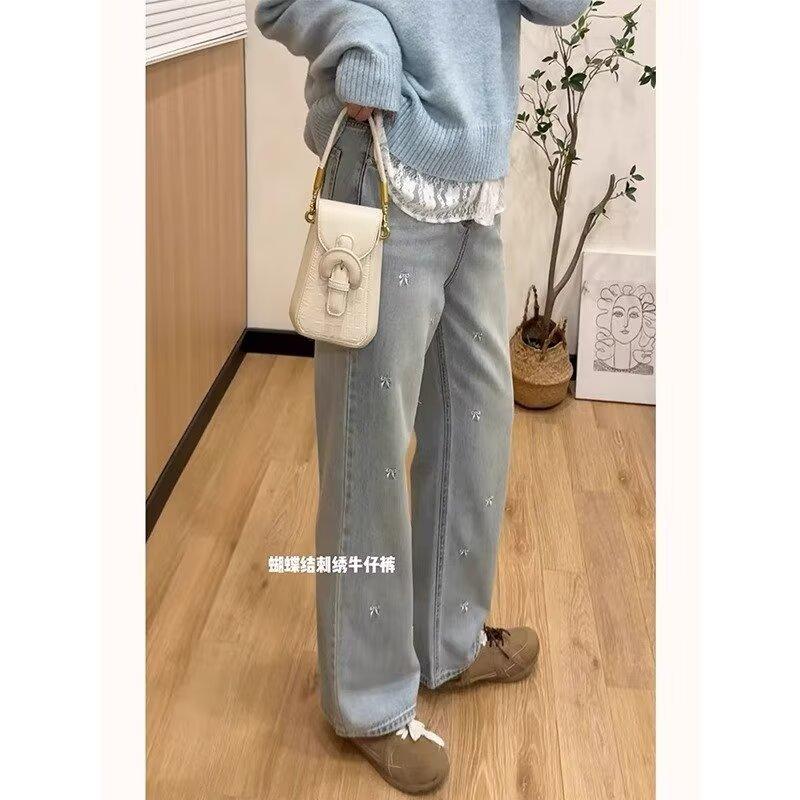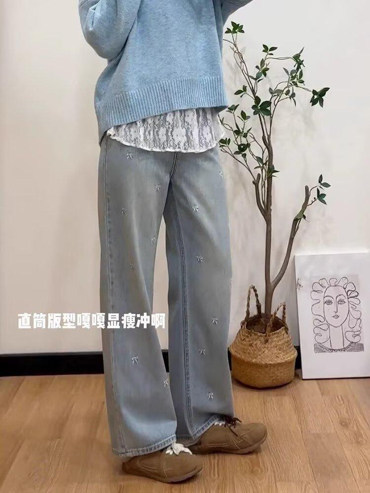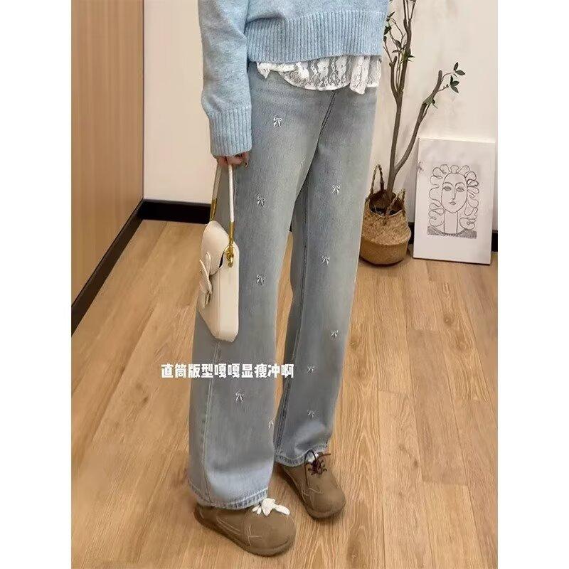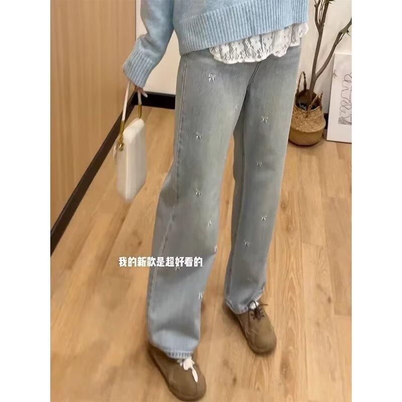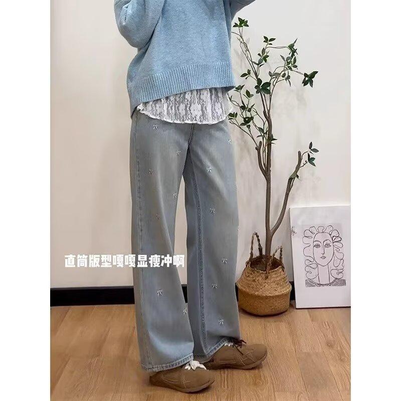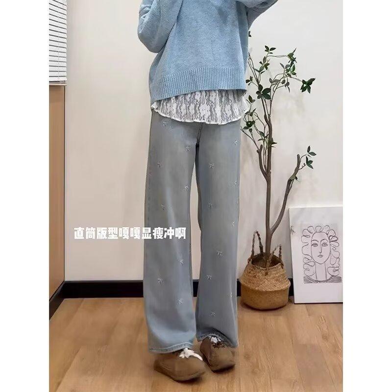 Jeans de pierna ancha azul claro para mujer Primavera 2025 Diseño de bordado de lazo estéreo Pantalones rectos largos hasta el suelo