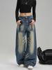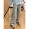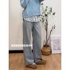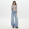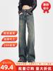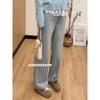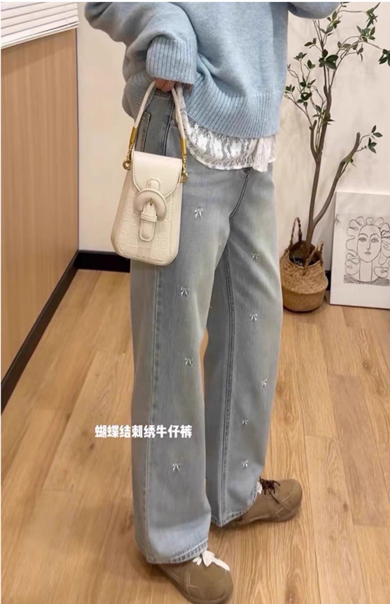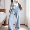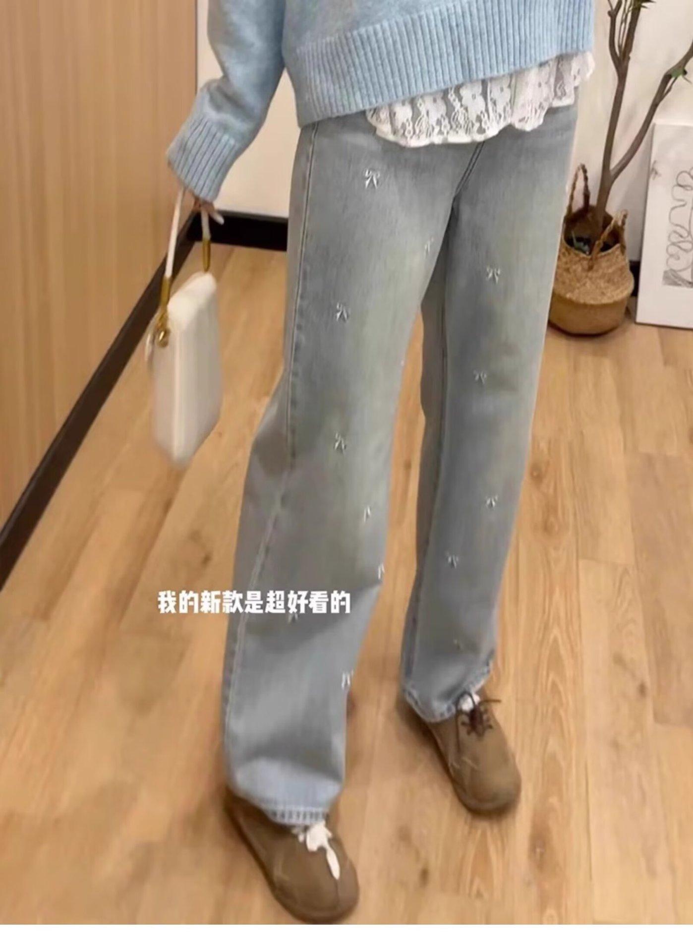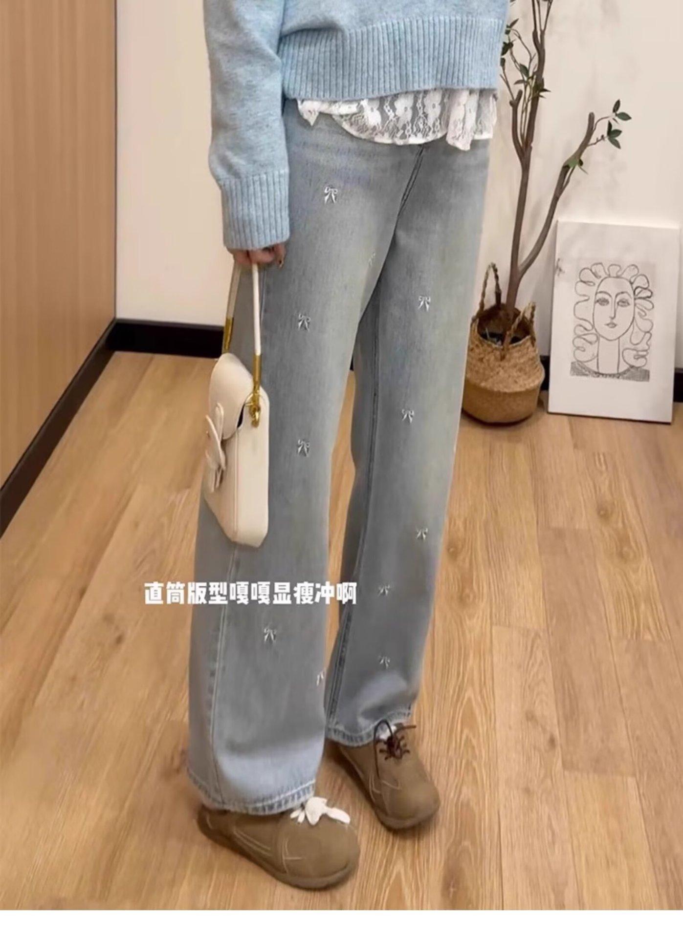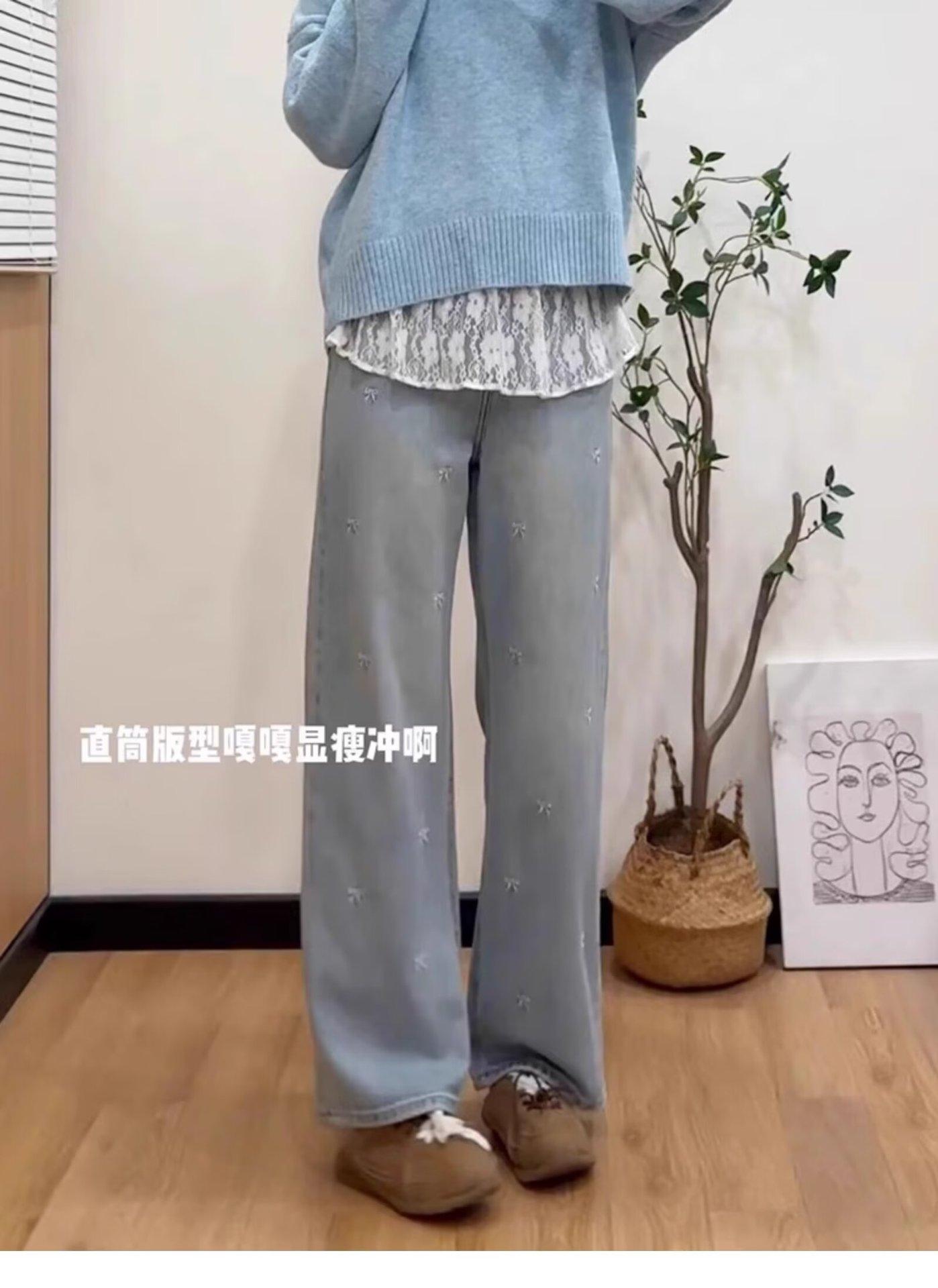 Jeans de pierna ancha azul claro para mujer Primavera 2025 Diseño de bordado de lazo estéreo Pantalones rectos largos hasta el suelo