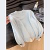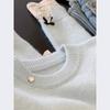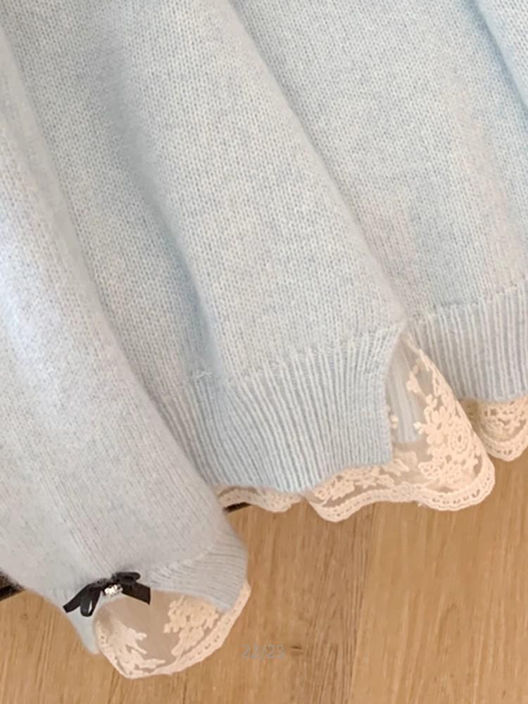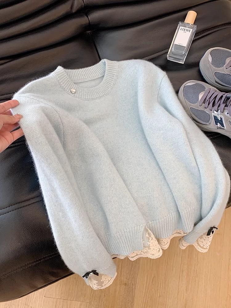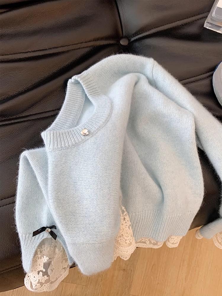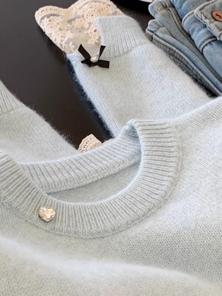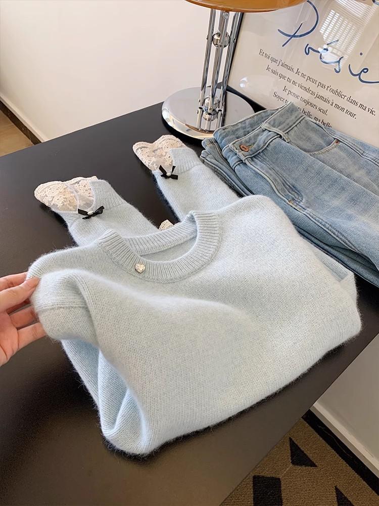 Suéter de punto encerado suave de leche azul con lazo Diseño de temperamento para mujer Sense Base Top ...