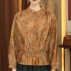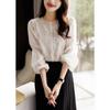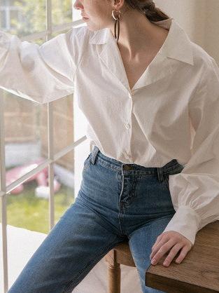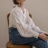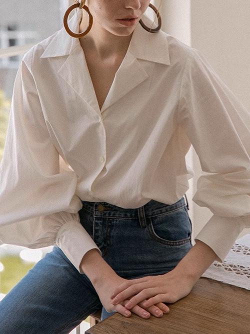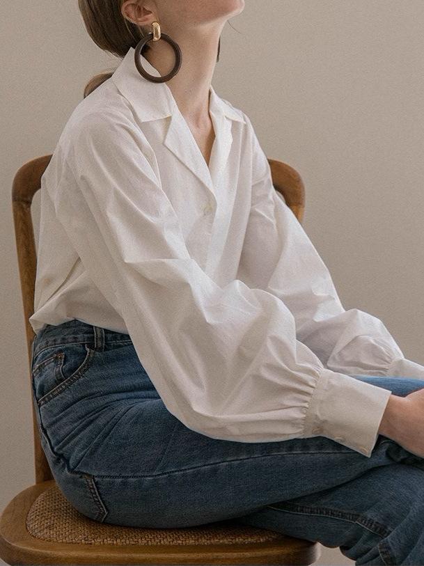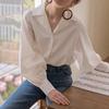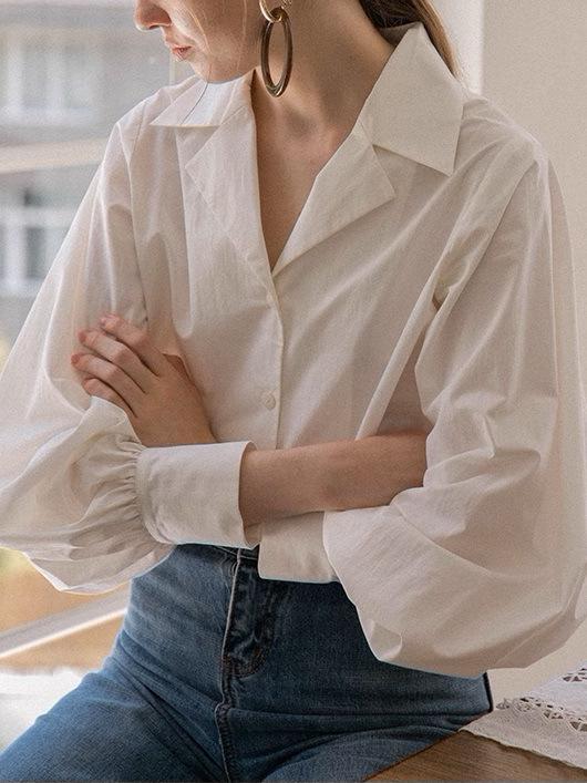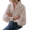 Diseño de Manga Linterna Top de Algodón de Manga Larga Traje de Otoño Cuello Camisero Camisa Blanca con Cuello en V Camisa Retro Francesa para Mujer