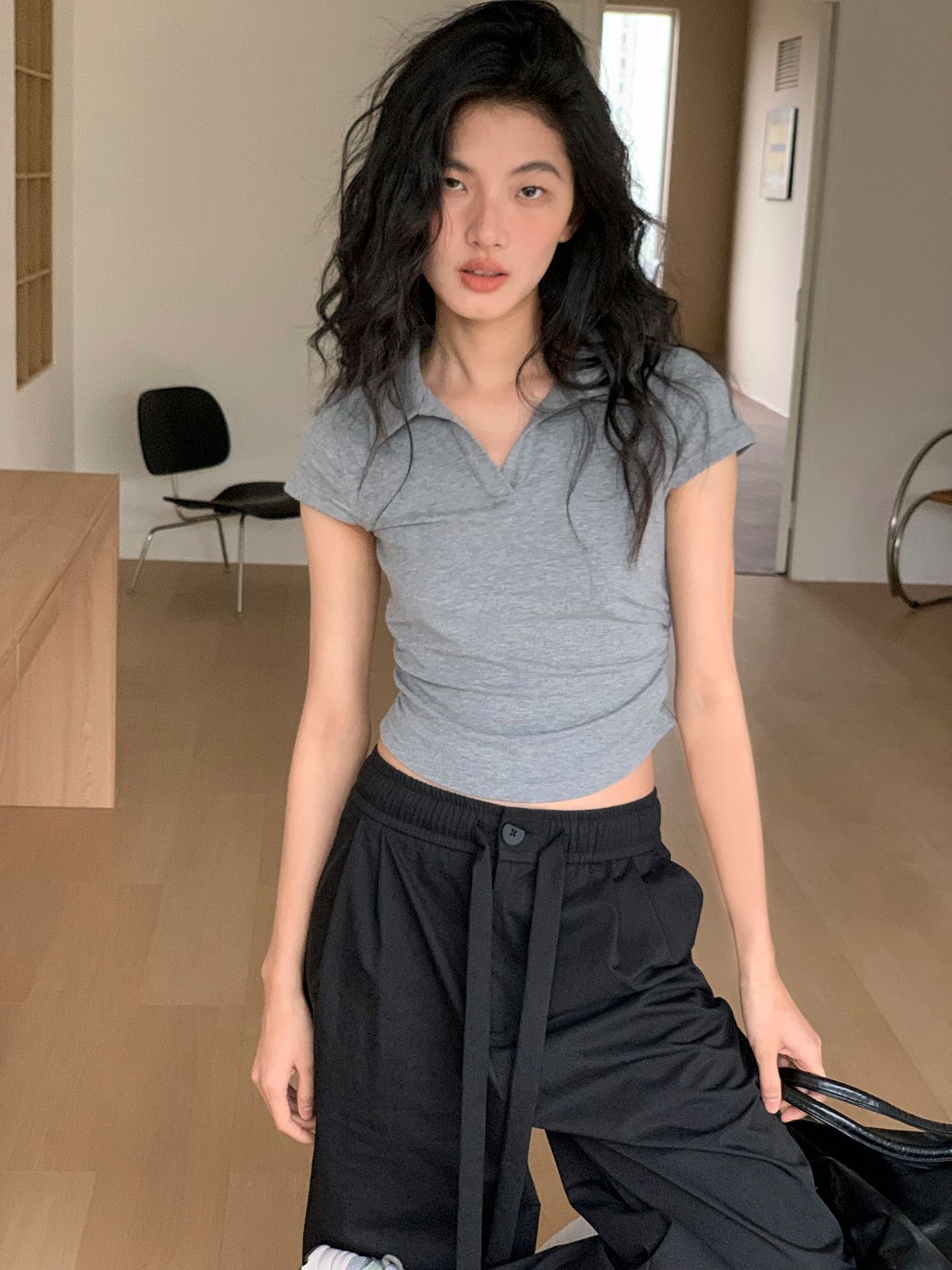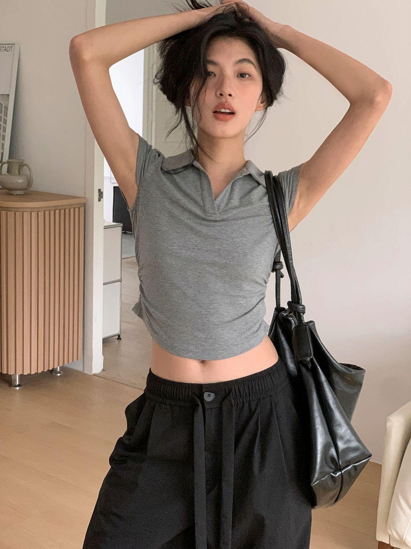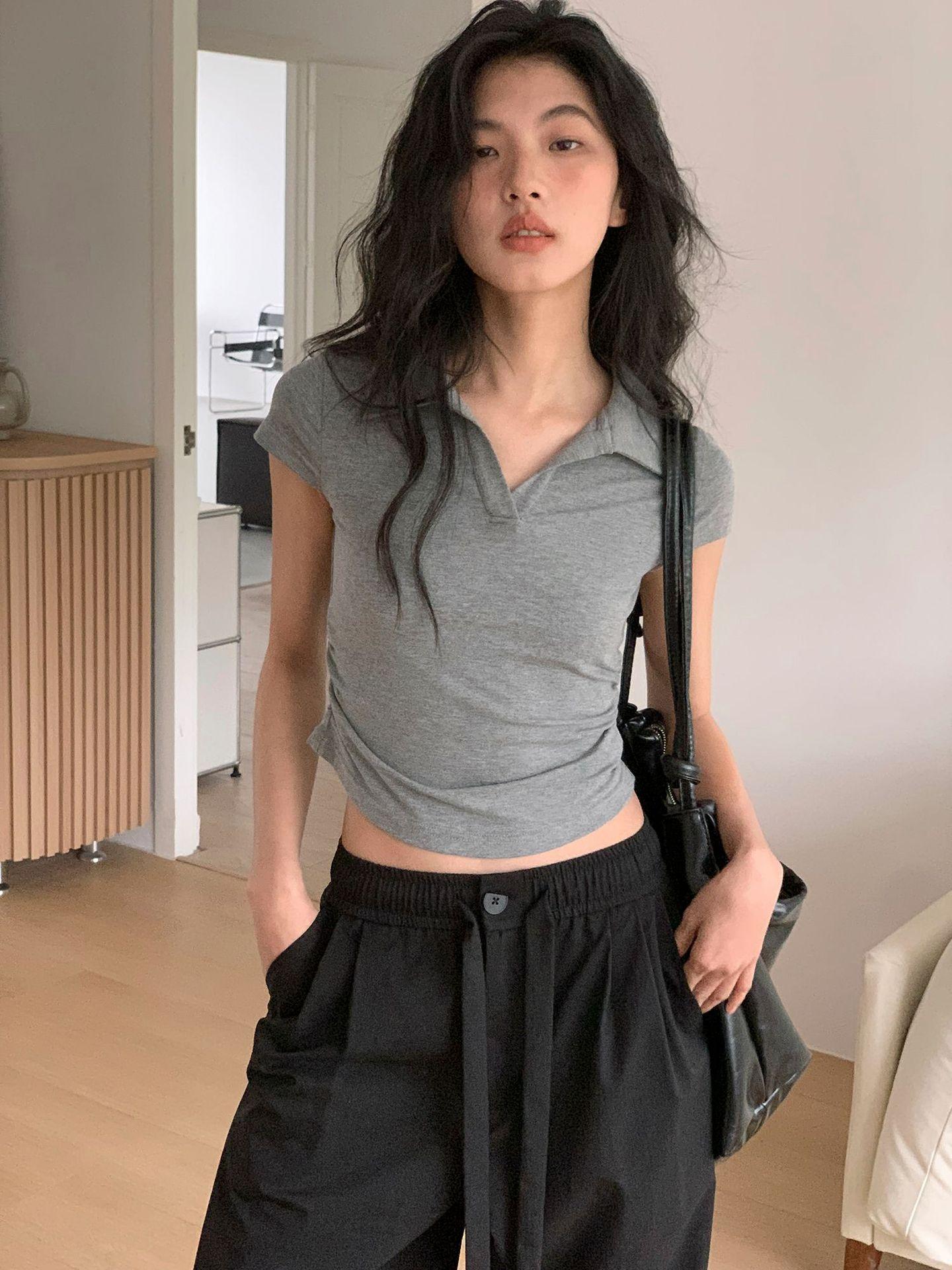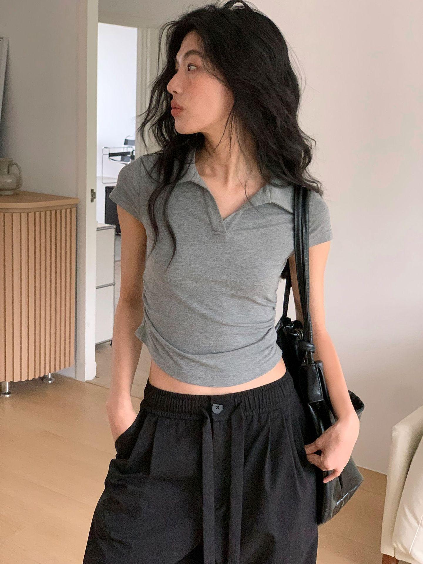Camiseta de verano para mujer, estilo americano, con cuello en V, manga corta, ajustada, plisada, color gris, con diseño de polo y cintura ajustada.
