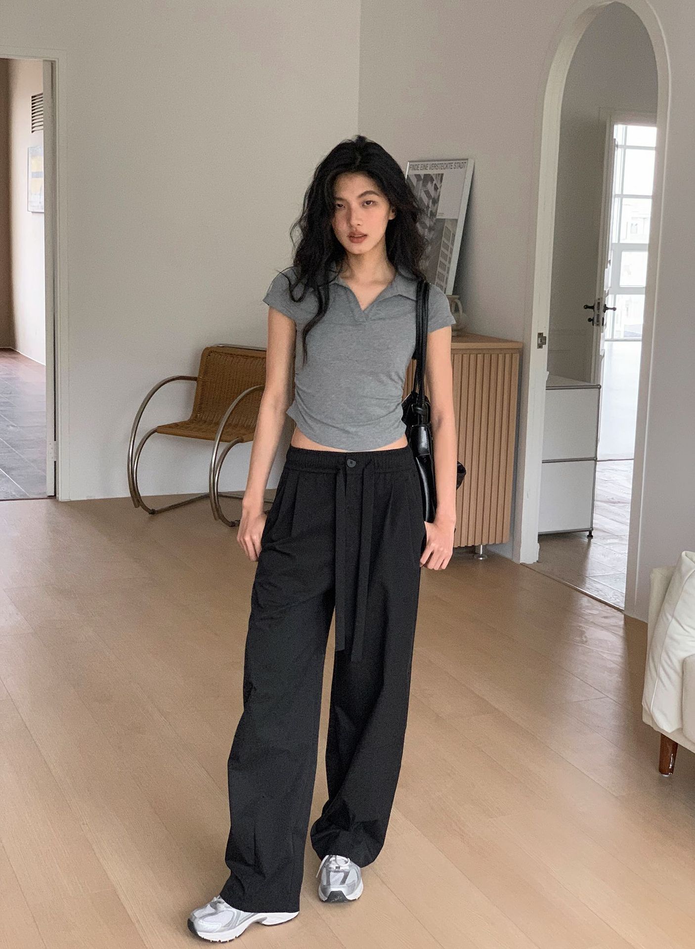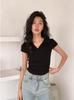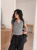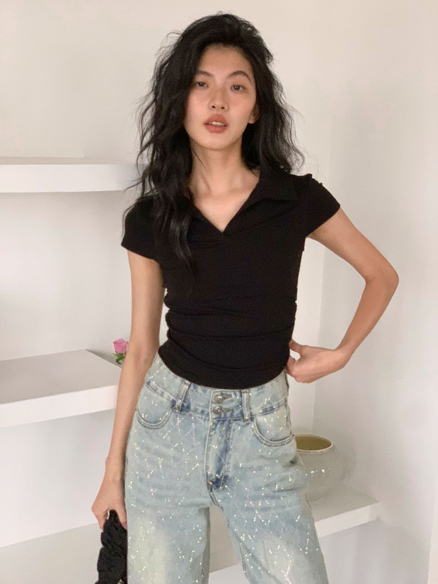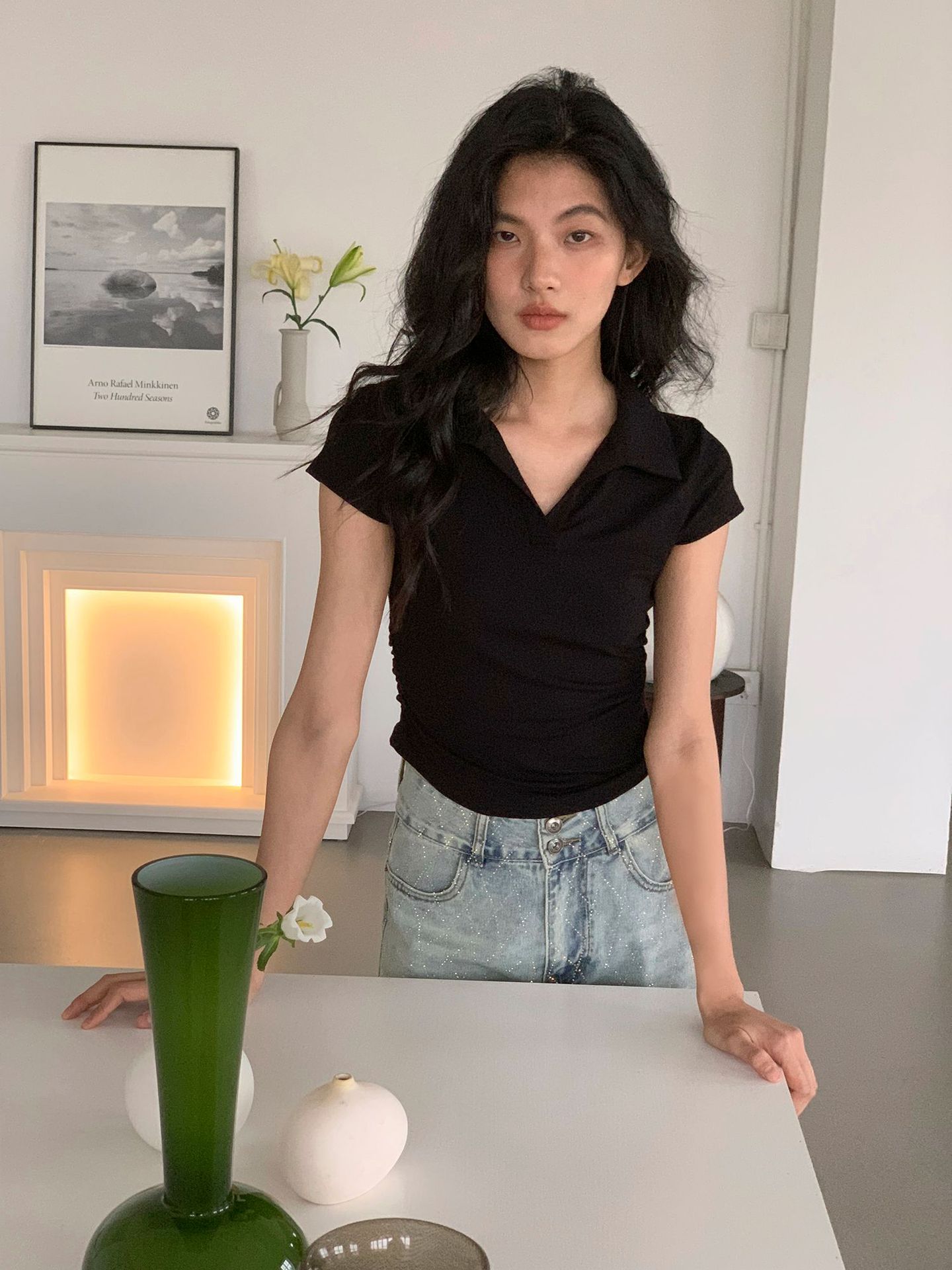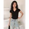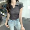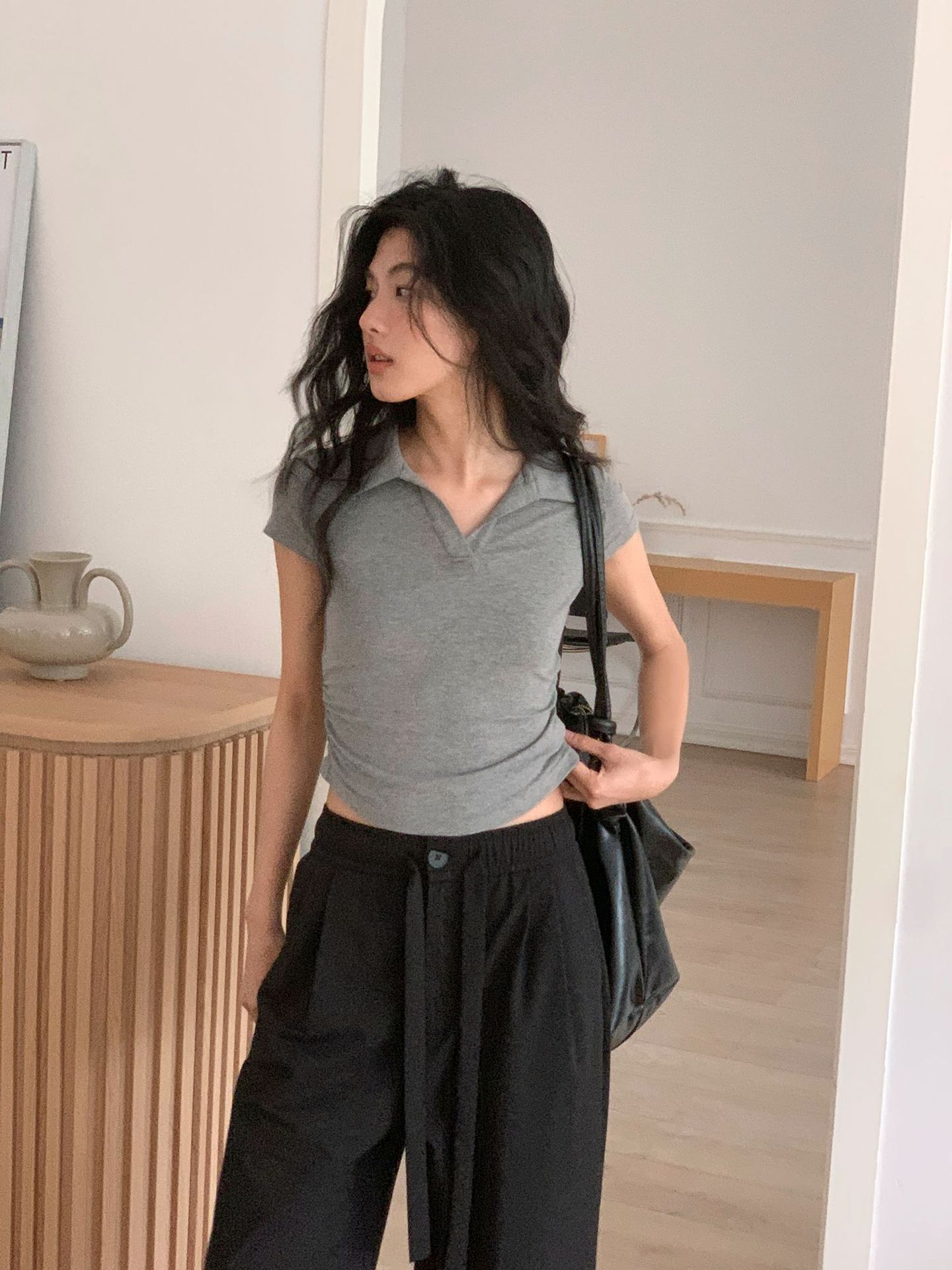 Camiseta de verano para mujer, estilo americano, con cuello en V, manga corta, ajustada, plisada, color gris, con diseño de polo y cintura ajustada.