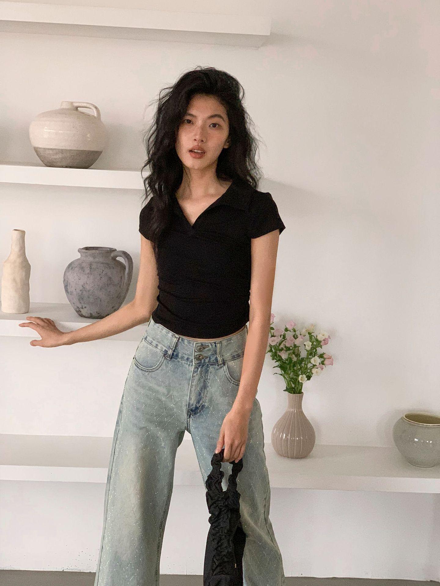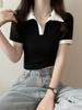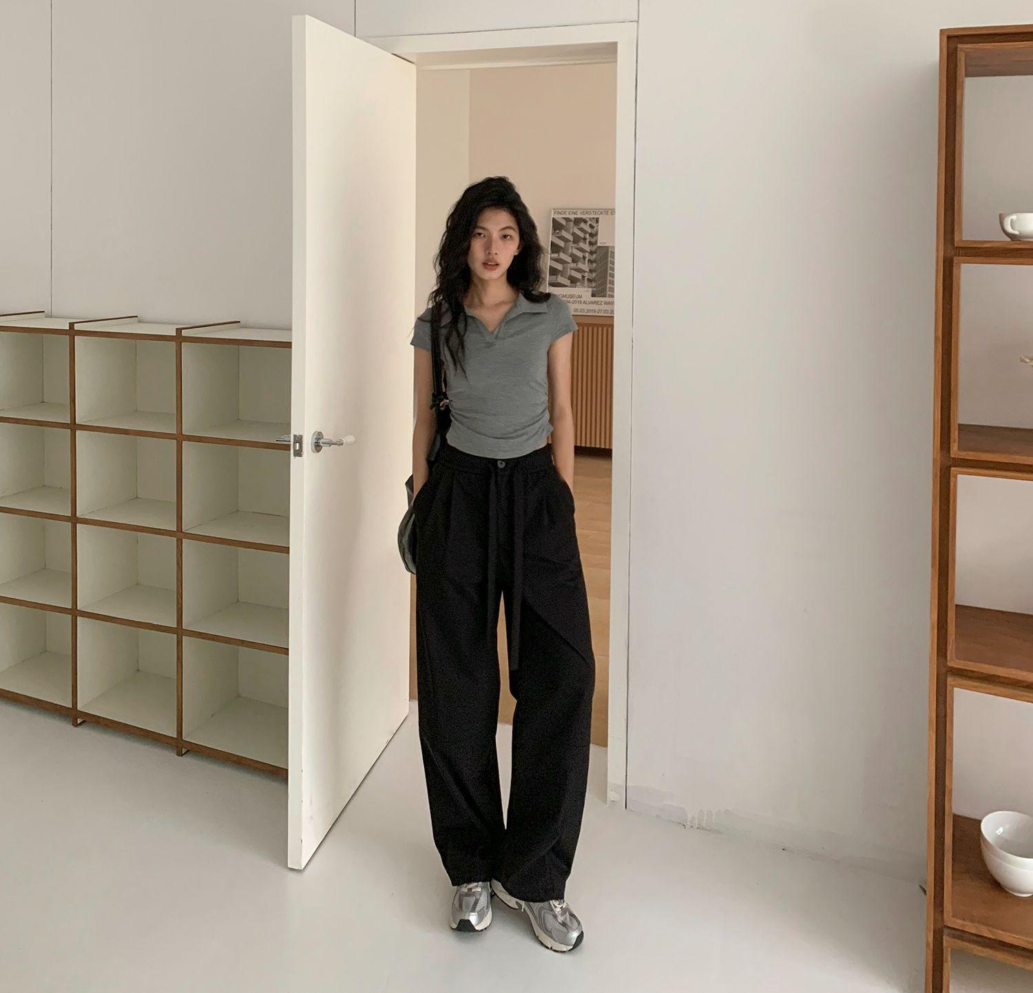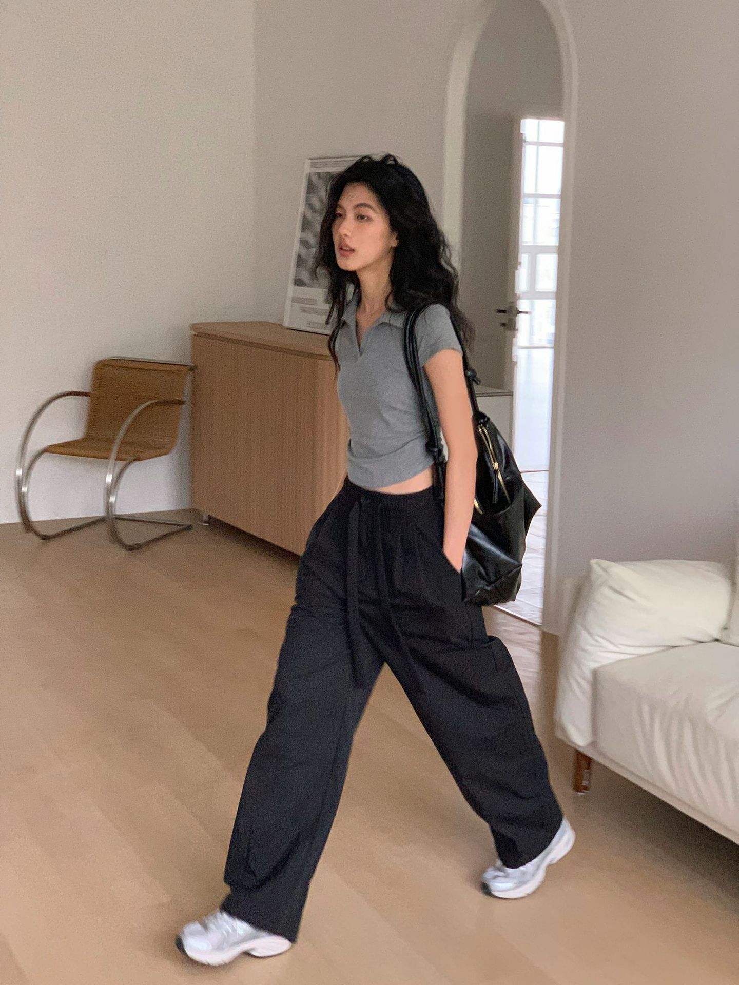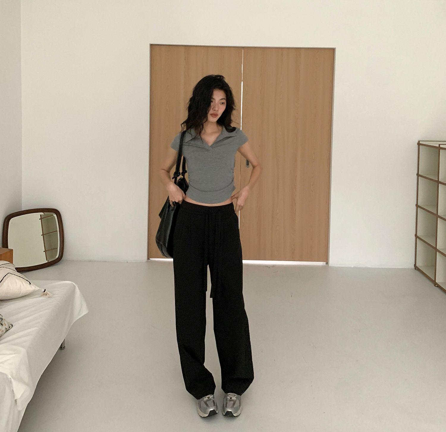 Camiseta de verano para mujer, estilo americano, con cuello en V, manga corta, ajustada, plisada, color gris, con diseño de polo y cintura ajustada.