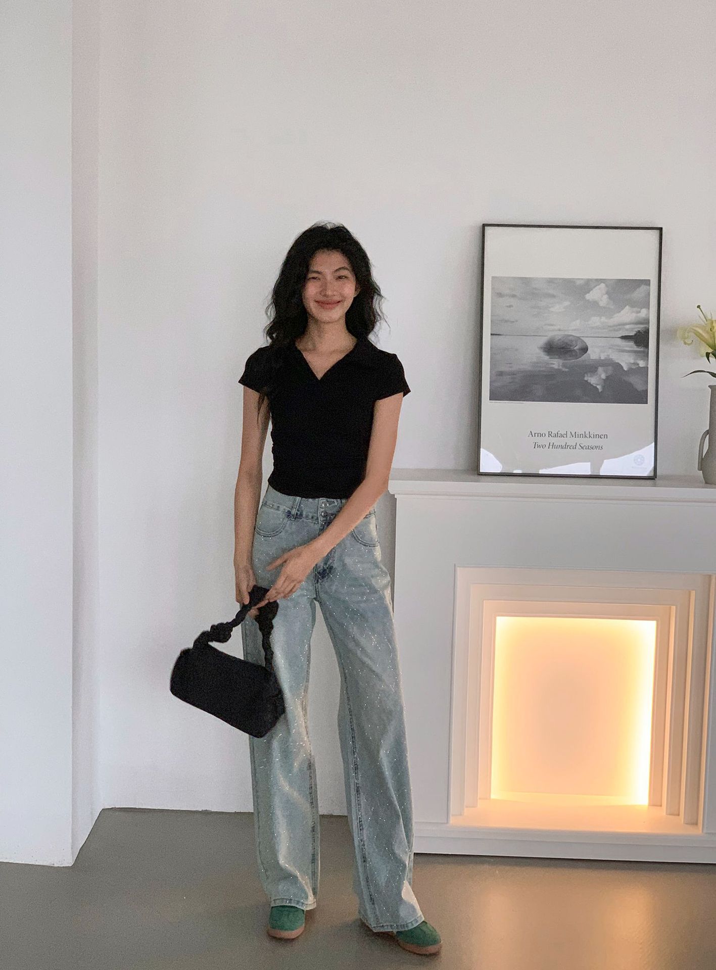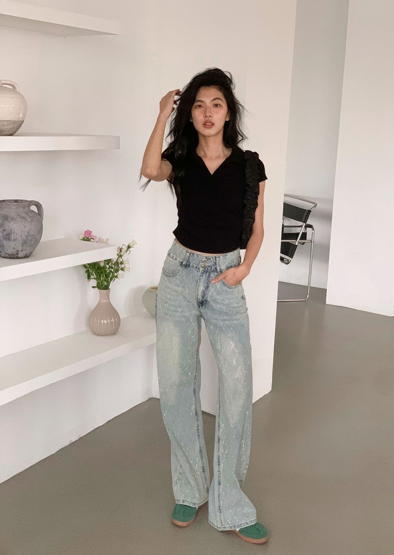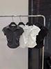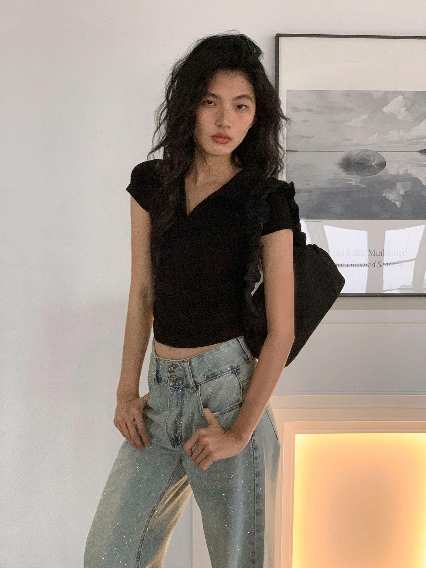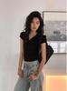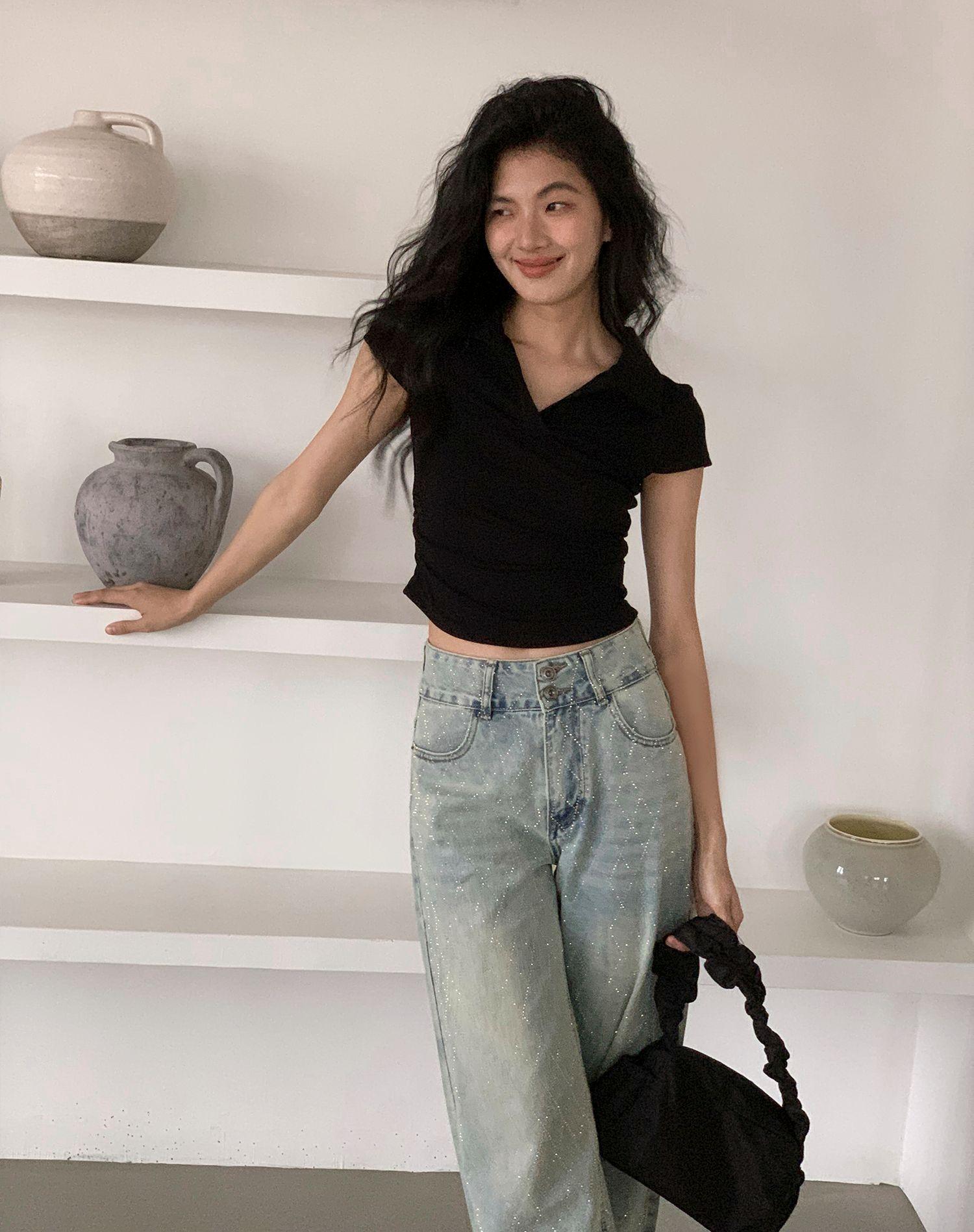 Camiseta de verano para mujer, estilo americano, con cuello en V, manga corta, ajustada, plisada, color gris, con diseño de polo y cintura ajustada.