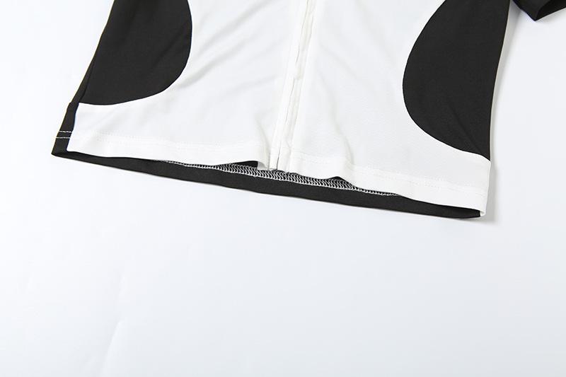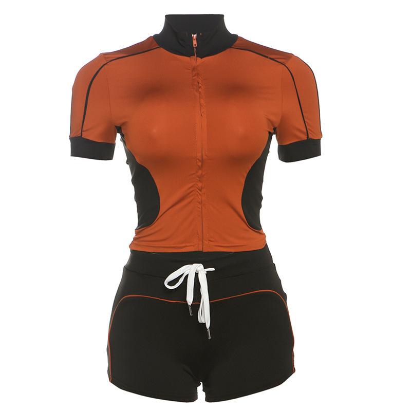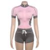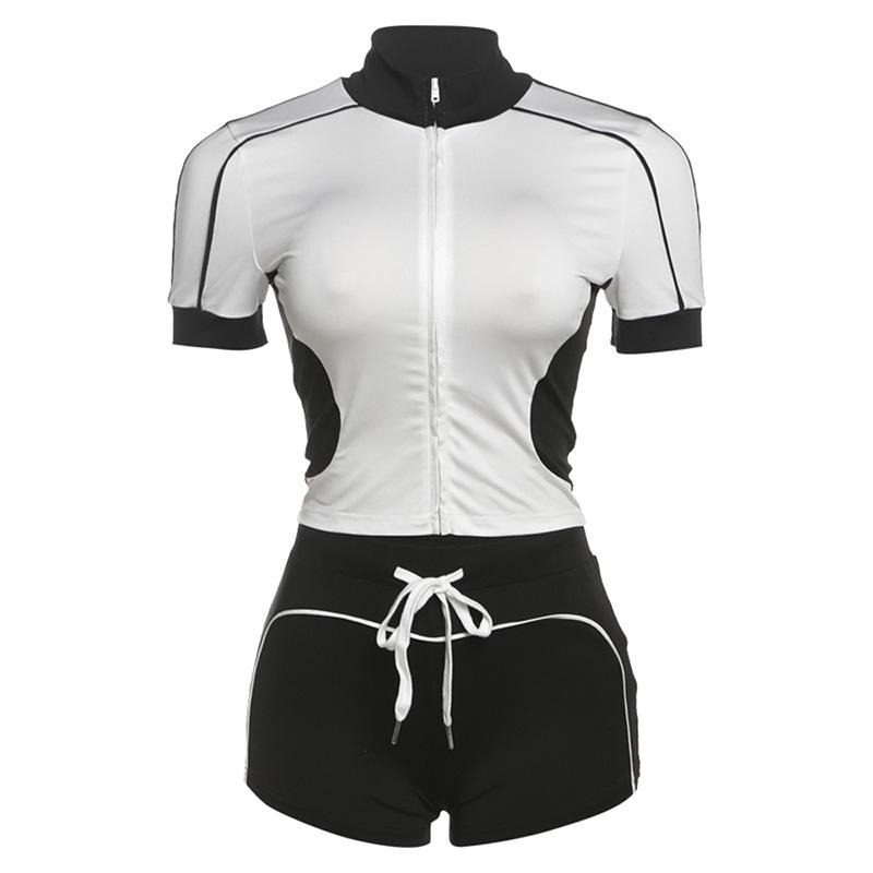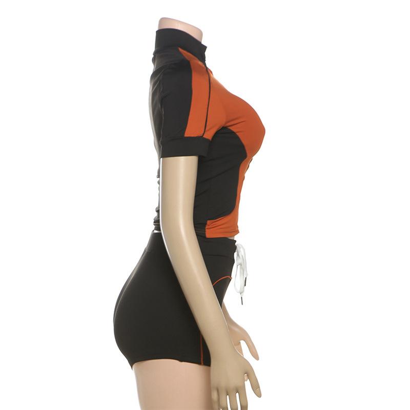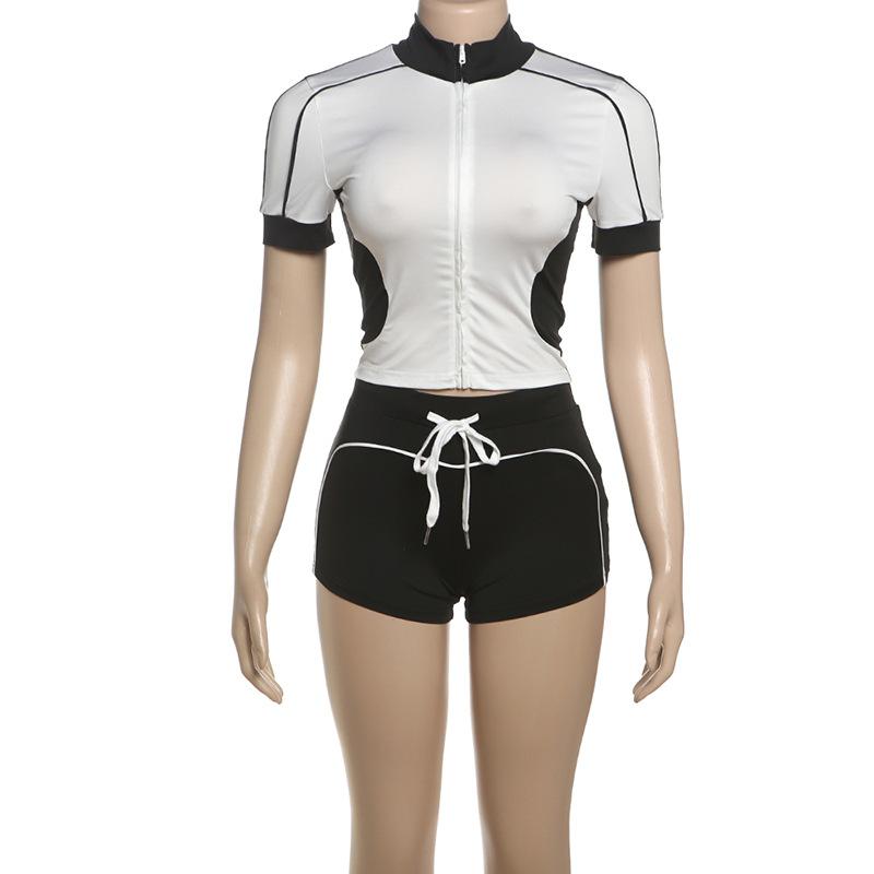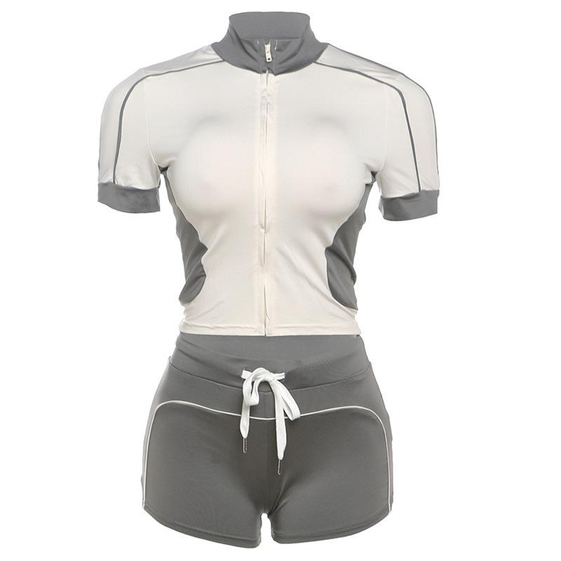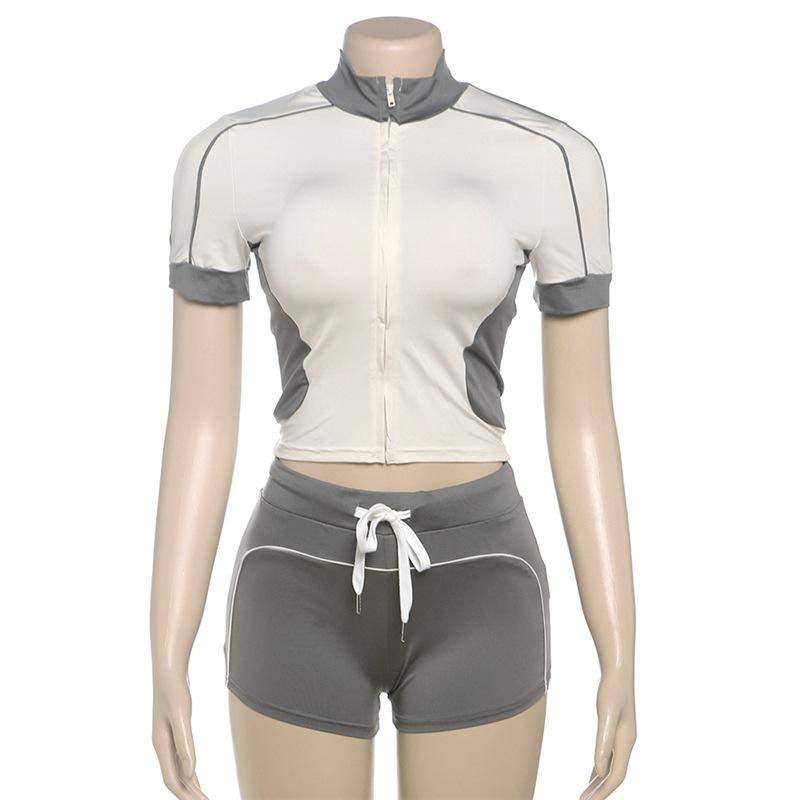 Traje deportivo de verano de moda de estilo europeo y americano transfronterizo 2025 para mujer, con cuello de calle, cremallera, costuras de color en contraste