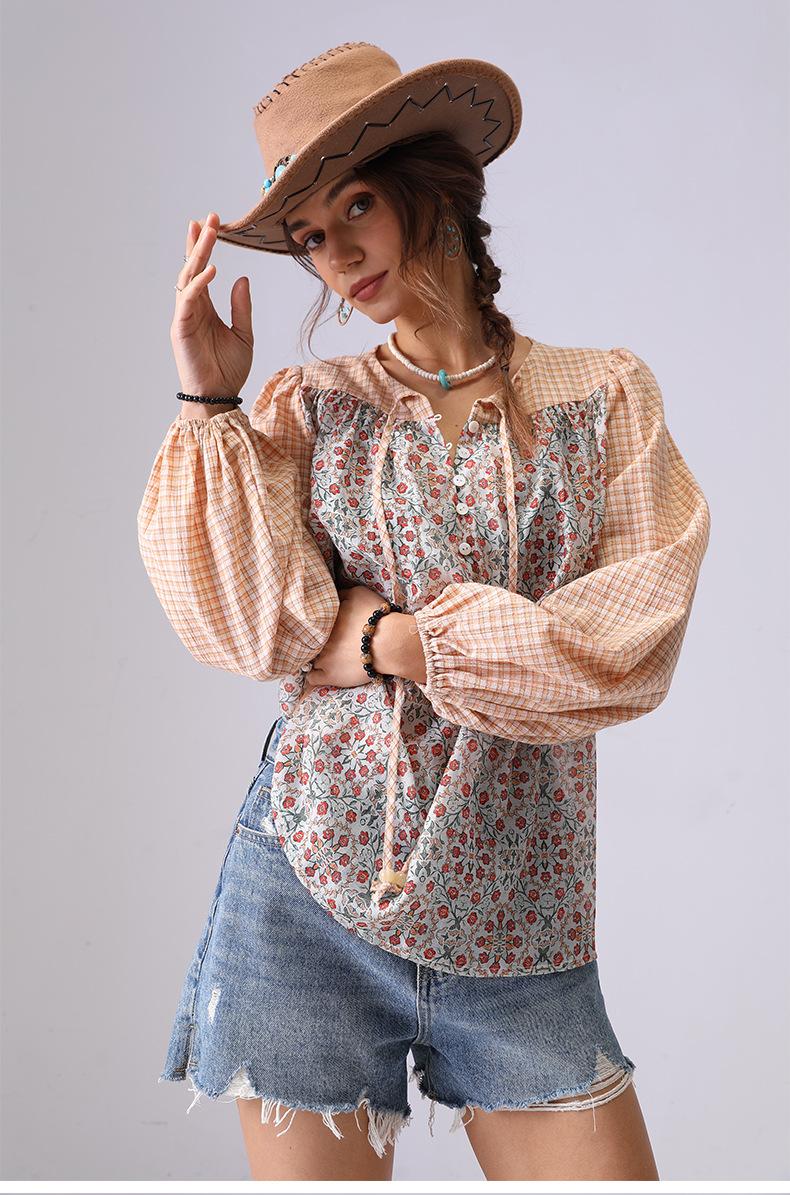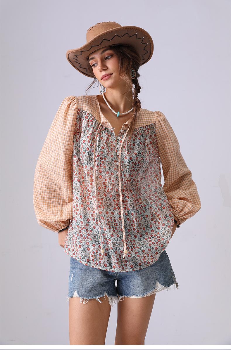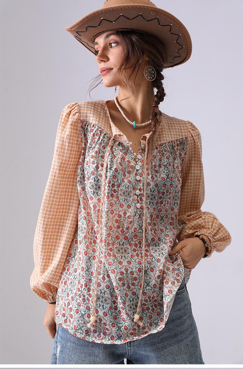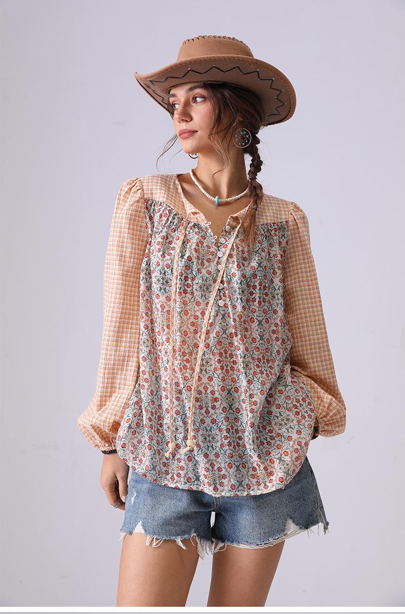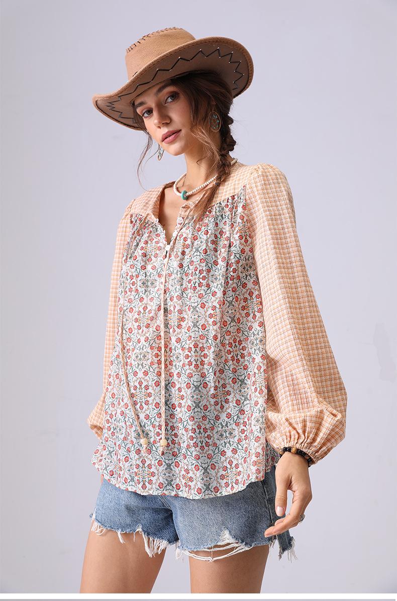 Blusa de mujer IRISERLY con diseño floral de patchwork y nicho francés, de primavera y verano, con cuello en V y cordones, de manga larga.