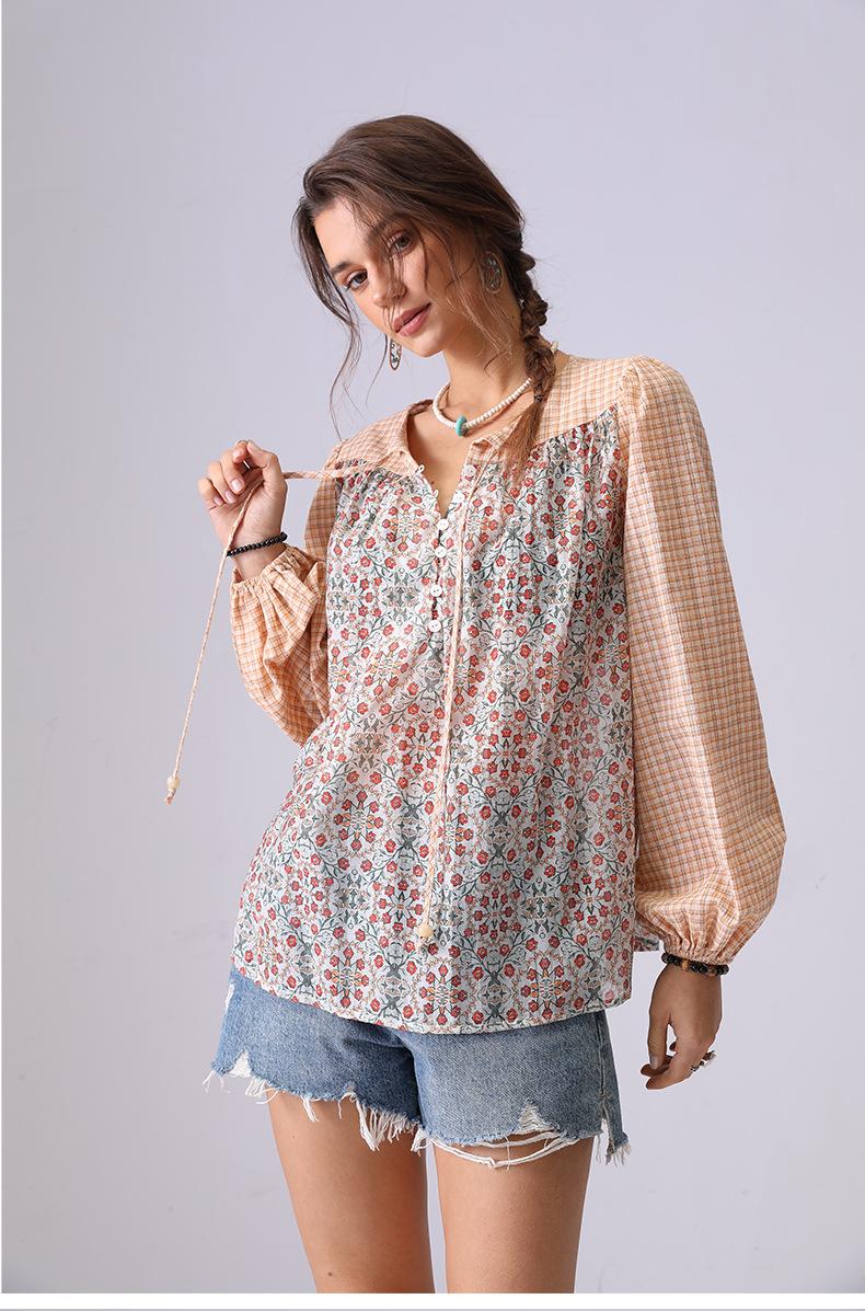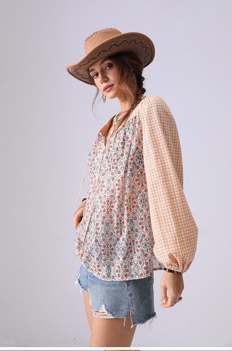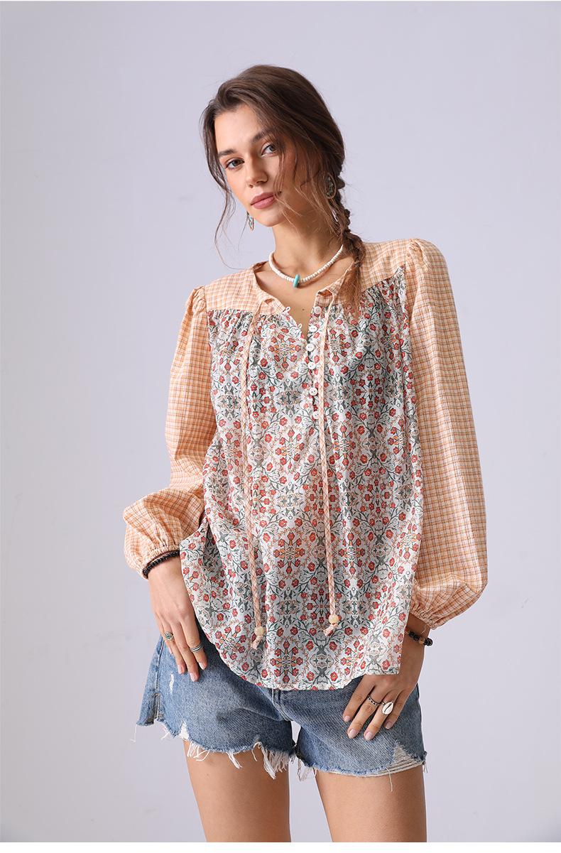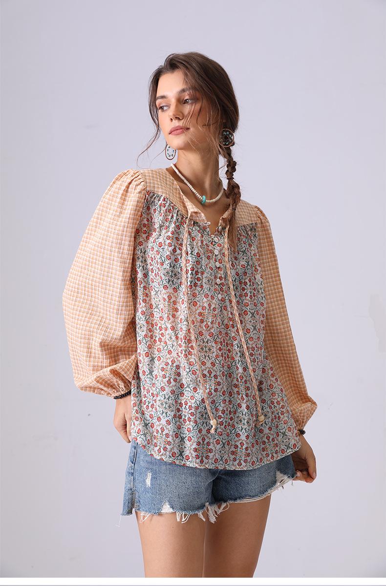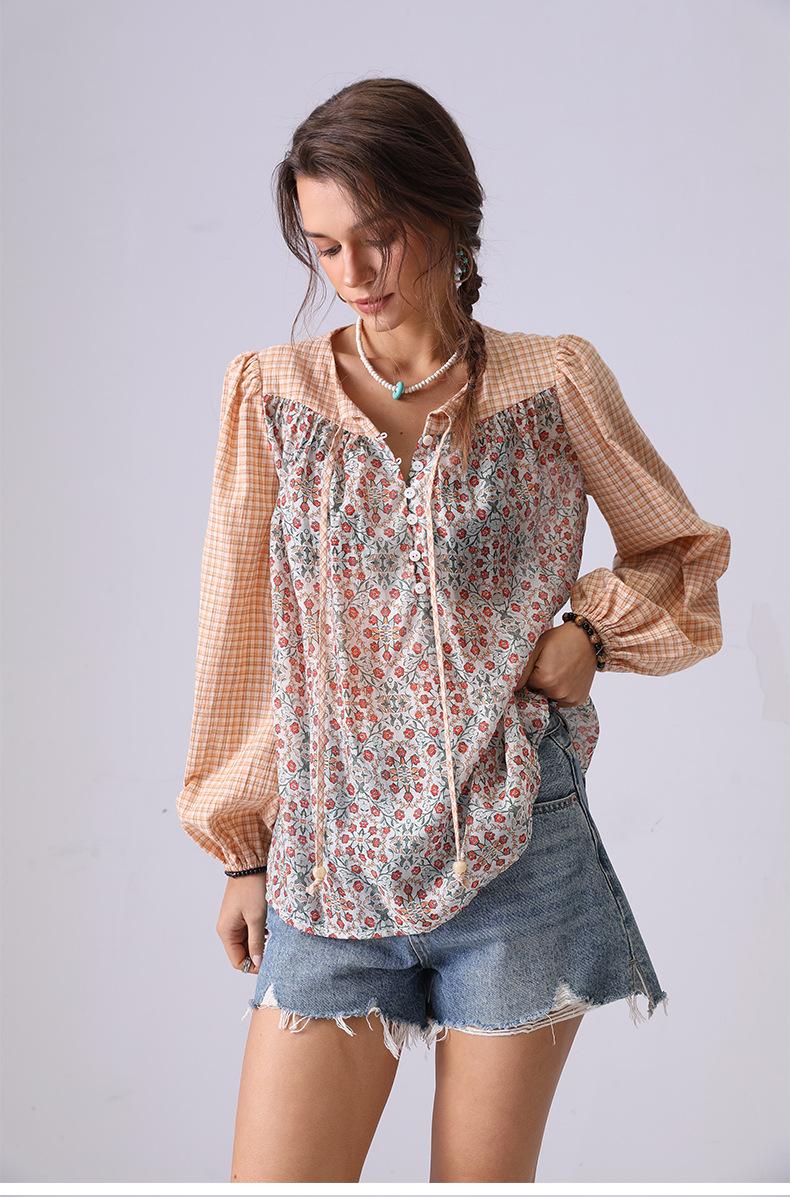 Blusa de mujer IRISERLY con diseño floral de patchwork y nicho francés, de primavera y verano, con cuello en V y cordones, de manga larga.