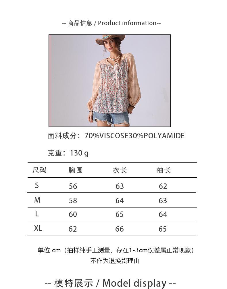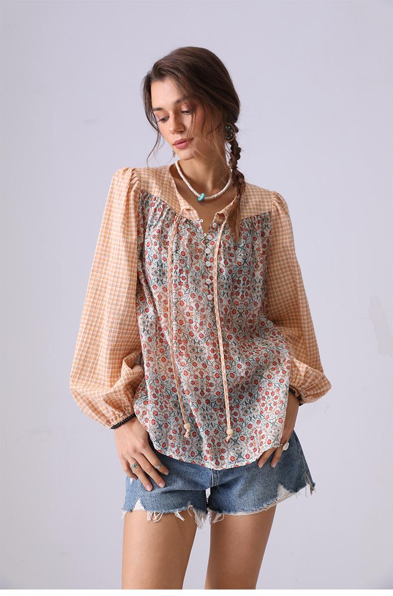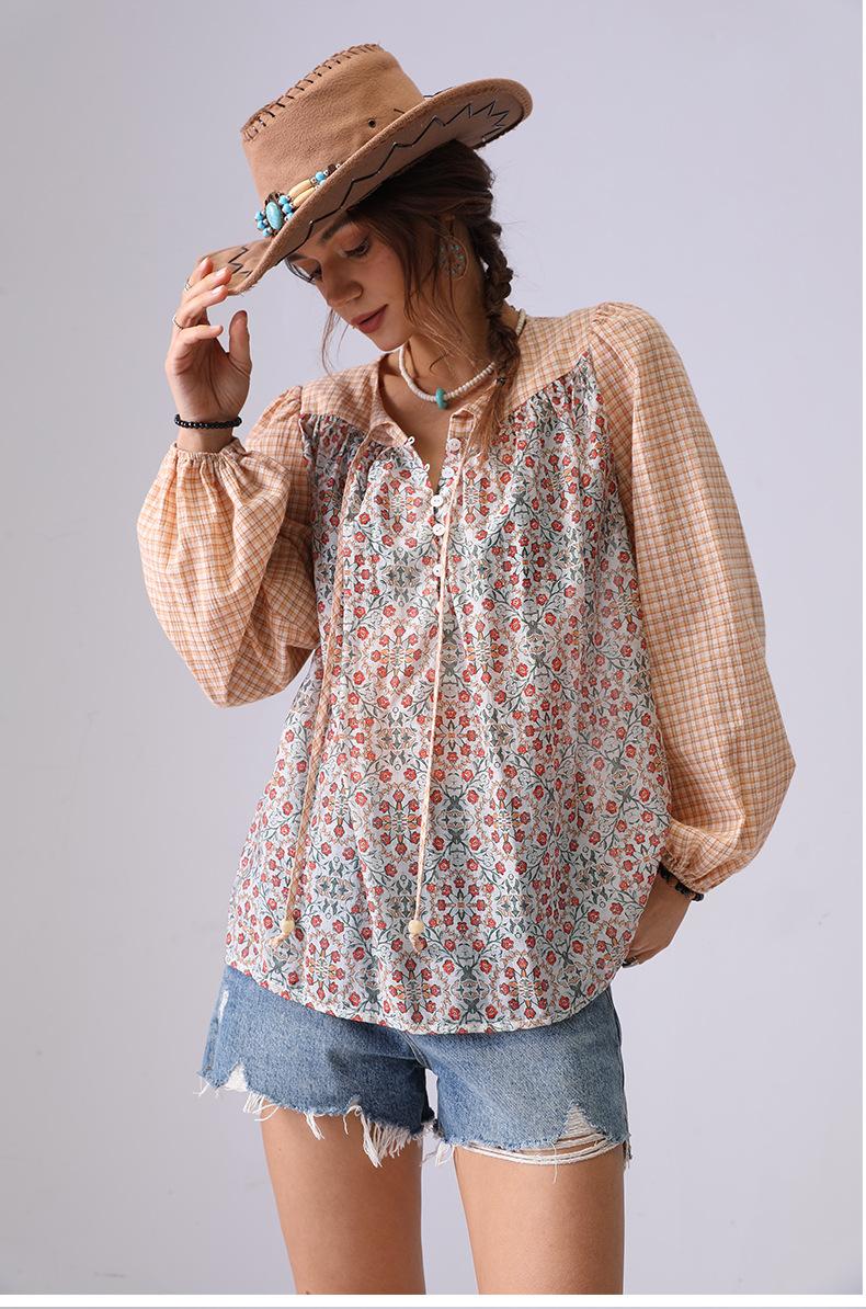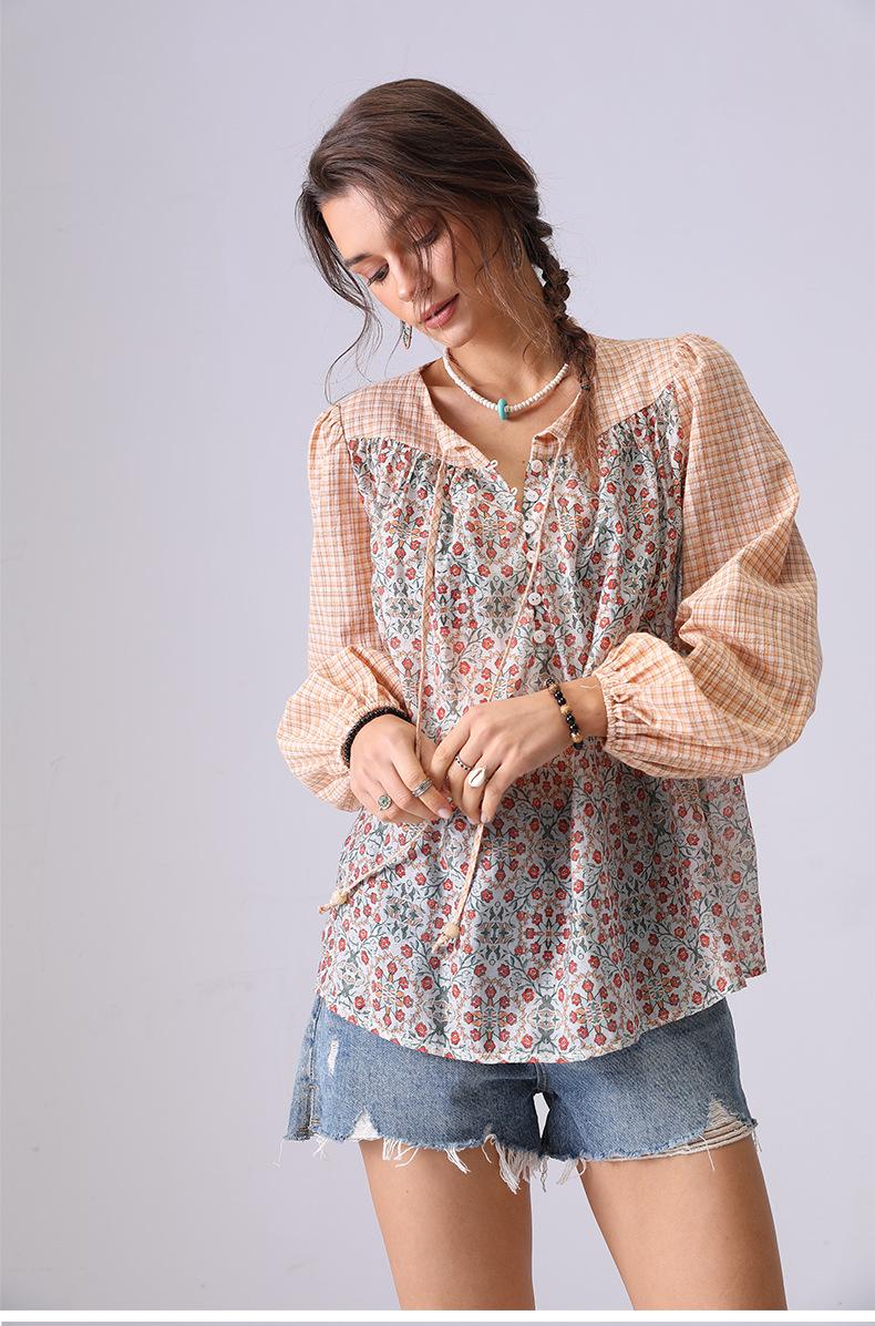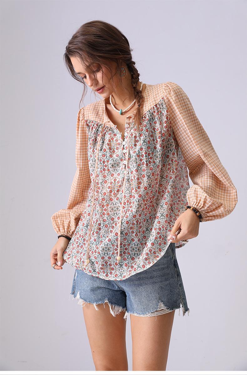 Blusa de mujer IRISERLY con diseño floral de patchwork y nicho francés, de primavera y verano, con cuello en V y cordones, de manga larga.