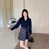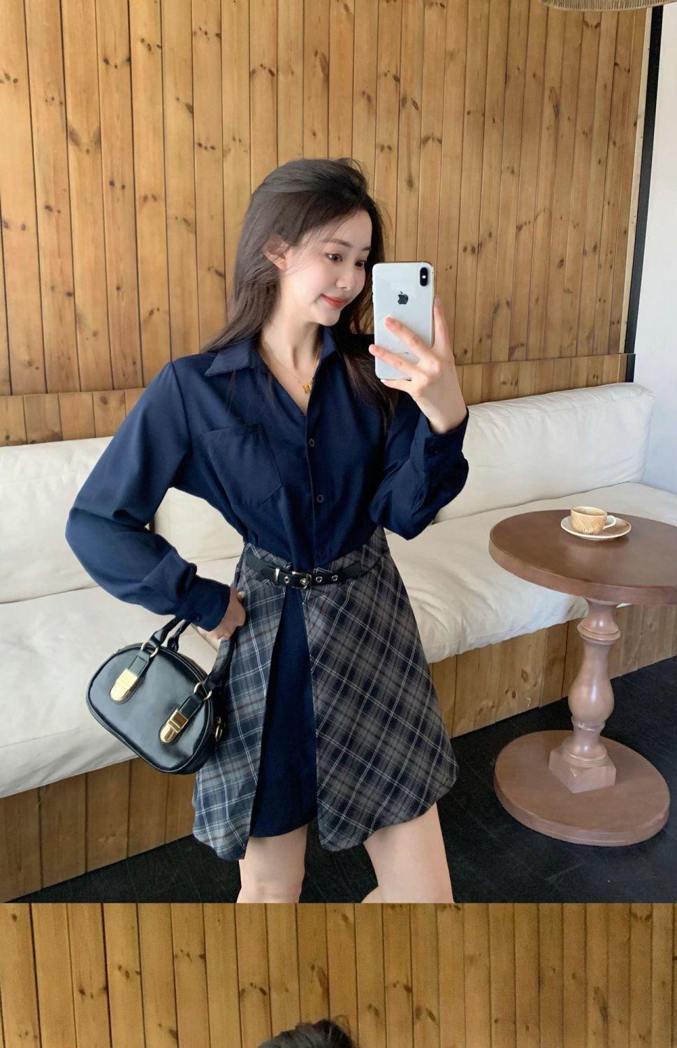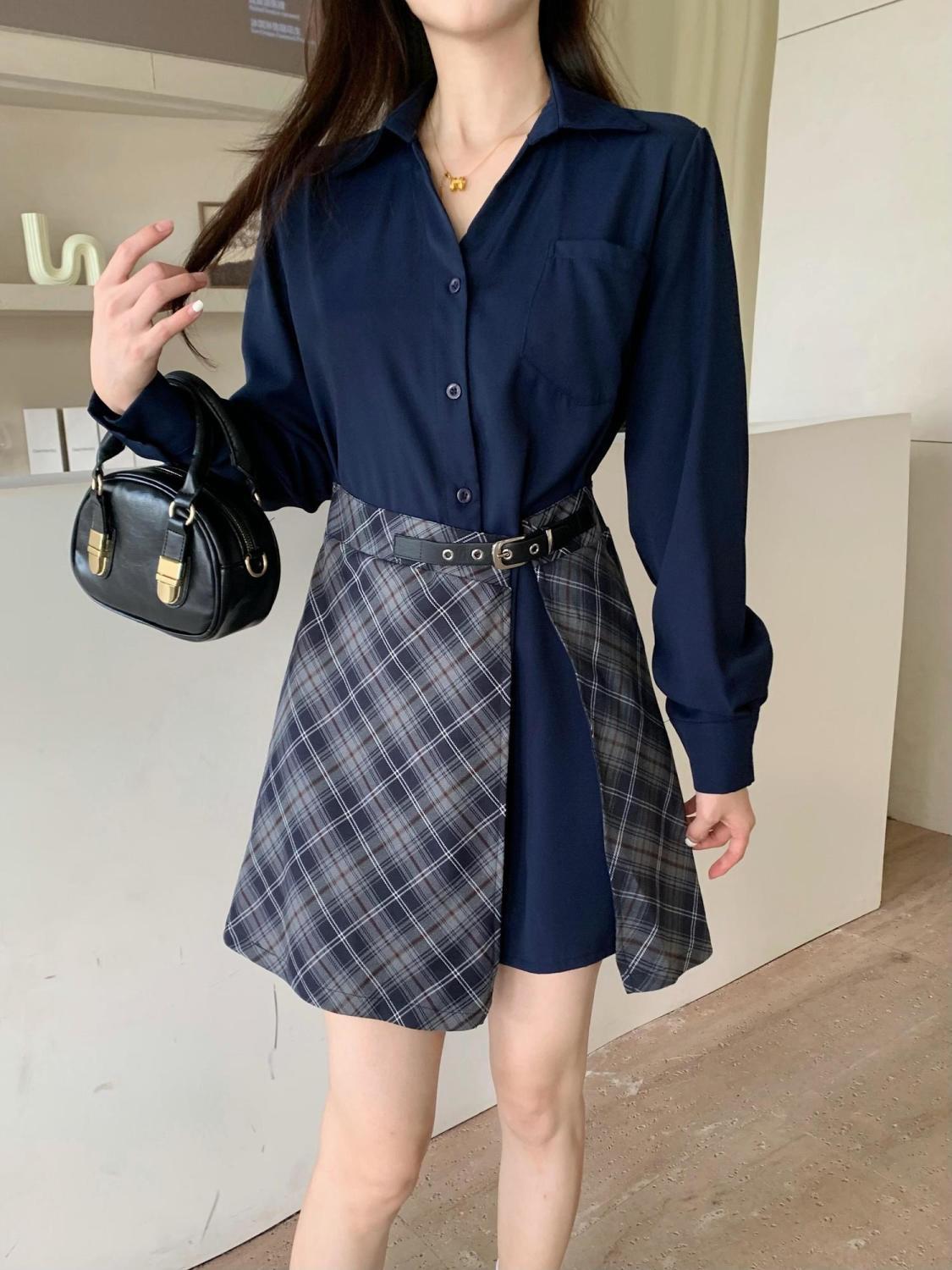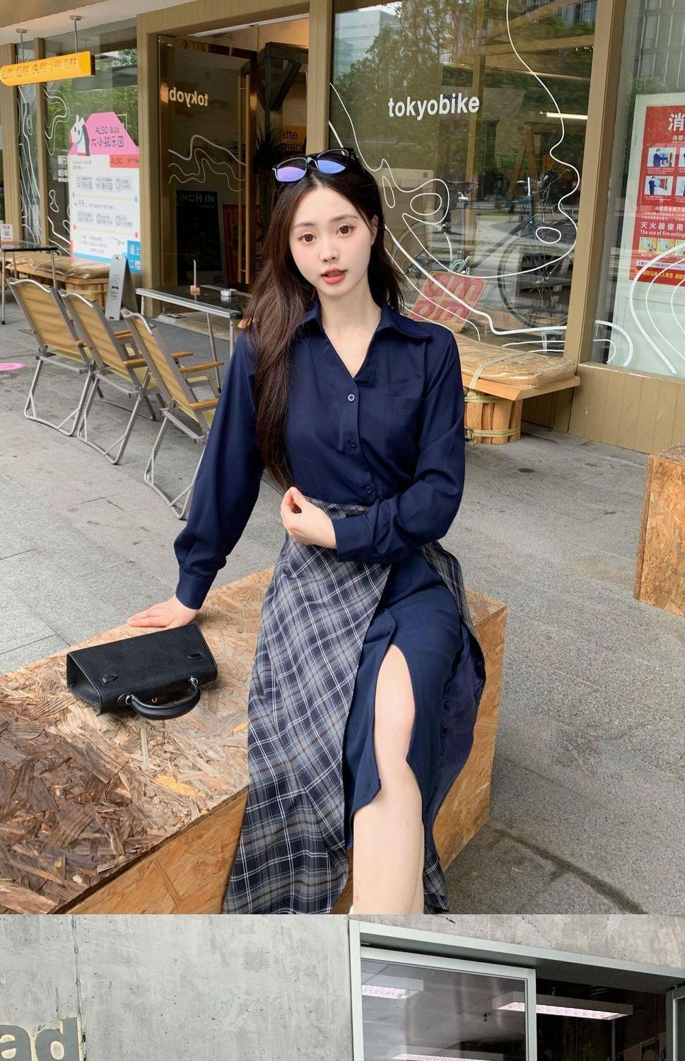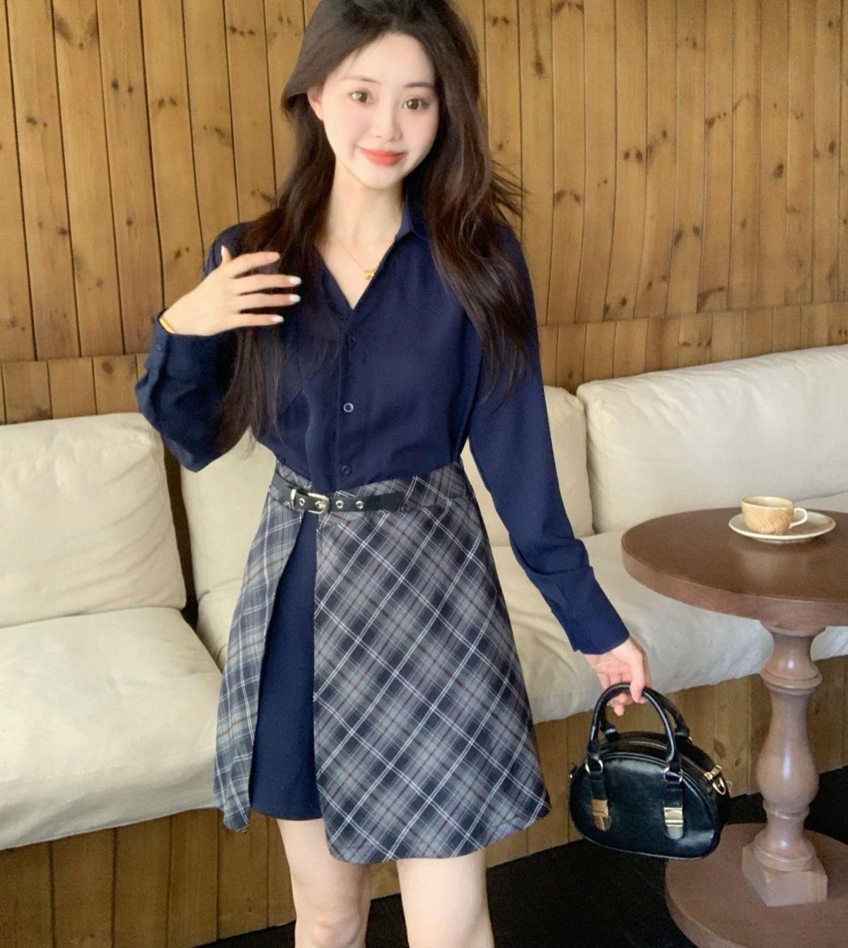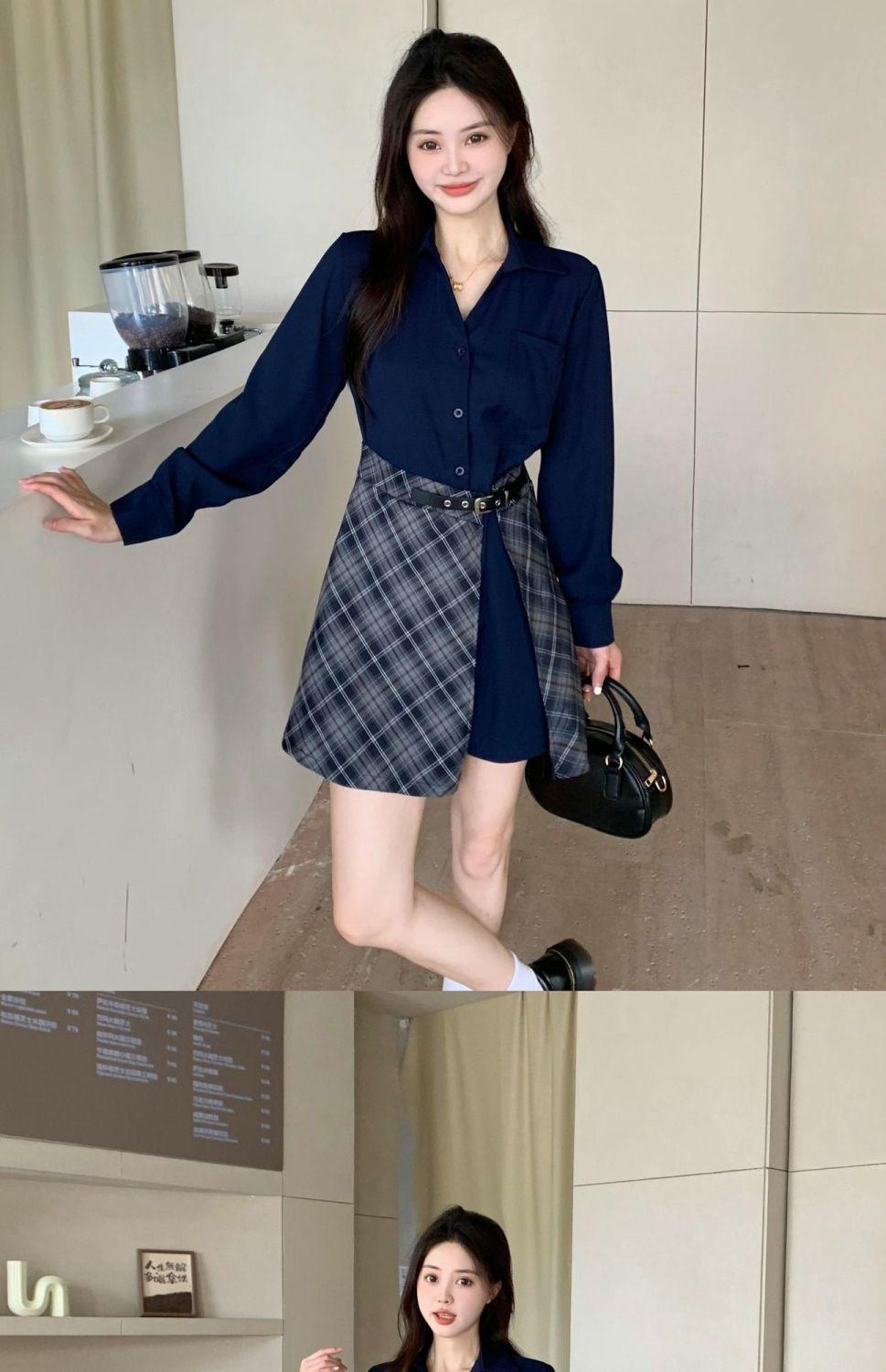 Vestido camisero de dos piezas con diseño de moda y falda corta a cuadros elegante de estilo francés para mujer de principios de primavera