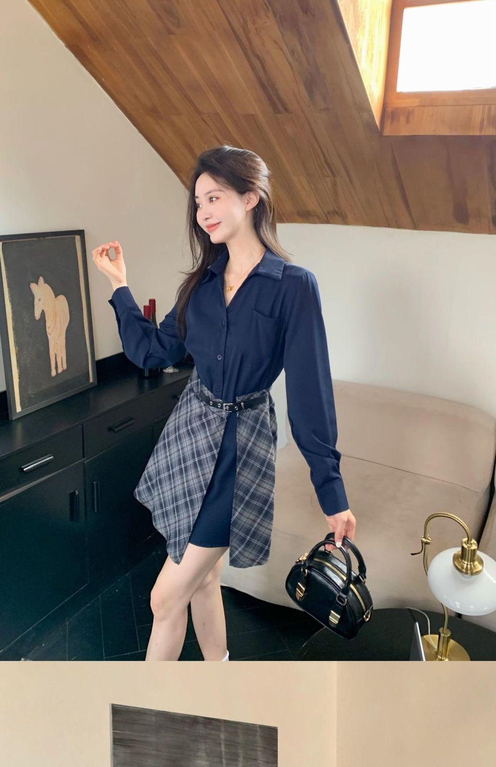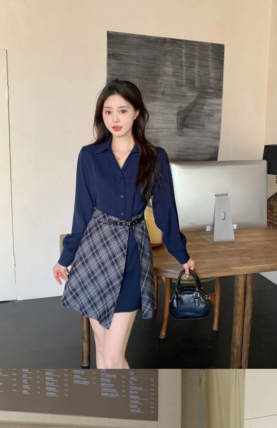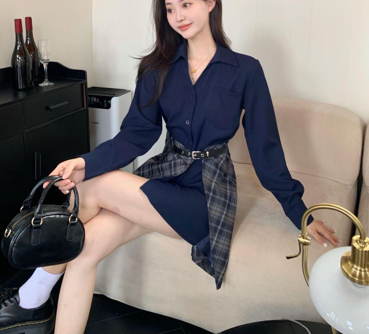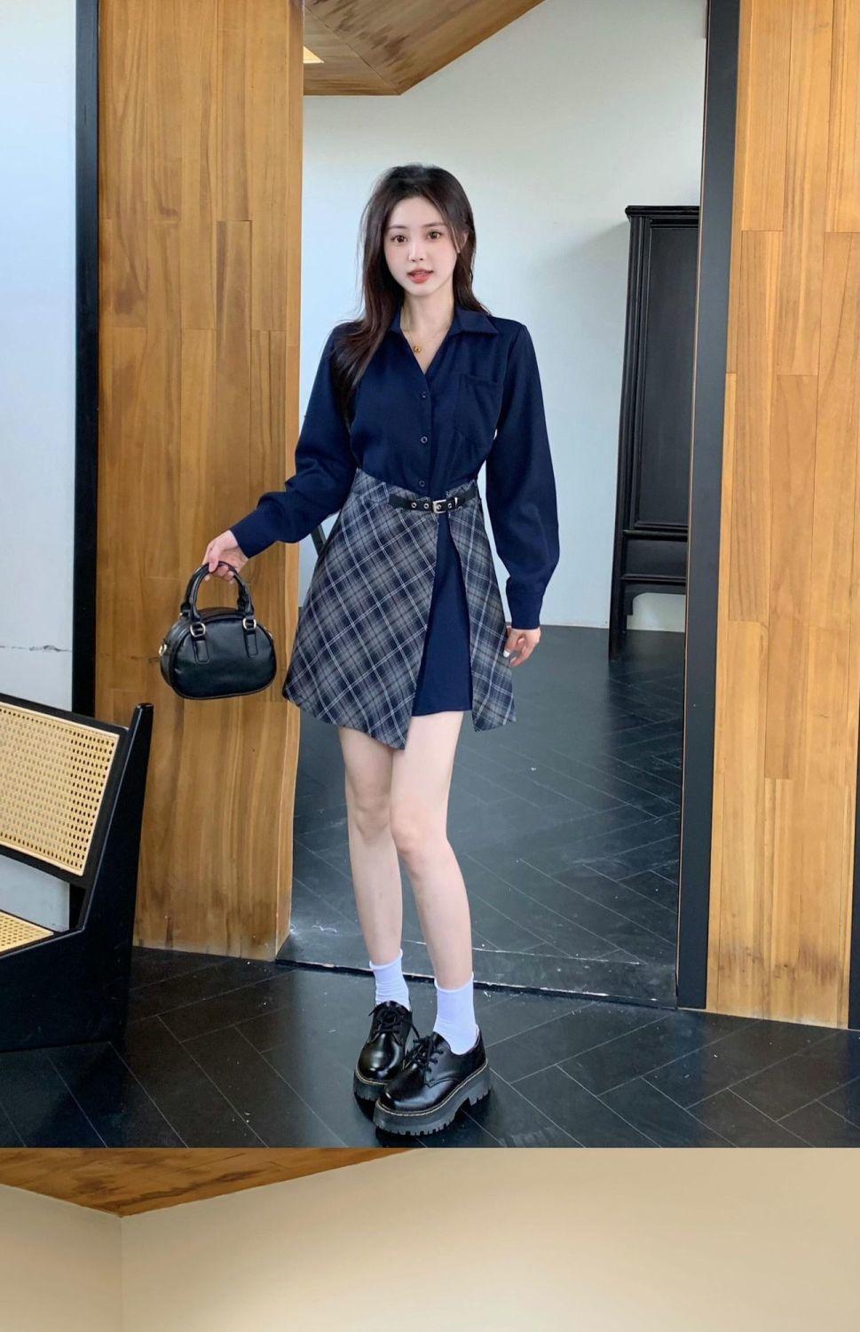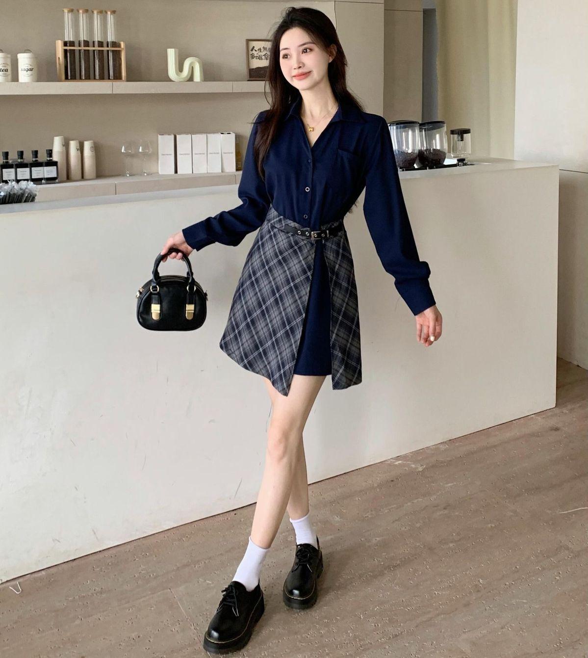 Vestido camisero de dos piezas con diseño de moda y falda corta a cuadros elegante de estilo francés para mujer de principios de primavera
